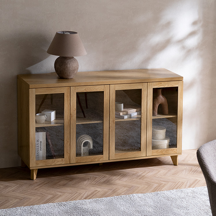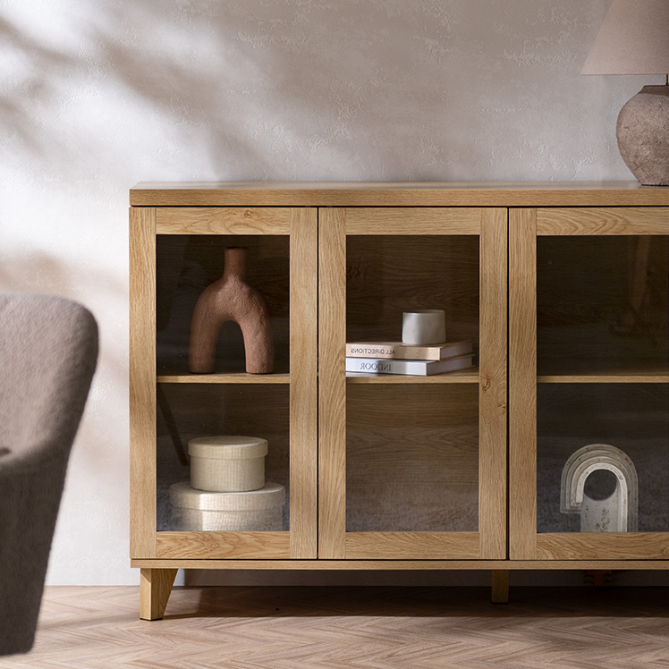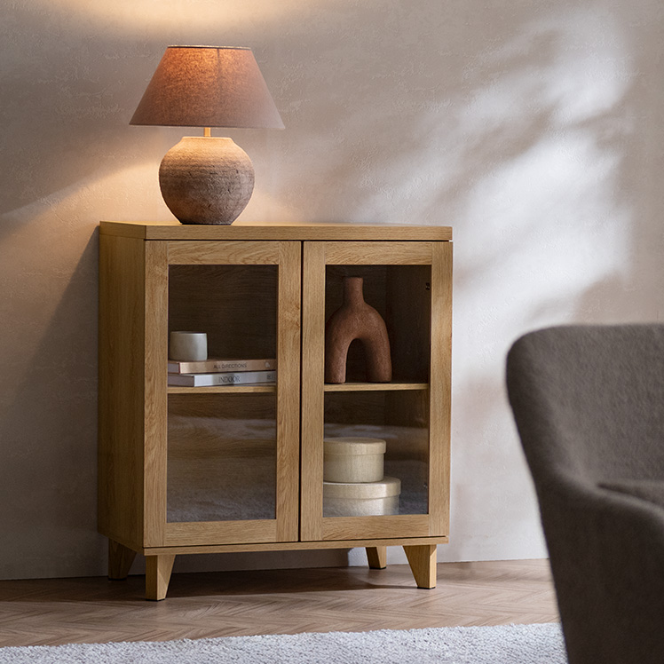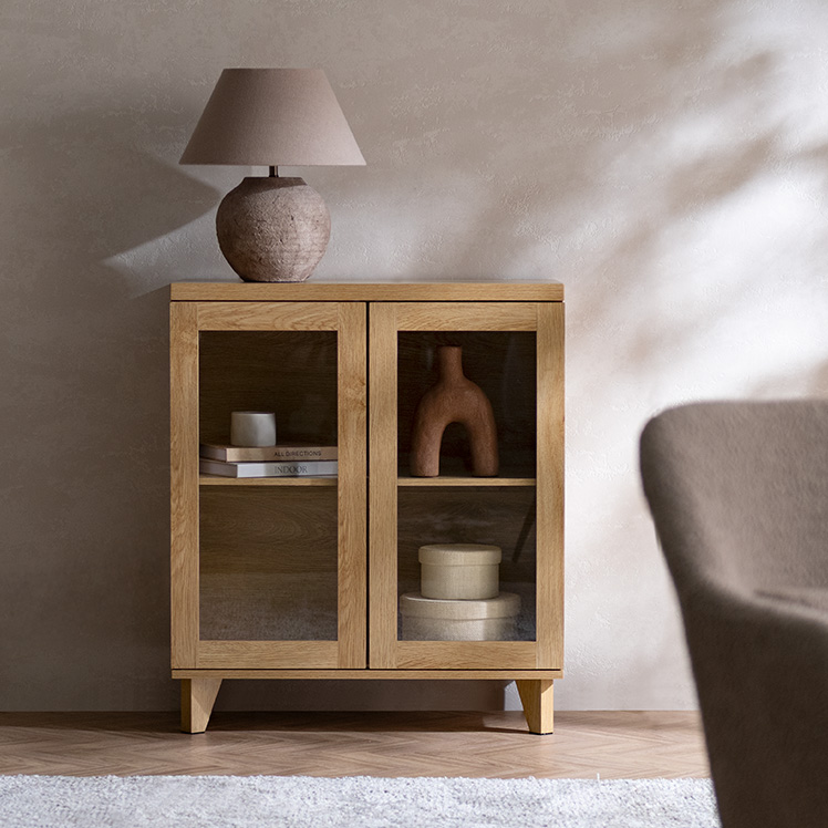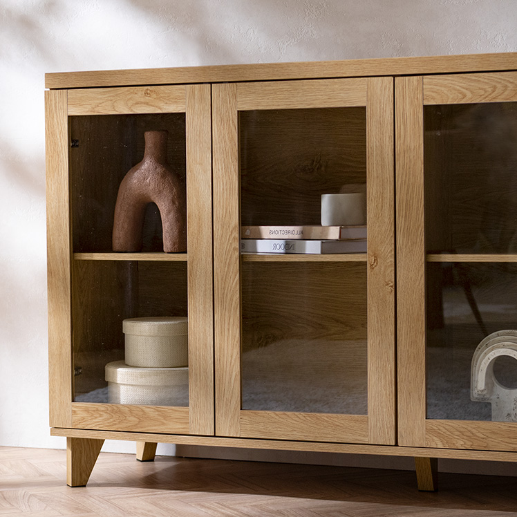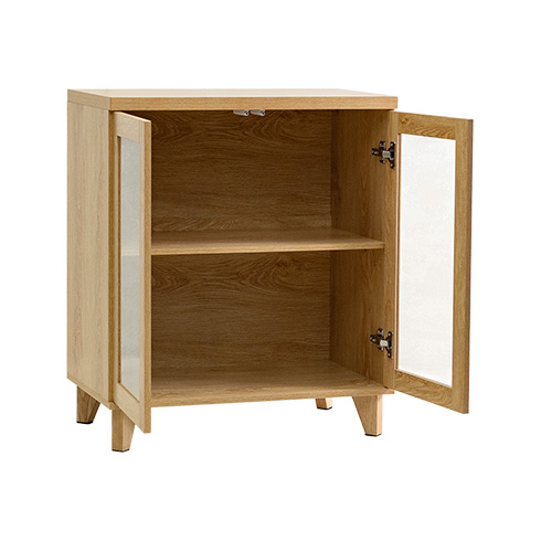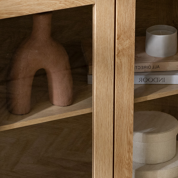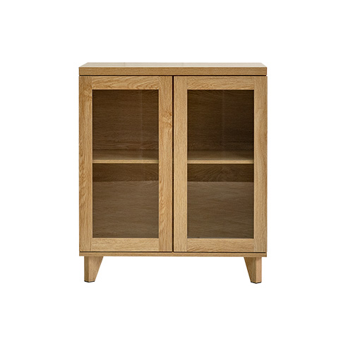 ガラス扉キャビネット Clana〔クラ―ナ〕幅70cmタイプ/魅せて収納できる、ガラス扉キャビネット“Clana(クラーナ)”透明感のあるガラス扉と温かみある木目調が特徴の北欧風デザイン。可動棚で高さ調整ができるので、大きなアイテムもディスプレイしていただけます。