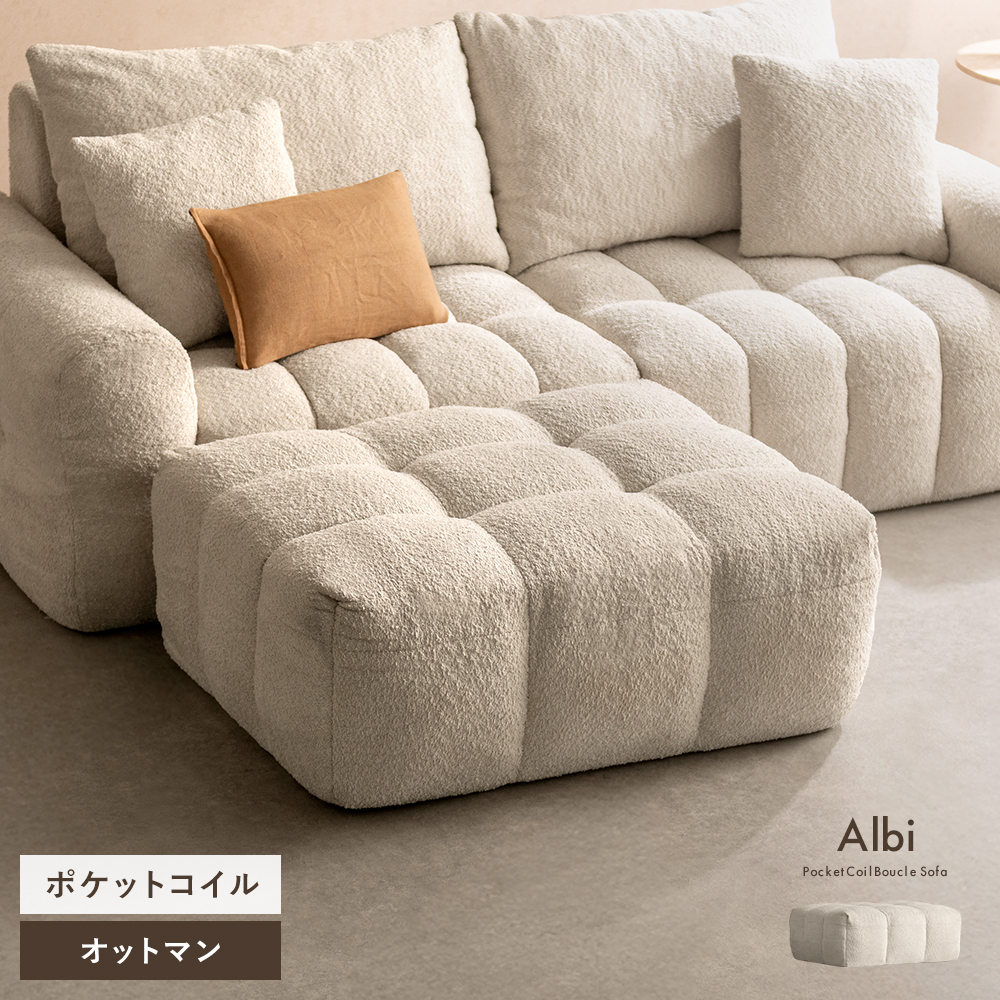 ブークレソファ Albi〔アルビー〕3Pタイプ/ポケットコイルを使用した贅沢な座り心地と可愛いブークレ生地が特徴のソファシリーズ『Albi(アルビー)』。ゆったり座れる座面設計とリラックスできる背もたれクッションでリラックスタイムを快適にお過ごしいただけます。2.5人掛け、3人掛け、オットマンの3タイプから組み合わせたり、お部屋の広さやお好みでお選びいただけます。
