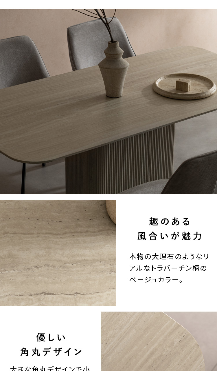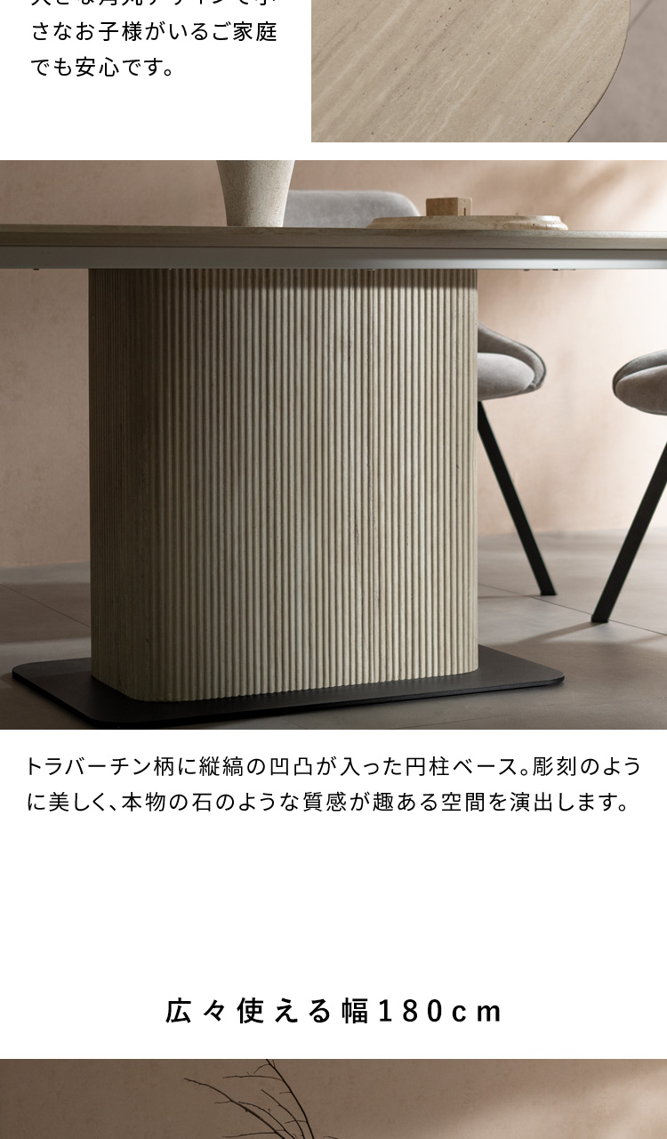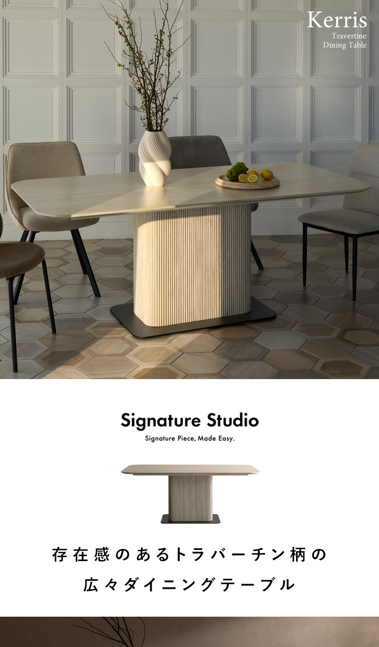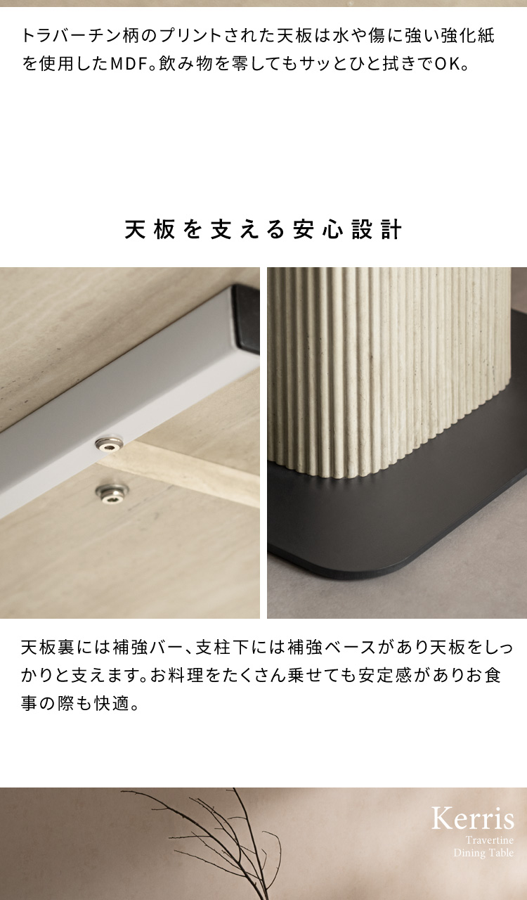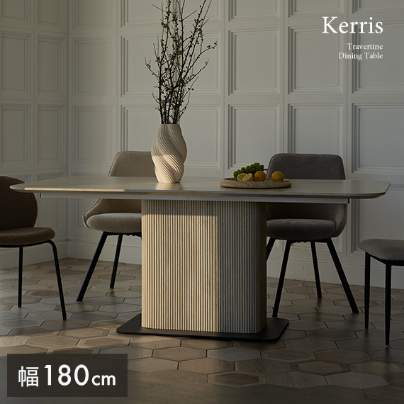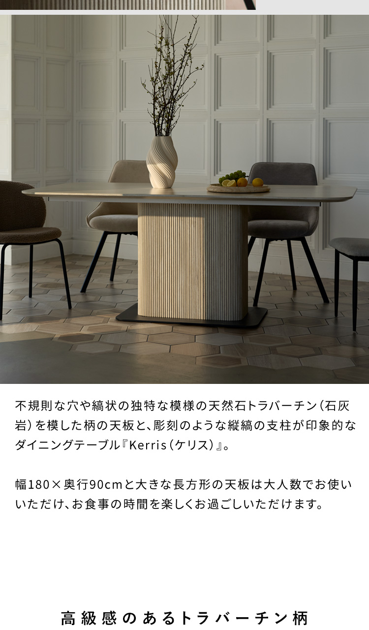 180cm幅 トラバーチン柄ダイニングテーブル Kerris〔ケリス〕/不規則な穴や縞状の独特な模様の天然石トラバーチン(石灰岩)を模した柄の天板と、彫刻のような縦縞の支柱が印象的なダイニングテーブル『Kerris(ケリス)』。幅180×奥行90cmと大きな長方形の天板は大人数でお使いいただけ、お食事の時間を楽しくお過ごしいただけます。