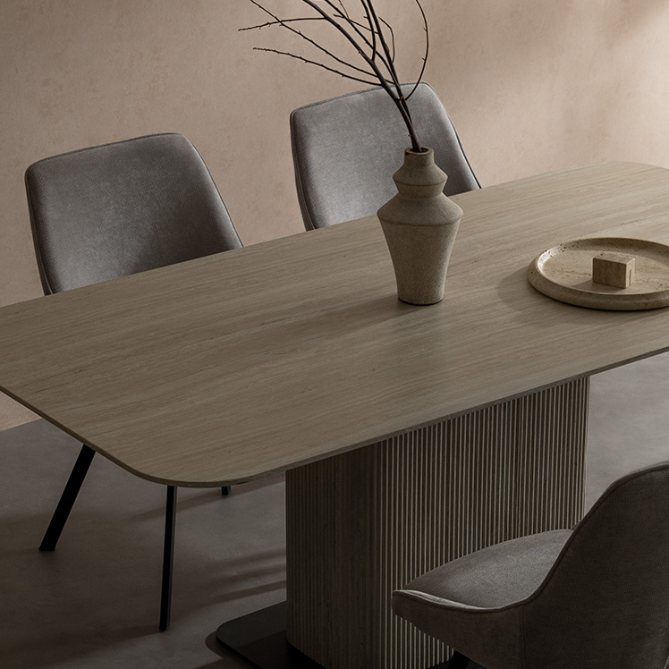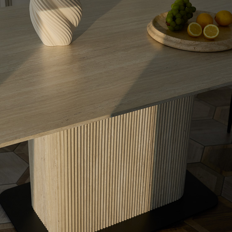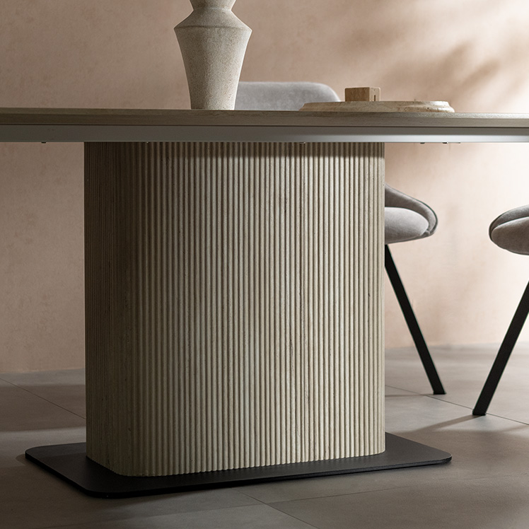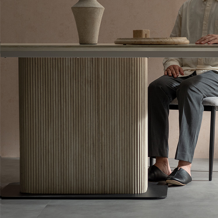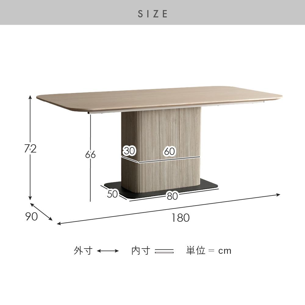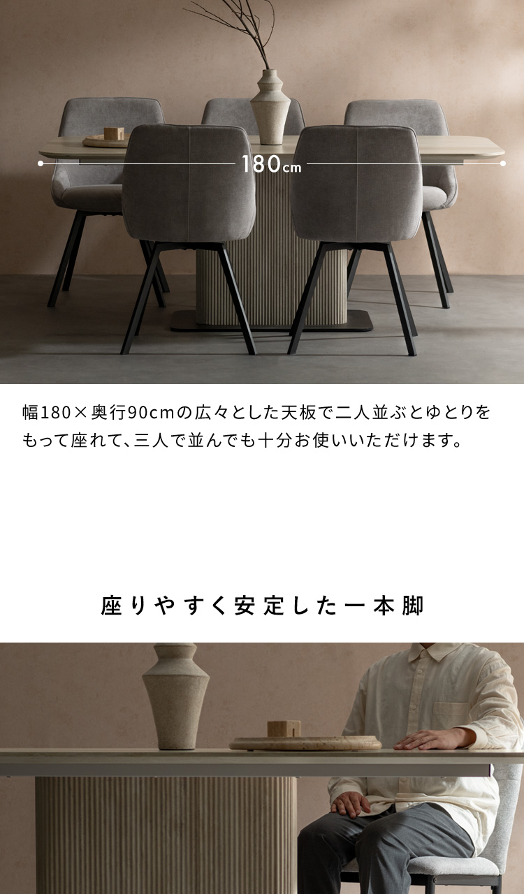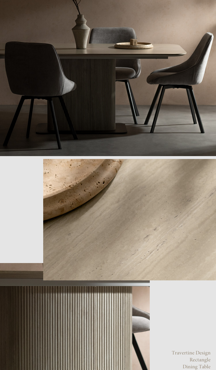 180cm幅 トラバーチン柄ダイニングテーブル Kerris〔ケリス〕/不規則な穴や縞状の独特な模様の天然石トラバーチン(石灰岩)を模した柄の天板と、彫刻のような縦縞の支柱が印象的なダイニングテーブル『Kerris(ケリス)』。幅180×奥行90cmと大きな長方形の天板は大人数でお使いいただけ、お食事の時間を楽しくお過ごしいただけます。