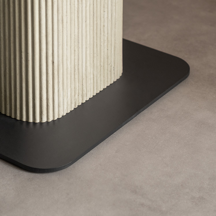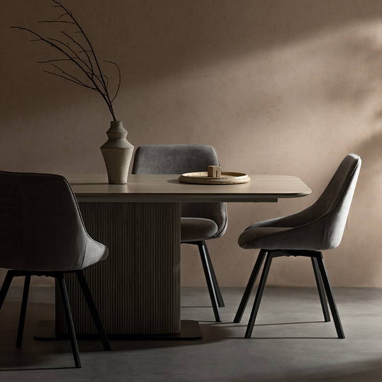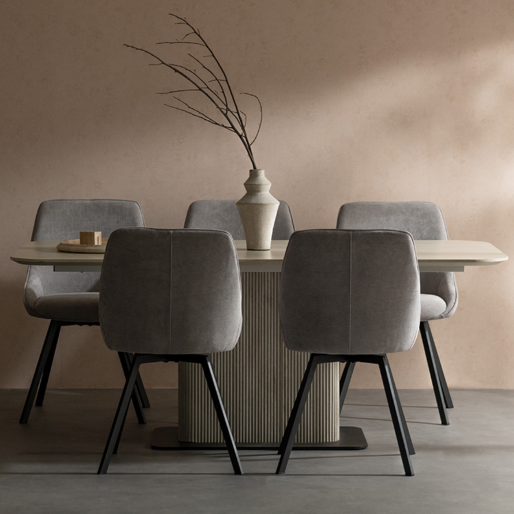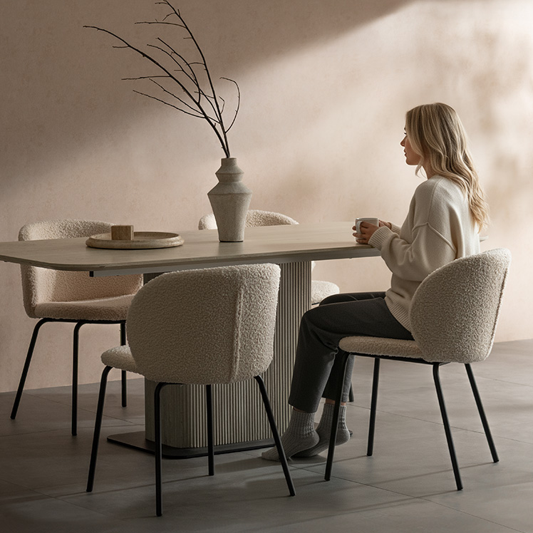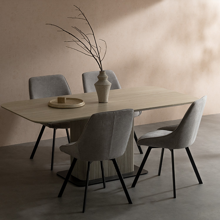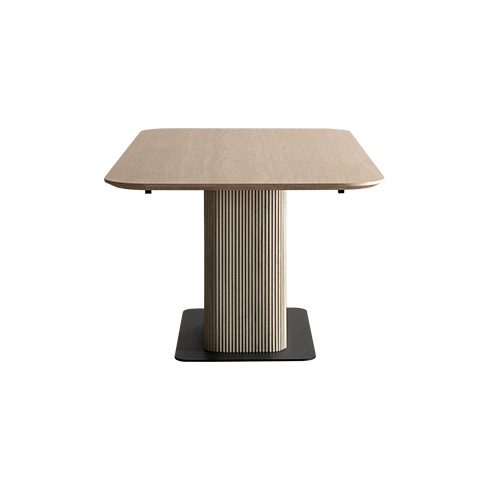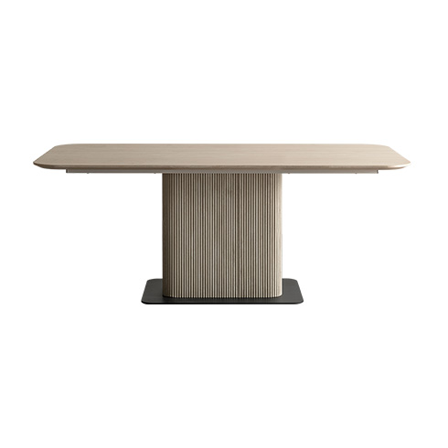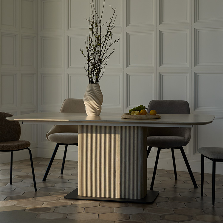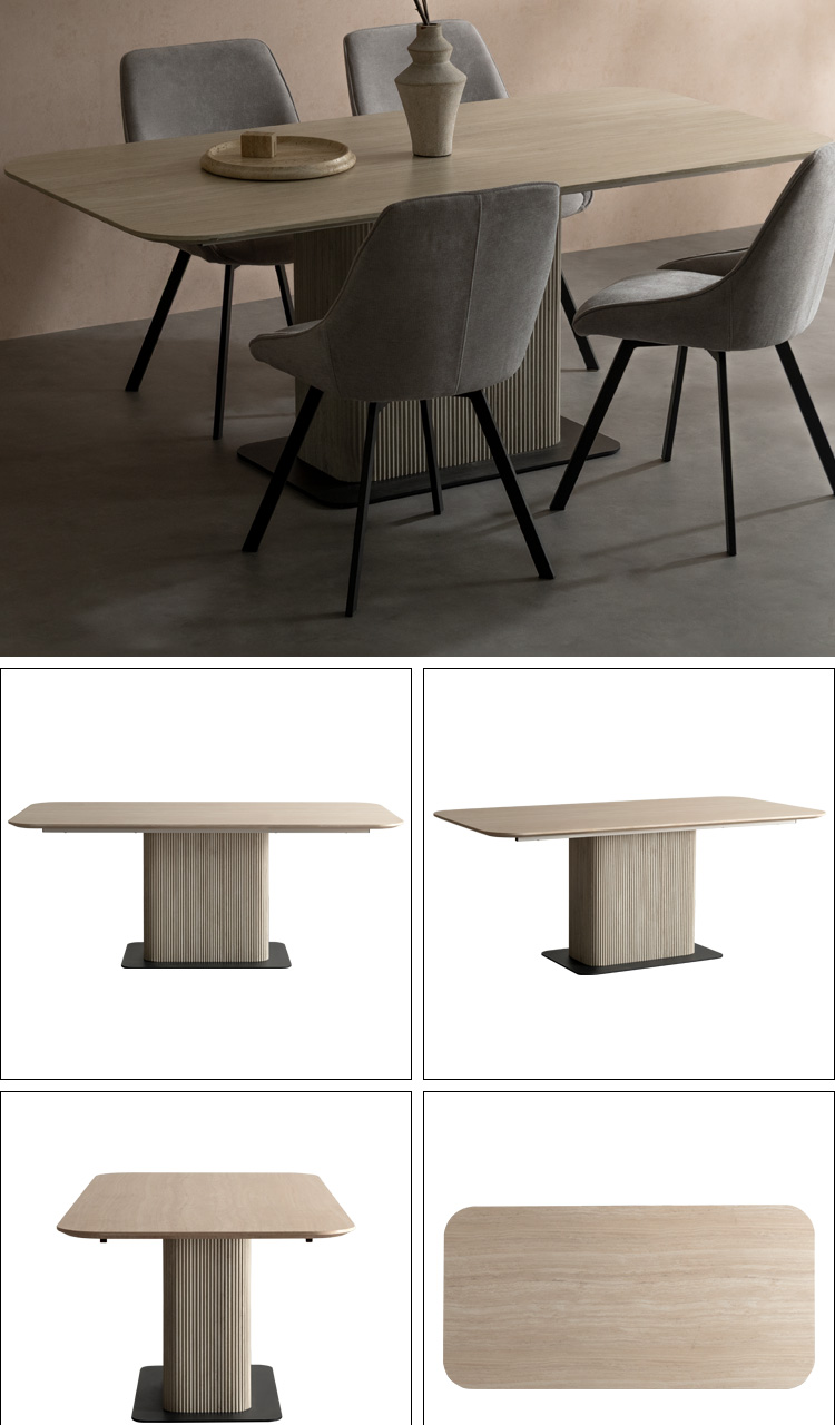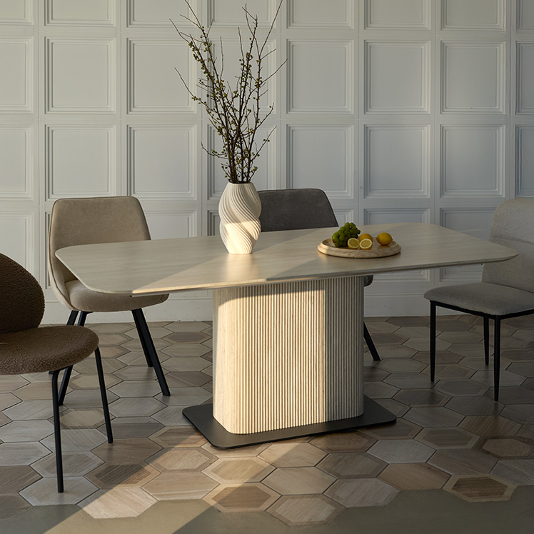 180cm幅 トラバーチン柄ダイニングテーブル Kerris〔ケリス〕/不規則な穴や縞状の独特な模様の天然石トラバーチン(石灰岩)を模した柄の天板と、彫刻のような縦縞の支柱が印象的なダイニングテーブル『Kerris(ケリス)』。幅180×奥行90cmと大きな長方形の天板は大人数でお使いいただけ、お食事の時間を楽しくお過ごしいただけます。