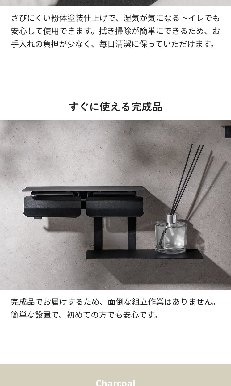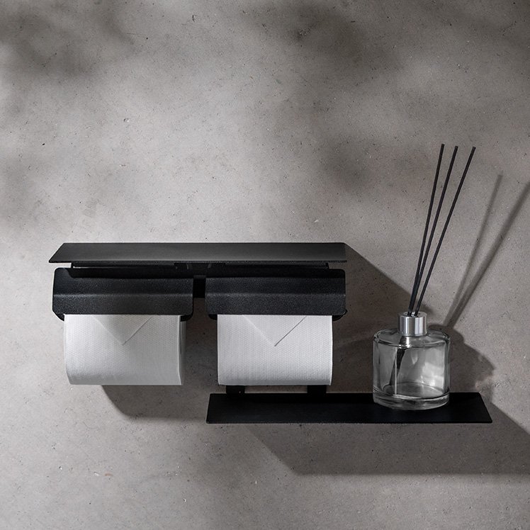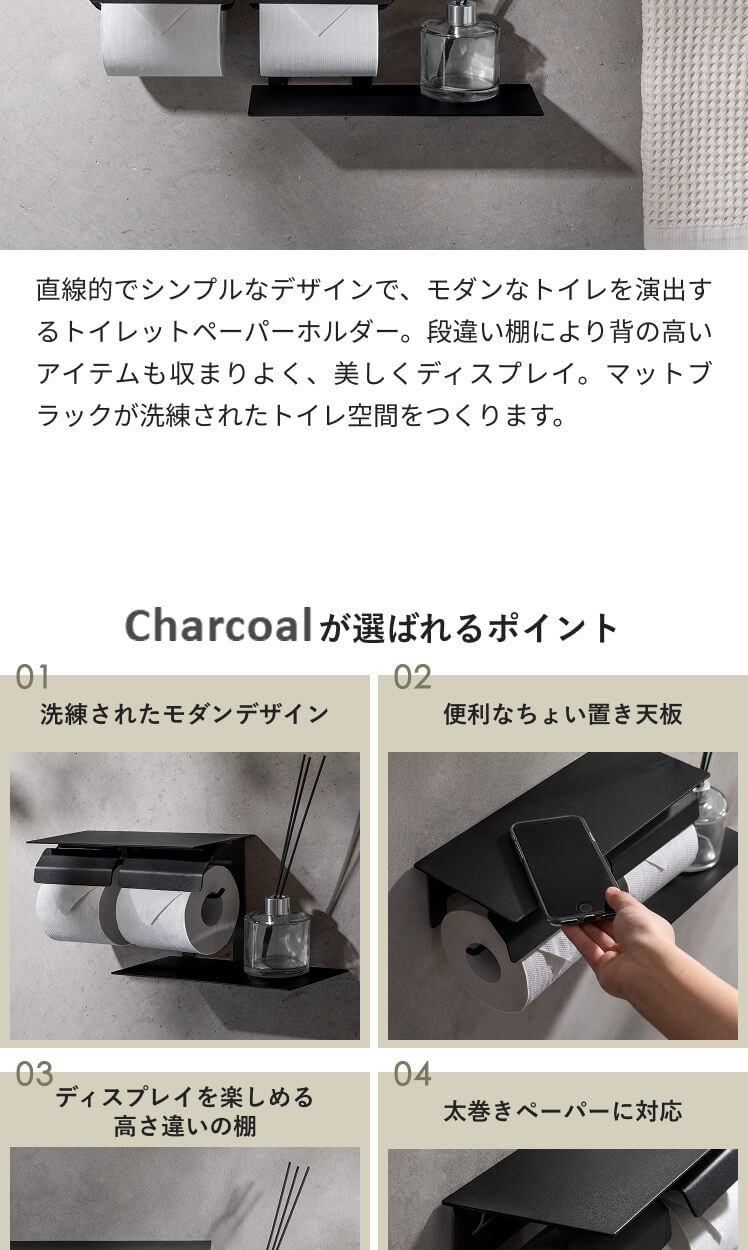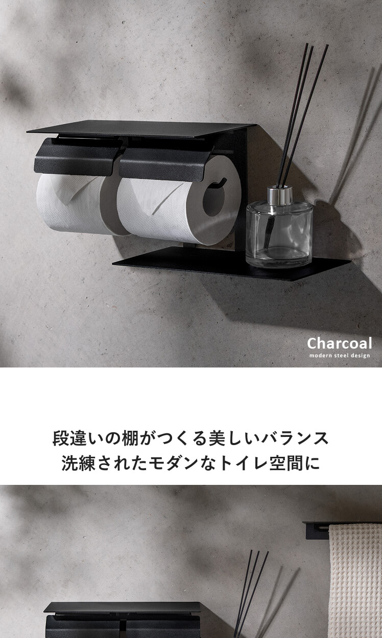 棚付きトイレットペーパーホルダー Charcoal〔チャコール〕/直線的でシンプルなデザインで、モダンなトイレを演出するトイレットペーパーホルダー。段違い棚により背の高いアイテムも収まりよく、美しくディスプレイ。マットブラックが洗練されたトイレ空間をつくります。