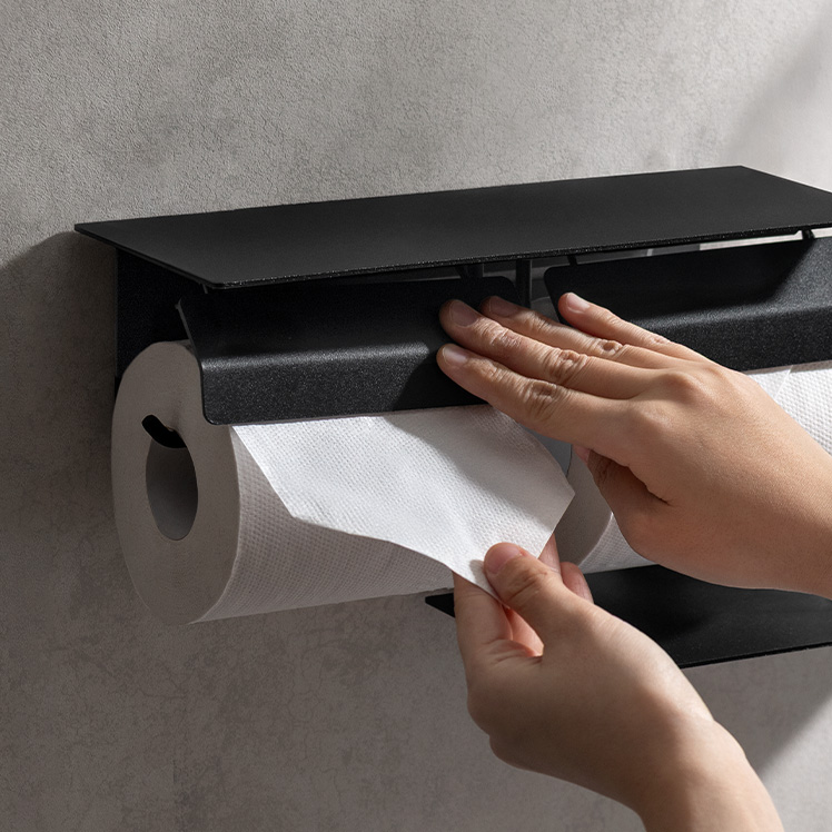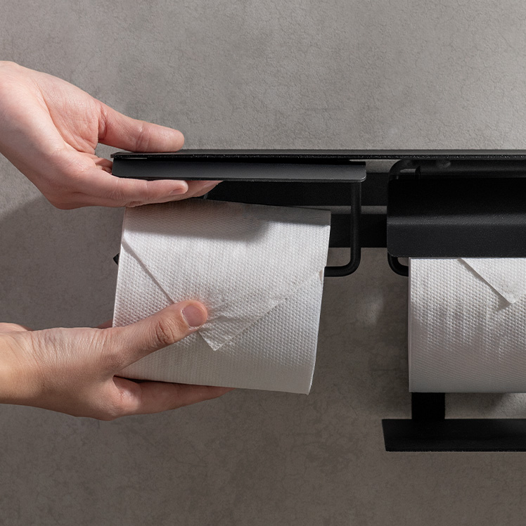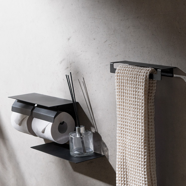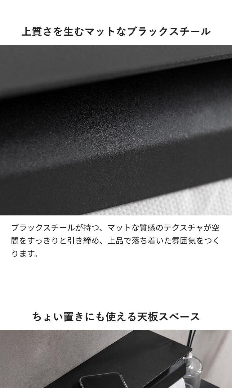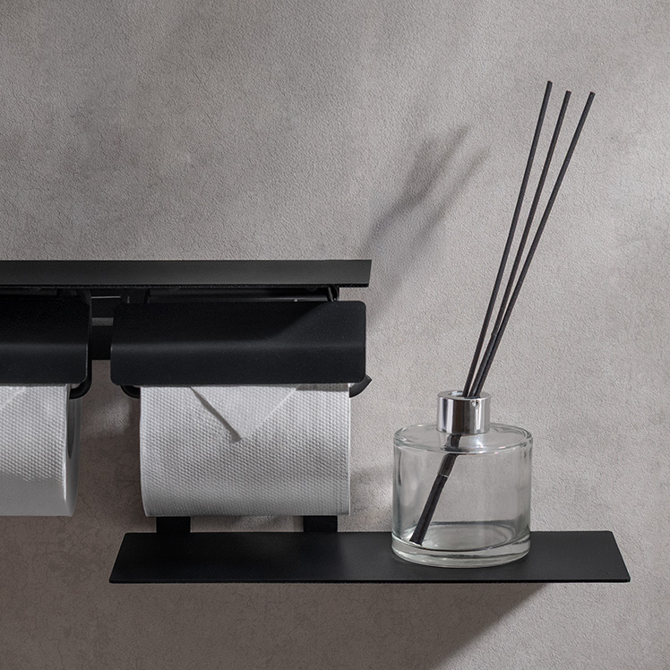 棚付きトイレットペーパーホルダー Charcoal〔チャコール〕/直線的でシンプルなデザインで、モダンなトイレを演出するトイレットペーパーホルダー。段違い棚により背の高いアイテムも収まりよく、美しくディスプレイ。マットブラックが洗練されたトイレ空間をつくります。