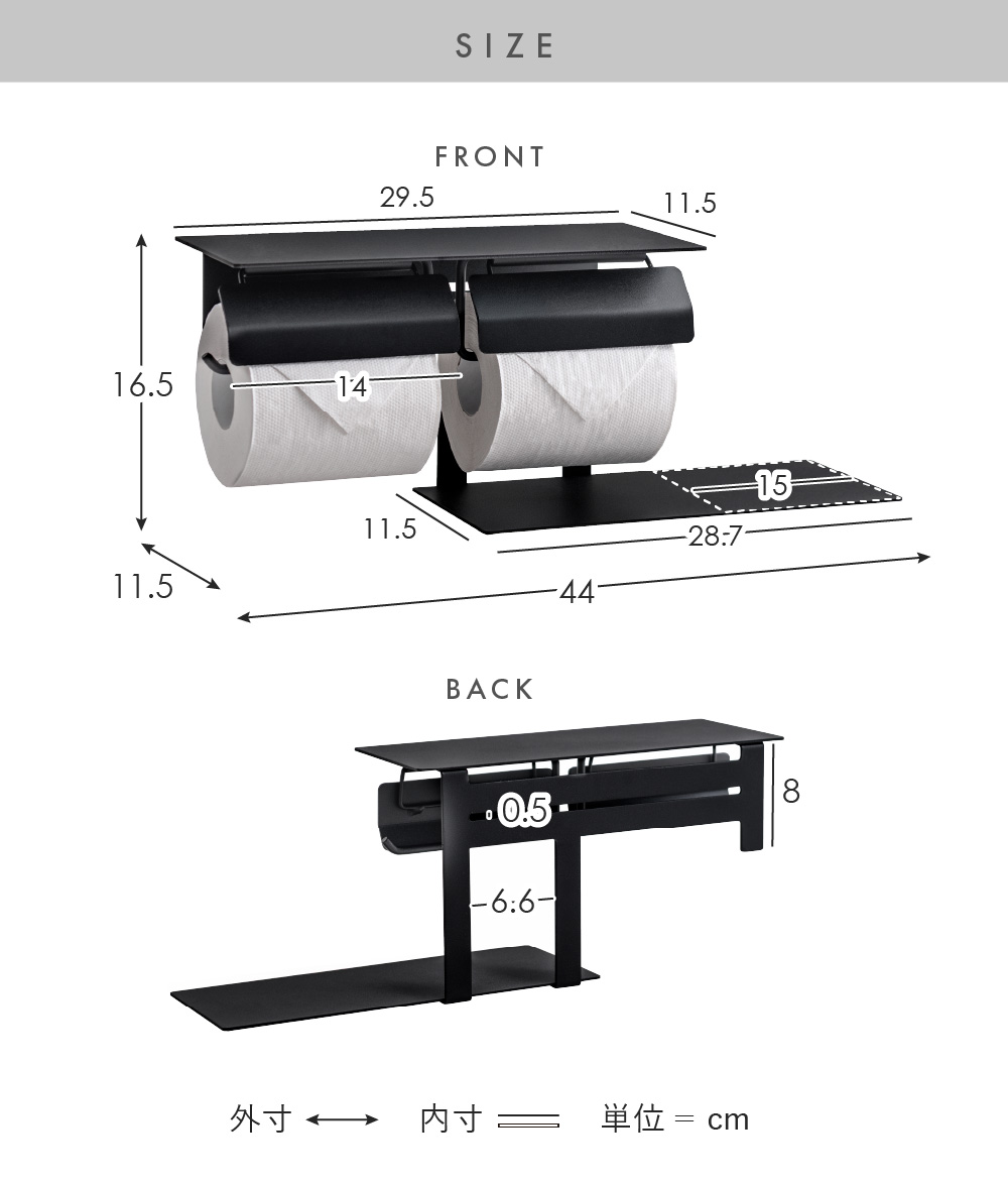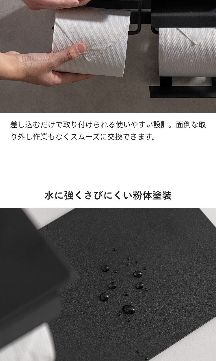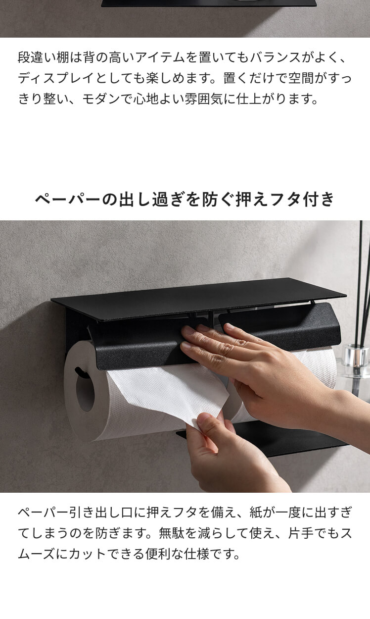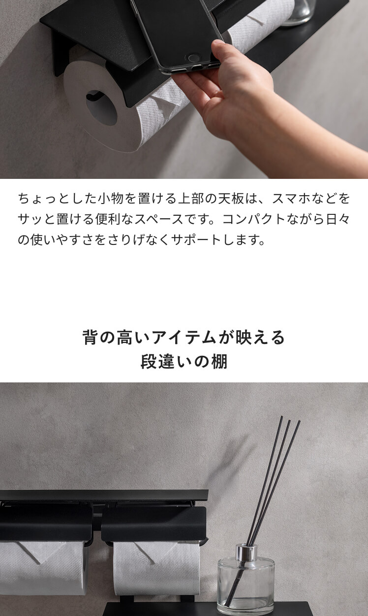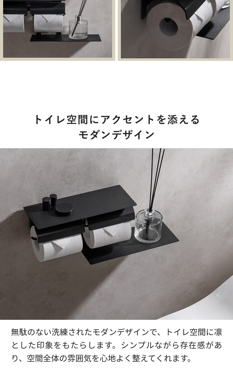 トイレットペーパーホルダー 2連 ダブル シングル 賃貸 天板 トイレットペーパーホルダーカバー おしゃれ オシャレ トイレットペーパー 収納 トイレ 飾り棚 シンプル モダン ブラック 棚付き 太巻きペーパー対応 スチール 押さえフタ 水に強い 完成品