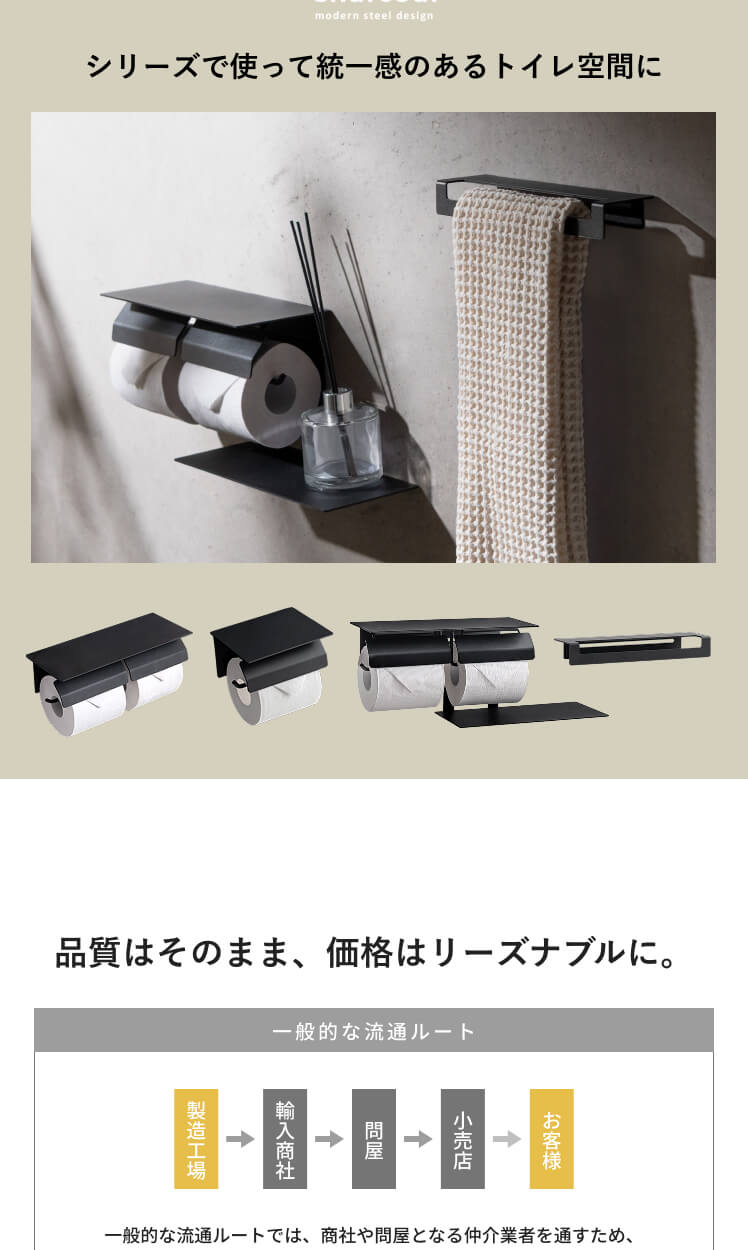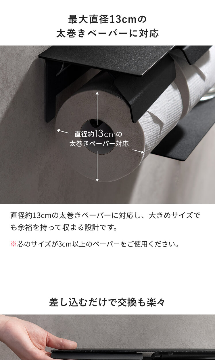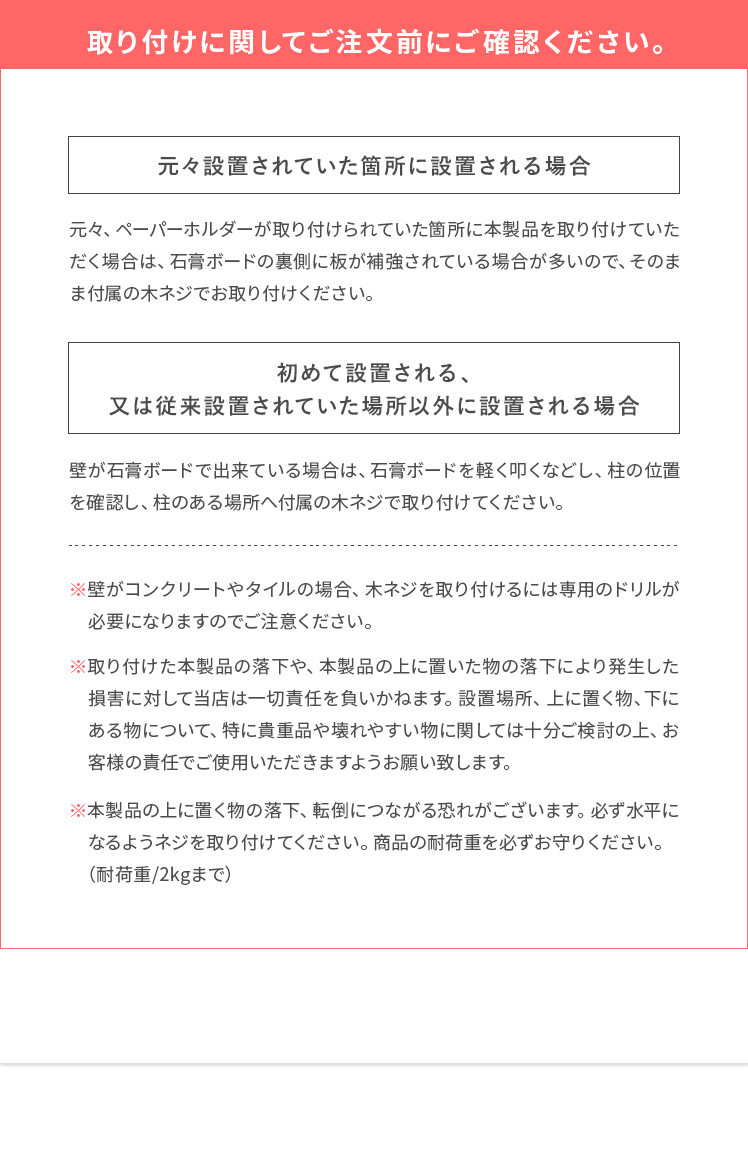 | 備考 | 完成品 ※若干の個体差により、表記サイズと多少の差異が生じる場合がございます。 ※取り付けの際はプラスドライバーが必要です ※芯の直径が3cm以上のトイレットペーパーをご使用ください。 ※ペーパー交換ができるよう、ホルダー横にペーパー1個分のスペースを空けて設置してください。 |