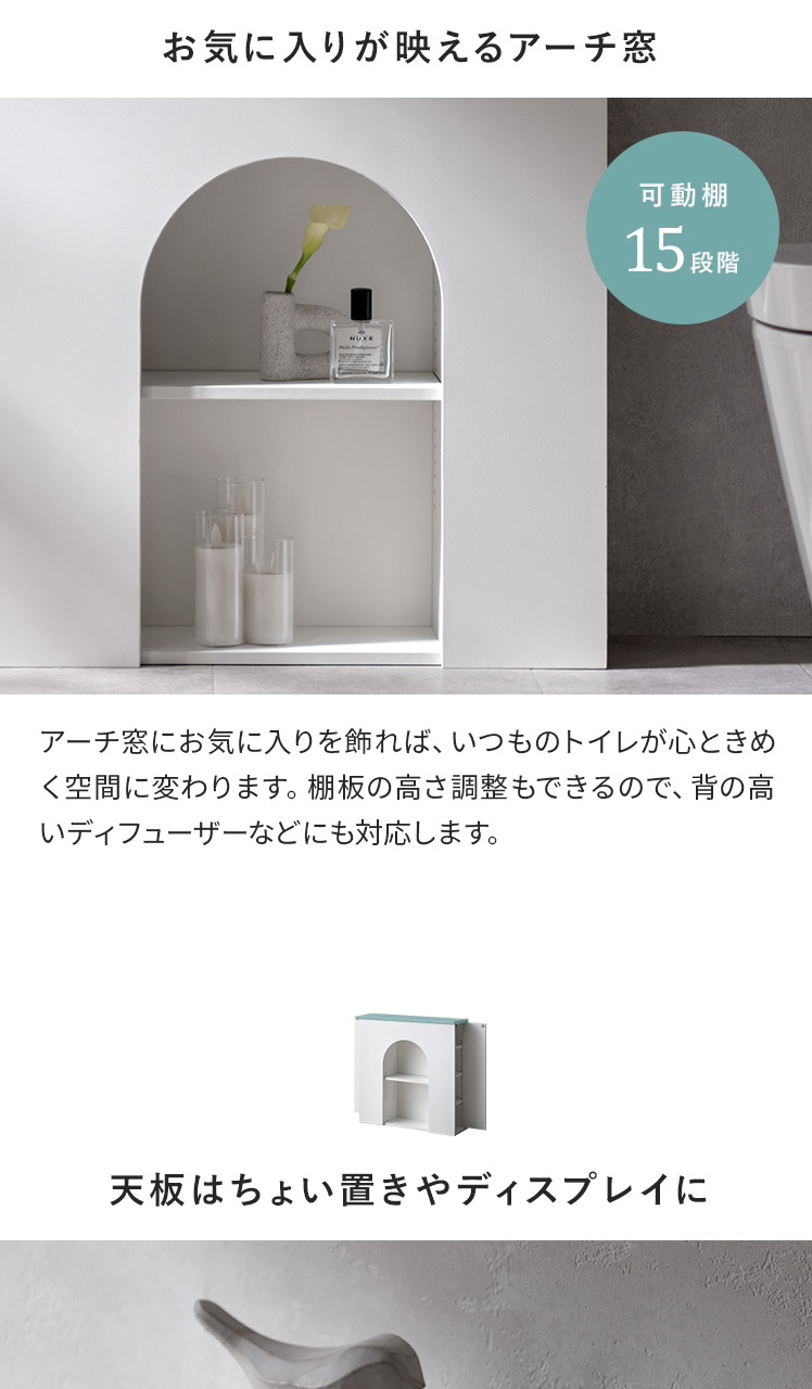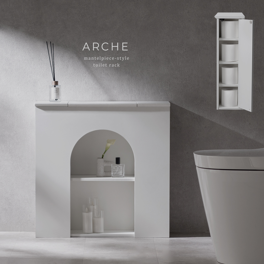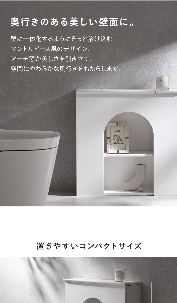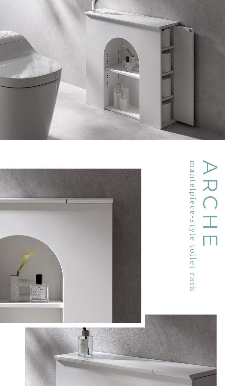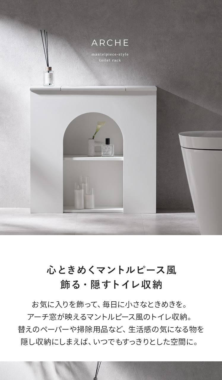 マントルピース風トイレラック ARCHE〔アーチェ〕/お気に入りを飾って、毎日に小さなときめきを。アーチ窓が映えるマントルピース風のトイレ収納。替えのペーパーや掃除用品など、生活感の気になる物を隠し収納にしまえば、いつでもすっきりとした空間に。