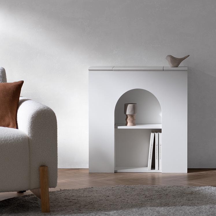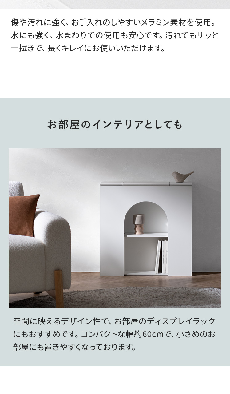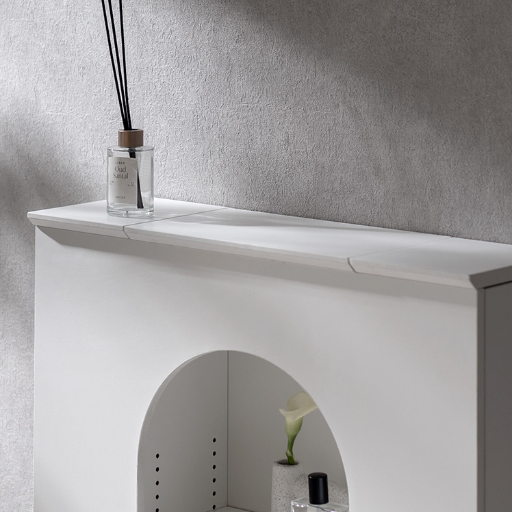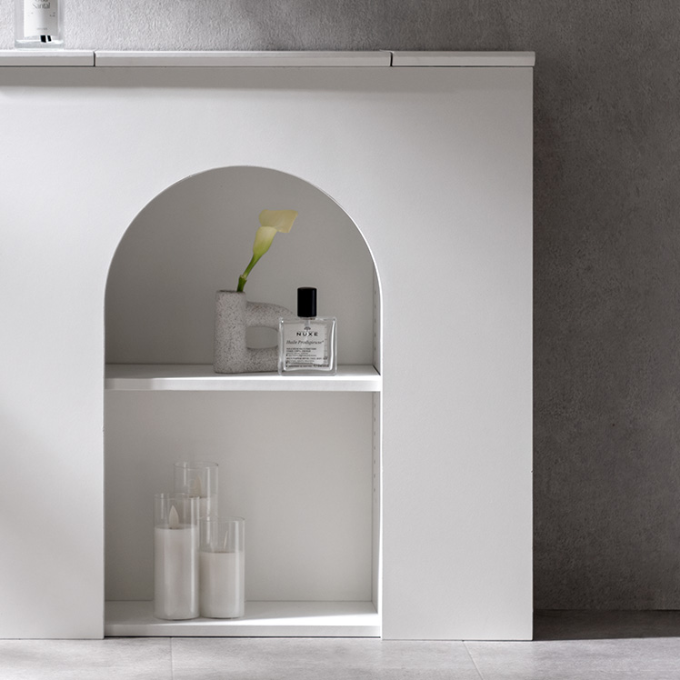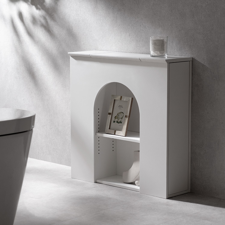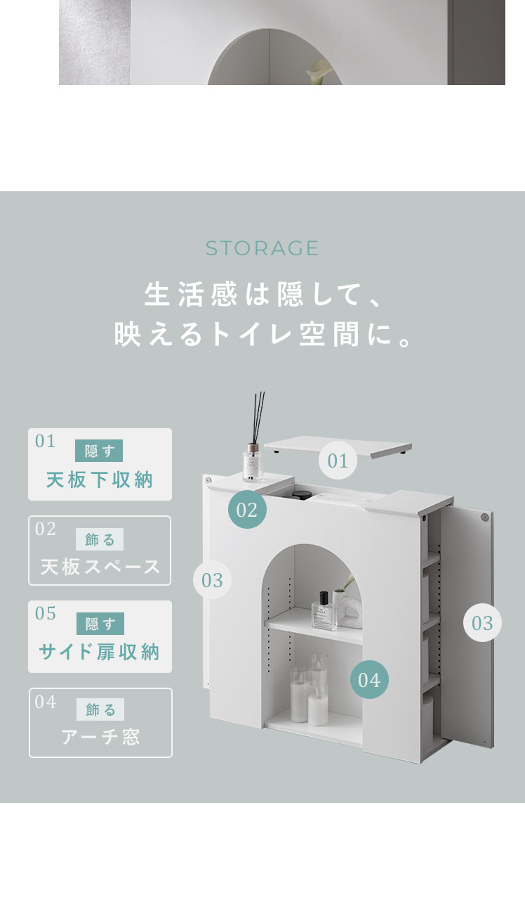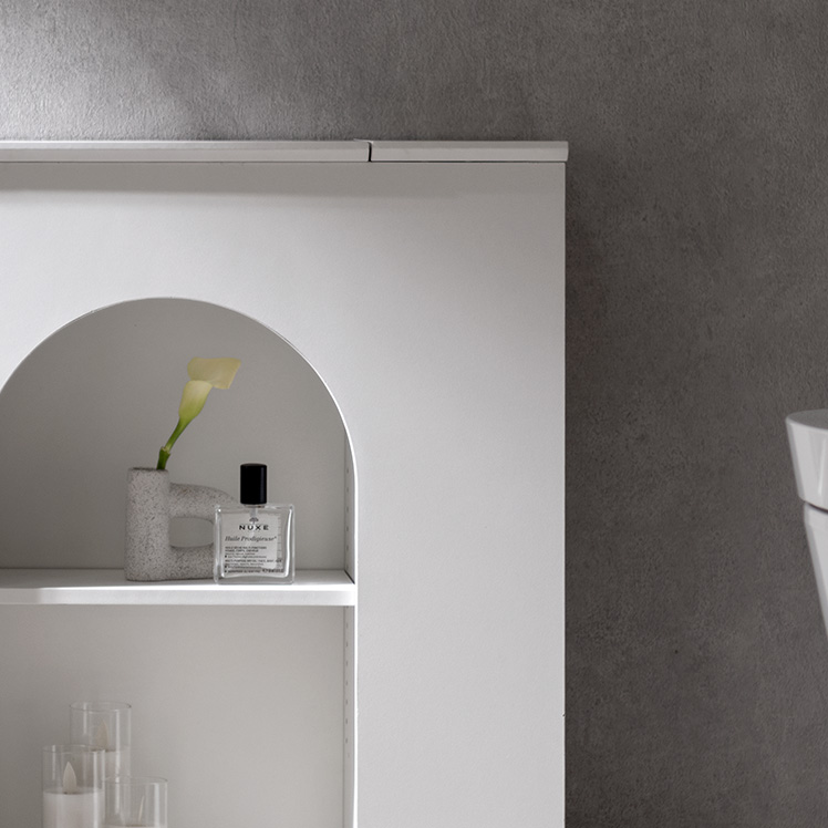 マントルピース風トイレラック ARCHE〔アーチェ〕/お気に入りを飾って、毎日に小さなときめきを。アーチ窓が映えるマントルピース風のトイレ収納。替えのペーパーや掃除用品など、生活感の気になる物を隠し収納にしまえば、いつでもすっきりとした空間に。