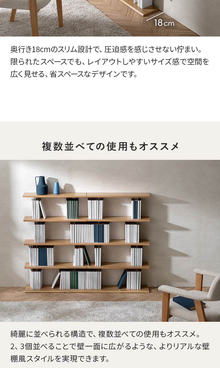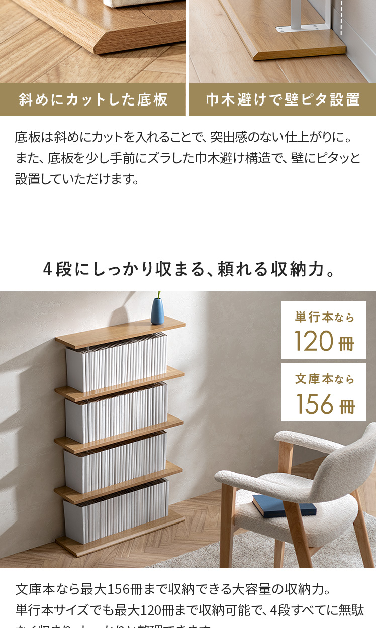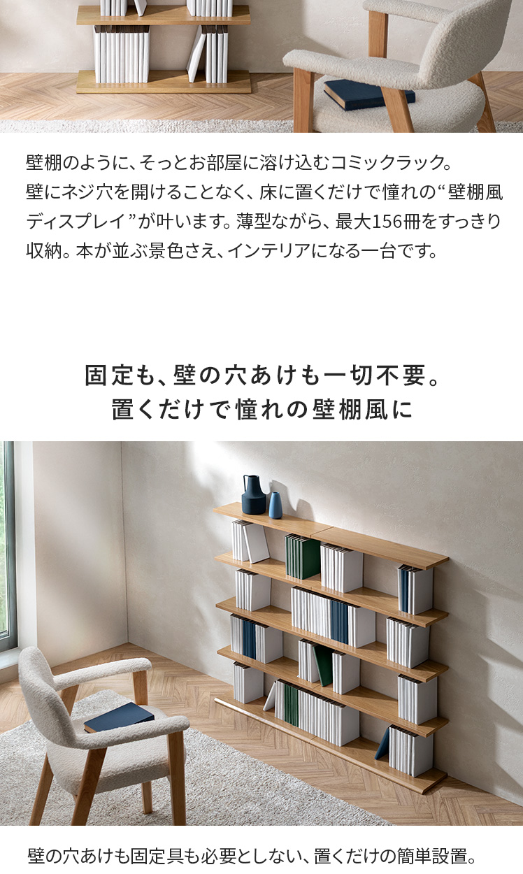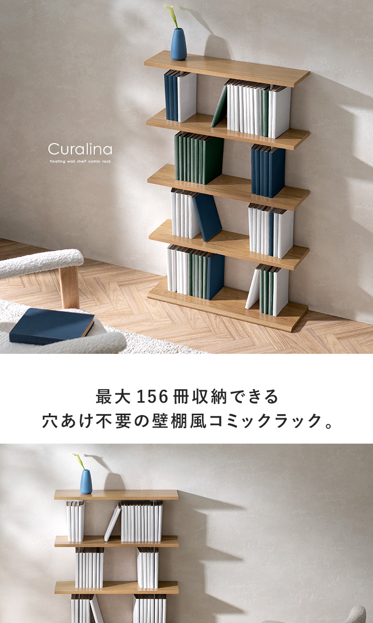 壁棚風コミックラック Curalina〔クラリナ〕/壁棚のように、そっとお部屋に溶け込むコミックラック。壁にネジ穴を開けることなく、床に置くだけで憧れの“壁棚風ディスプレイ”が叶います。薄型ながら、最大156冊をすっきり収納。本が並ぶ景色さえ、インテリアになる一台です。