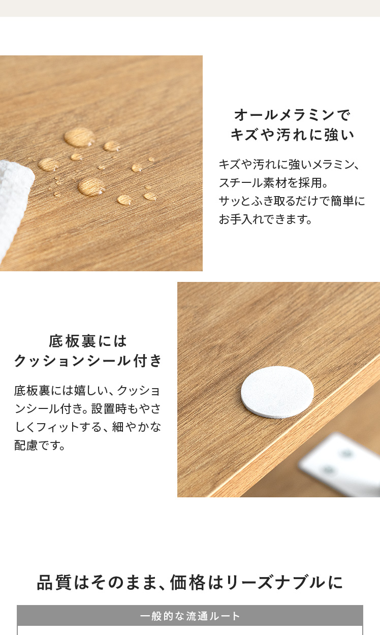 | 材質 | 合成樹脂化粧板(メラミン)、スチール(粉体塗装) |