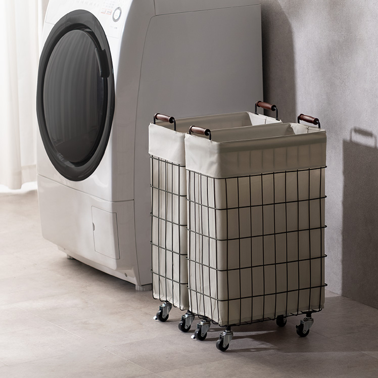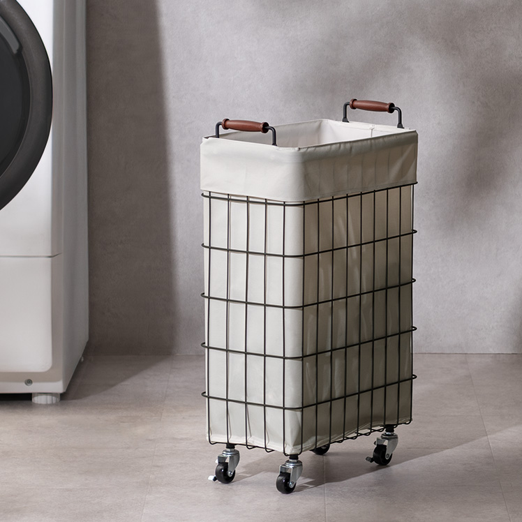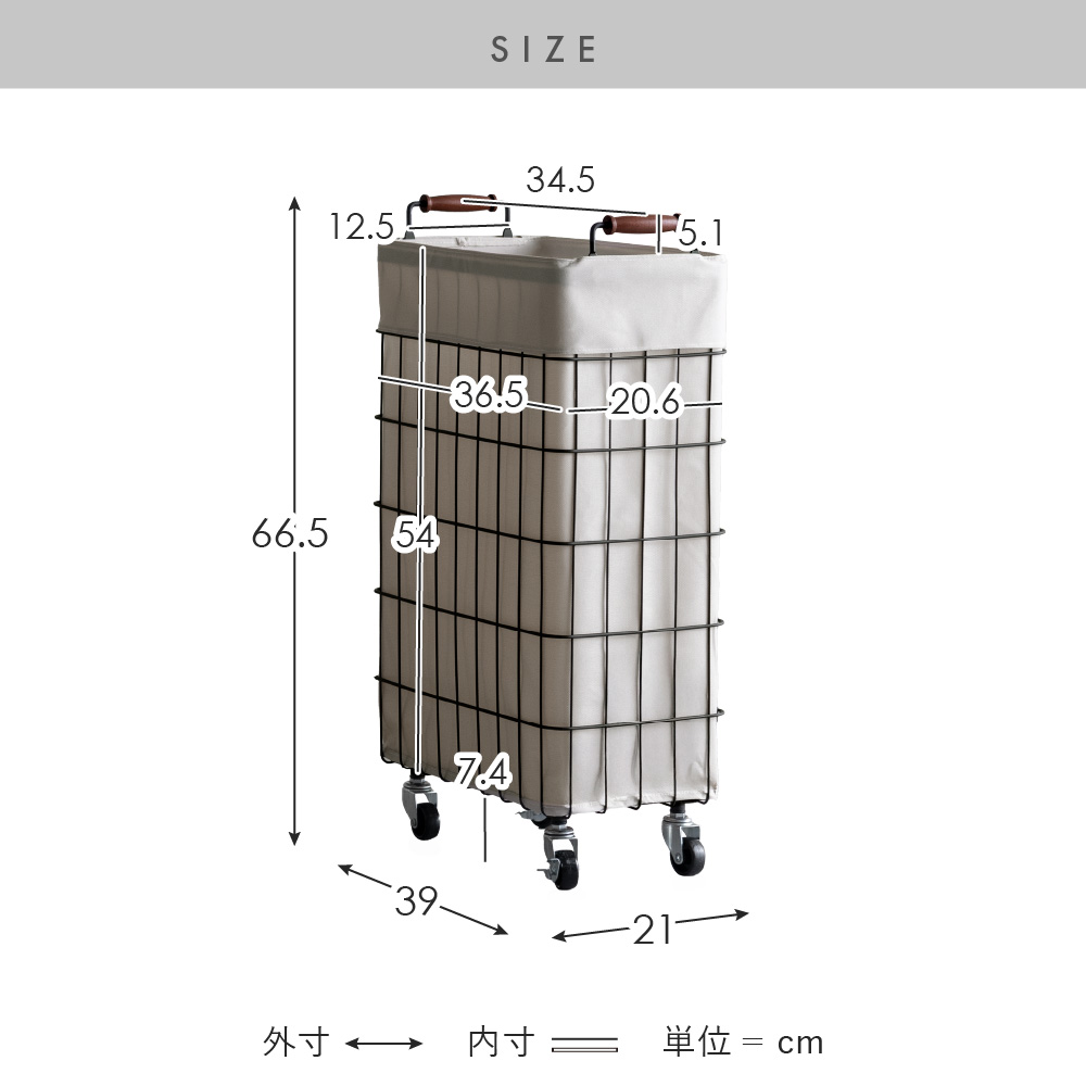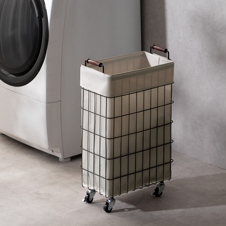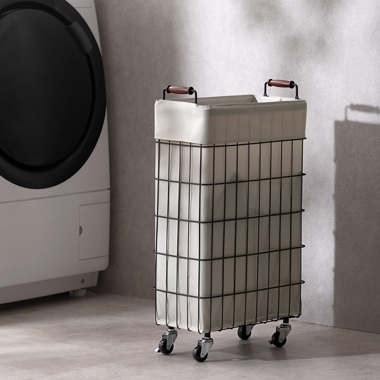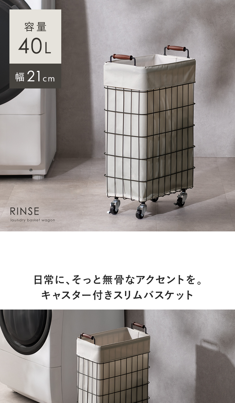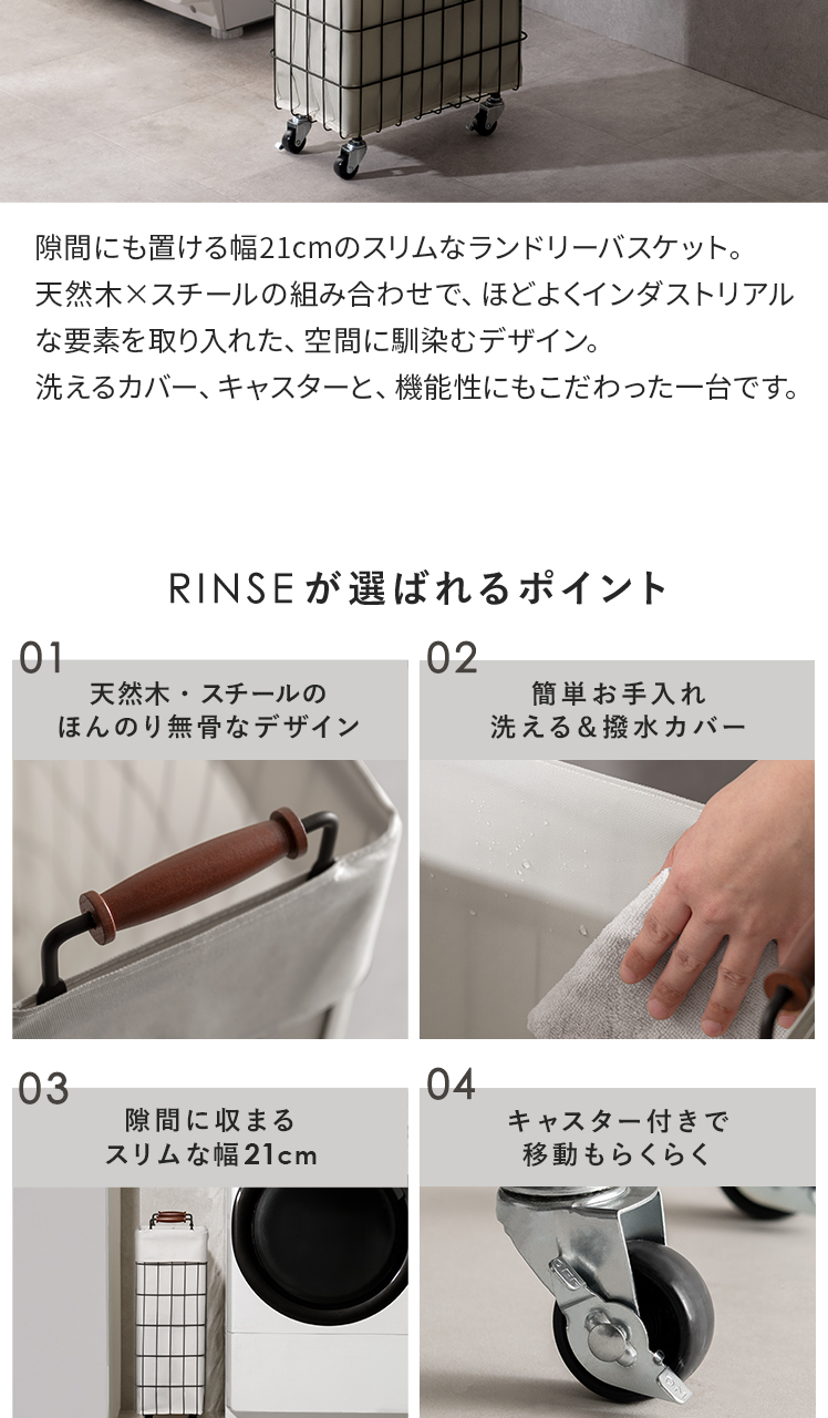 洗えるカバー付きランドリーバスケット RINSE〔リンセ〕/隙間にも置ける幅21cmのスリムなランドリーバスケット。天然木×スチールの組み合わせで、ほどよくインダストリアルな要素を取り入れた、空間に馴染むデザイン。洗えるカバー、キャスターと、機能性にもこだわった一台です。“見せても使っても心地いい”を叶える、頼れるスリムバスケットです。