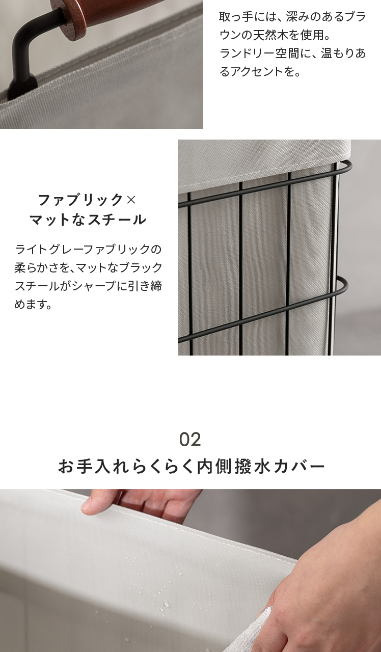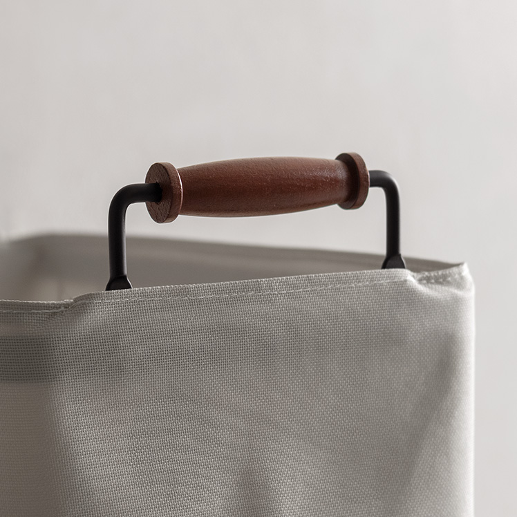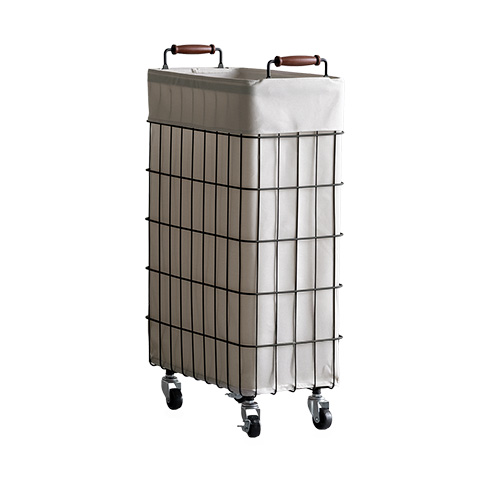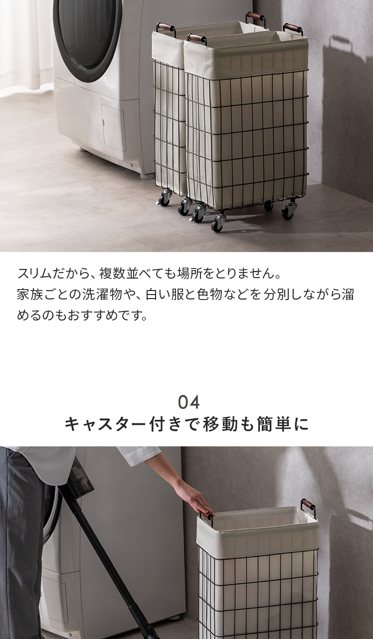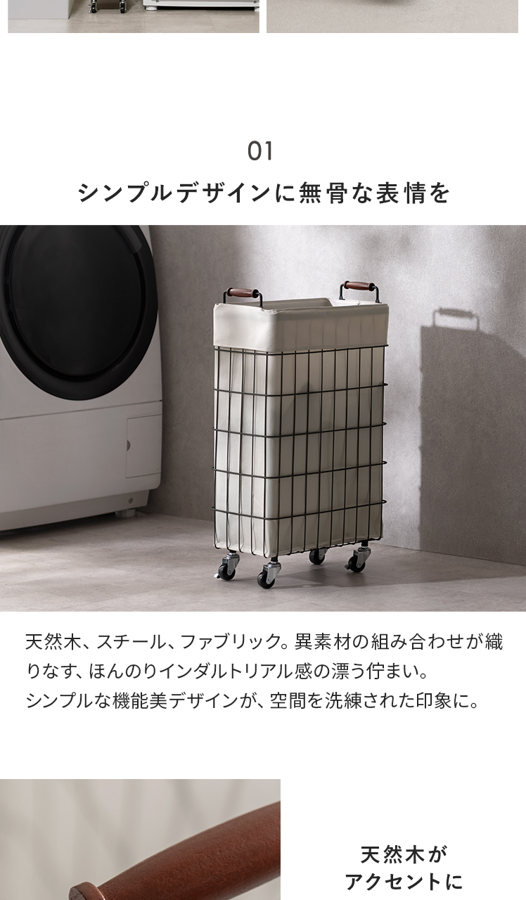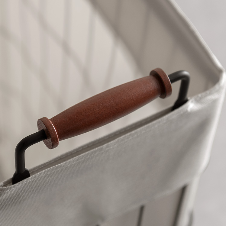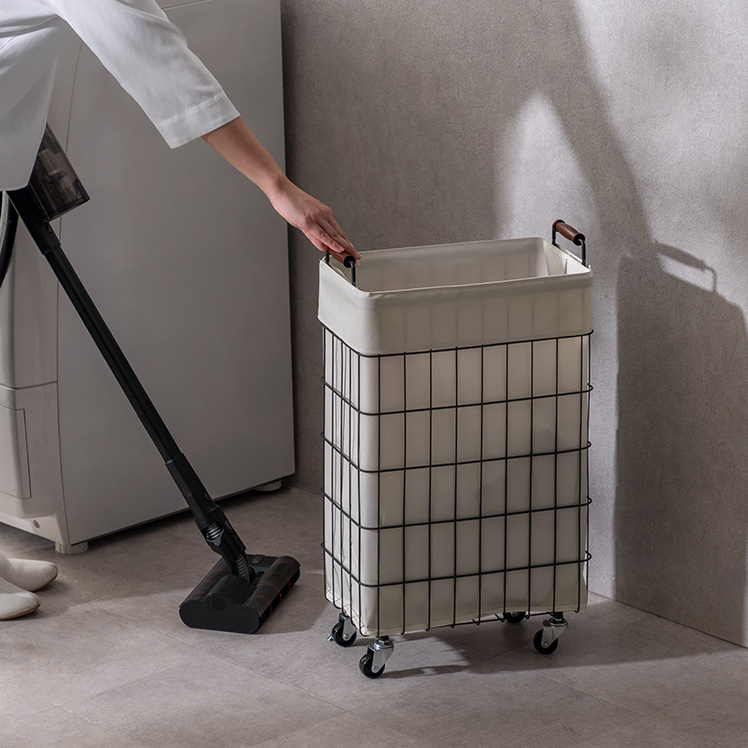 洗えるカバー付きランドリーバスケット RINSE〔リンセ〕/隙間にも置ける幅21cmのスリムなランドリーバスケット。天然木×スチールの組み合わせで、ほどよくインダストリアルな要素を取り入れた、空間に馴染むデザイン。洗えるカバー、キャスターと、機能性にもこだわった一台です。“見せても使っても心地いい”を叶える、頼れるスリムバスケットです。
