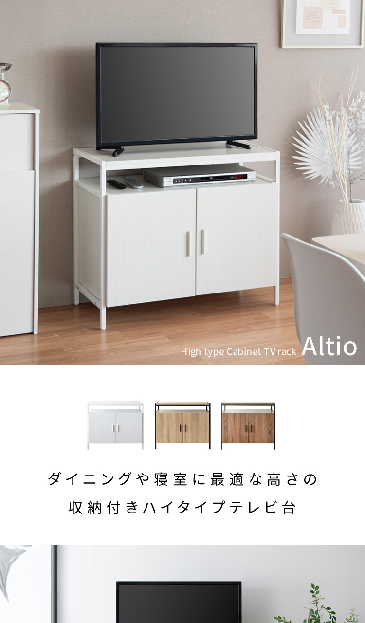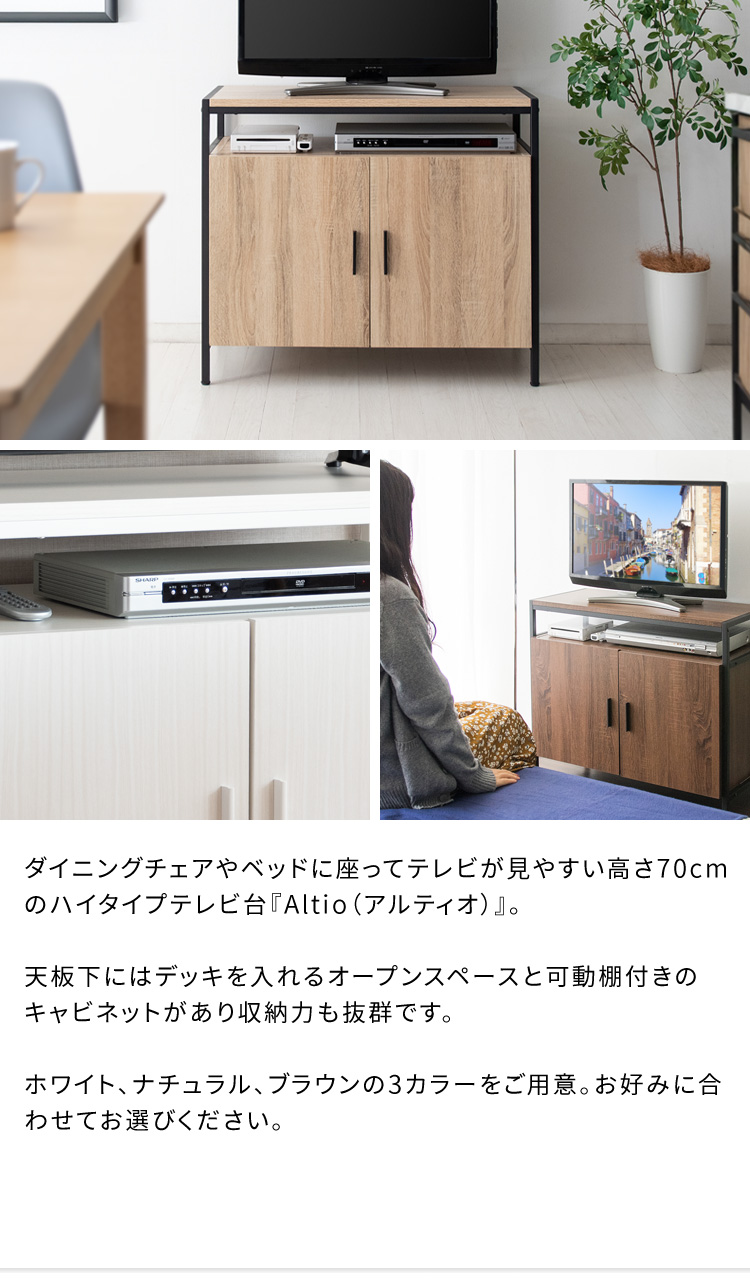 ハイタイプテレビラック Altio〔アルティオ〕/ダイニングチェアやベッドに座ってテレビが見やすい高さ70cmのハイタイプテレビ台『Altio(アルティオ)』。天板下にはデッキを入れるオープンスペースと可動棚付きのキャビネットがあり収納力も抜群です。ホワイト、ナチュラル、ブラウンの3カラーをご用意。お好みに合わせてお選びください。
