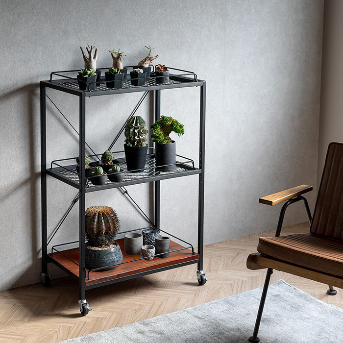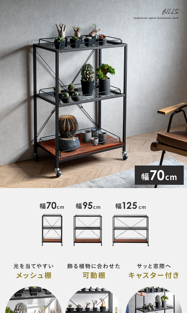 ヴィンテージ調ボタニカルラック BILLS〔ビルズ〕/植物の育てやすさや、ディスプレイに徹底的にこだわったヴィンテージラック。日光や風をあてやすいメッシュ棚なのはもちろん、いつでも好きな場所に移動できるキャスター付きです。日中だけ窓際にサッと移動可能。置き場に悩まず、植物の育成環境をつくっていただけます。さらに中段は可動棚に。植物の高さに合わせられるので、「背が高くて飾れないかも…」といった不安も解消します♪自慢の植物たちに、理想の環境をプレゼントしていただけます。