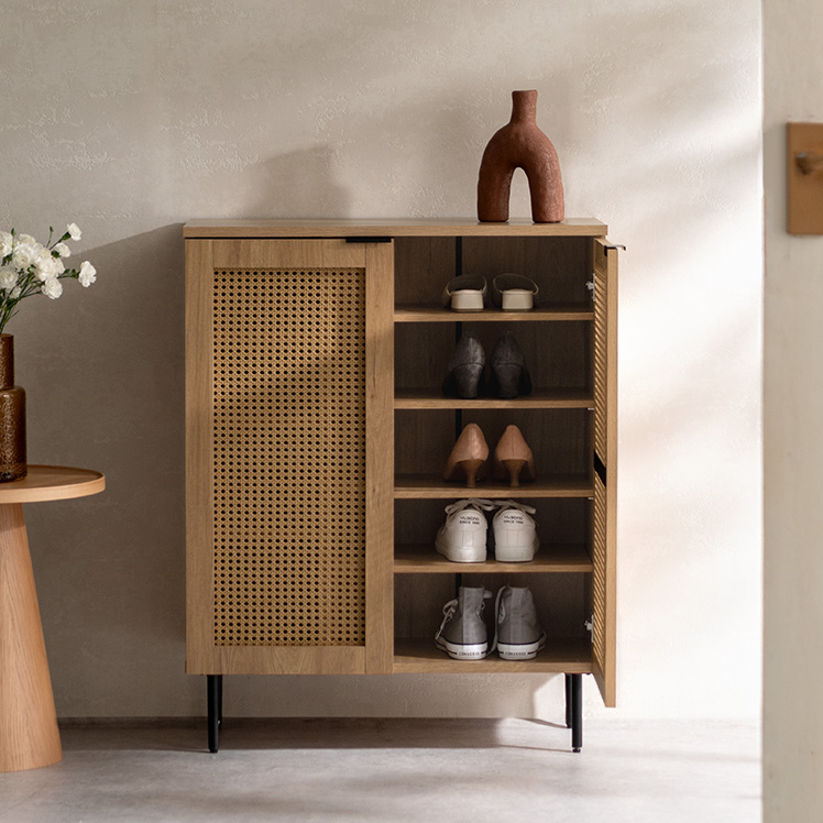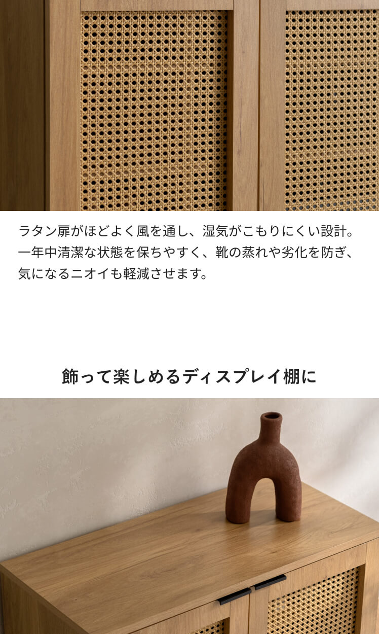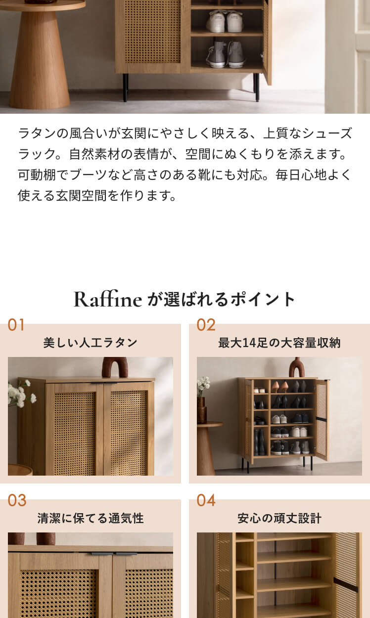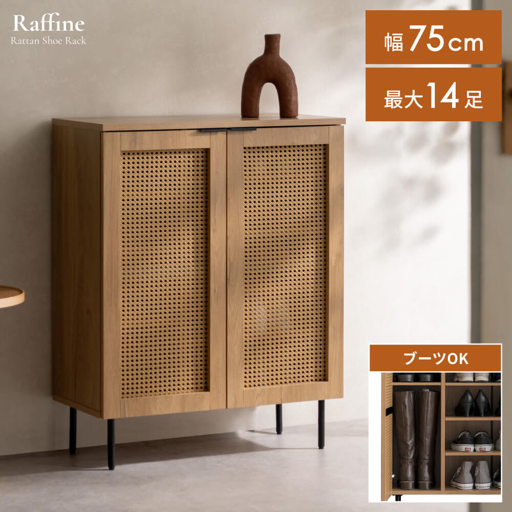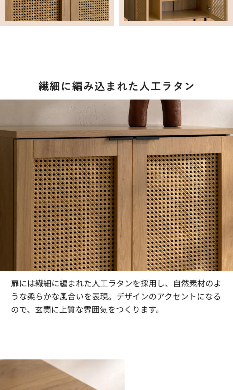 ラタンシューズラック Raffine〔ラフィネ〕/ラタンの風合いが玄関にやさしく映える、上質なシューズラック。自然素材の表情が、空間にぬくもりを添えます。可動棚でブーツなど高さのある靴にも対応。毎日心地よく使える玄関空間を作ります。