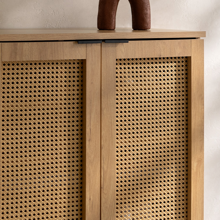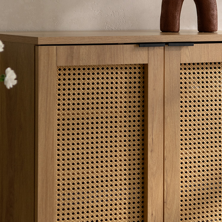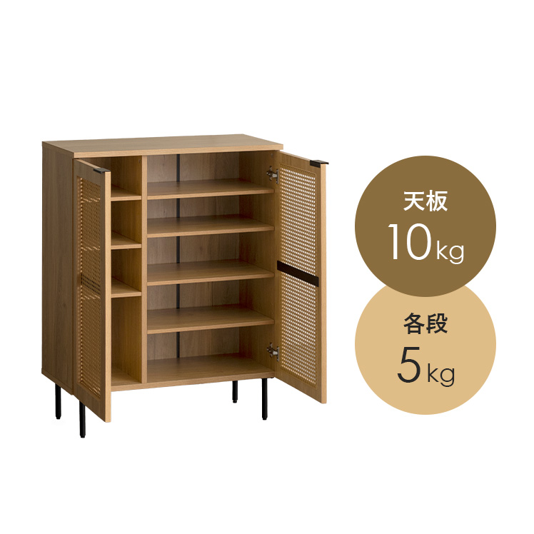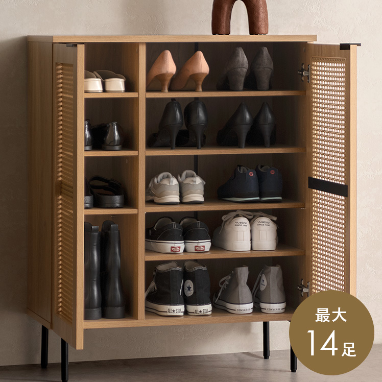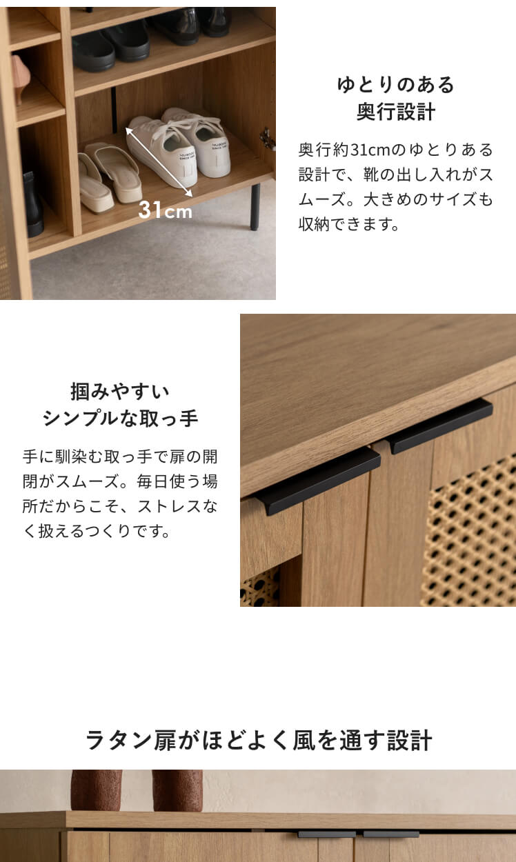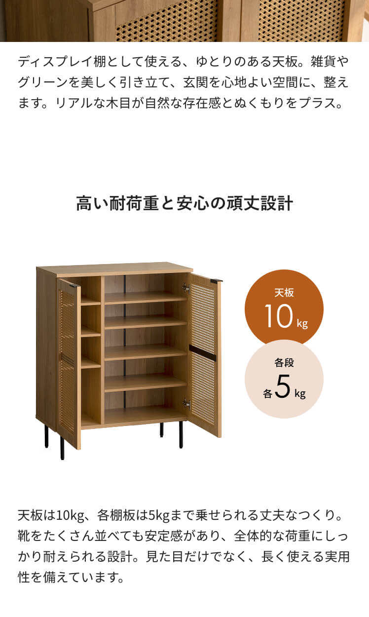 ラタンシューズラック Raffine〔ラフィネ〕/ラタンの風合いが玄関にやさしく映える、上質なシューズラック。自然素材の表情が、空間にぬくもりを添えます。可動棚でブーツなど高さのある靴にも対応。毎日心地よく使える玄関空間を作ります。