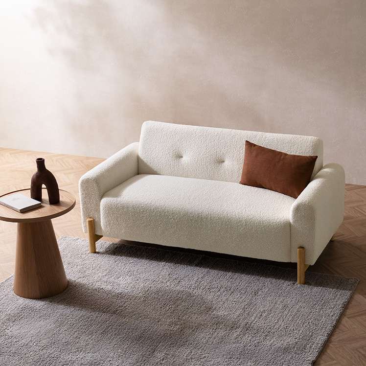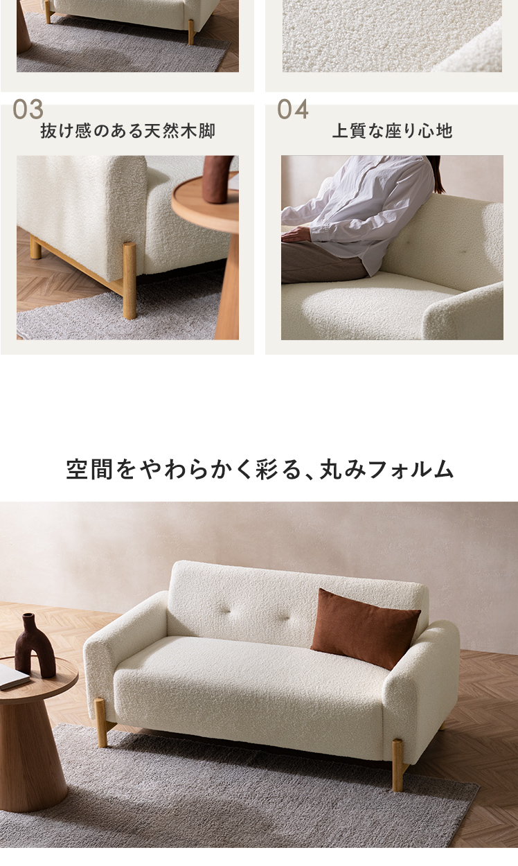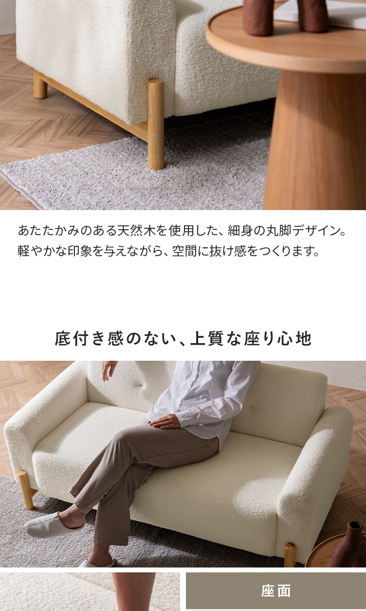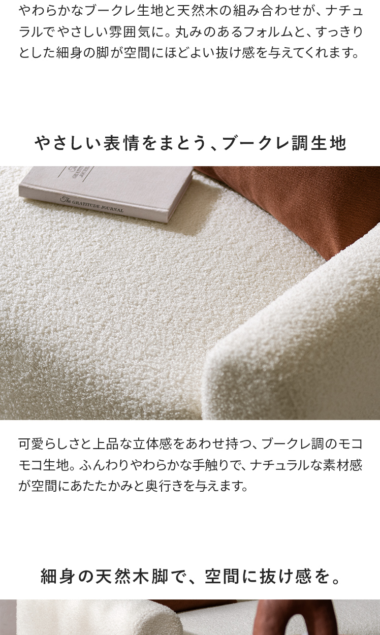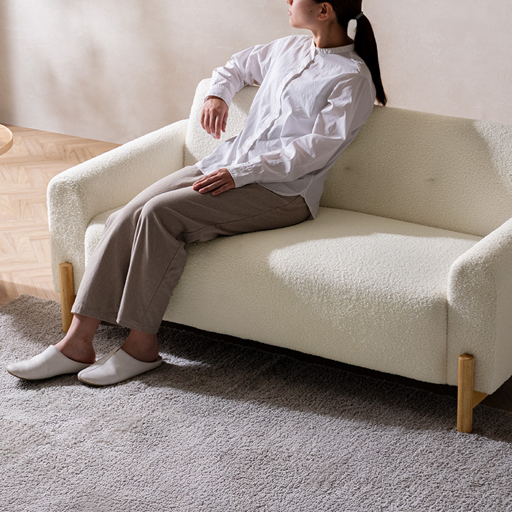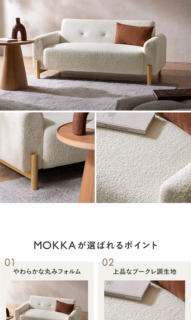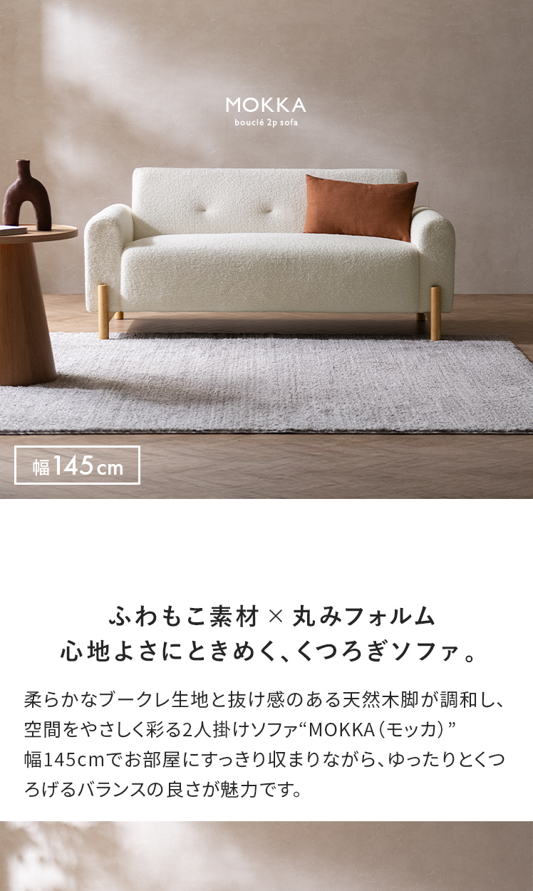 ブークレ調ソファ MOKKA〔モッカ〕/柔らかなブークレ生地と抜け感のある天然木脚が調和し、空間をやさしく彩る2人掛けソファ“MOKKA(モッカ)”幅145cmでお部屋にすっきり収まりながら、ゆったりとくつろげるバランスの良さが魅力です。