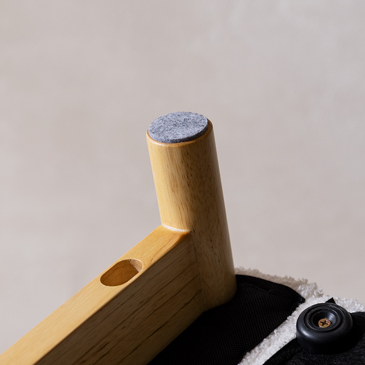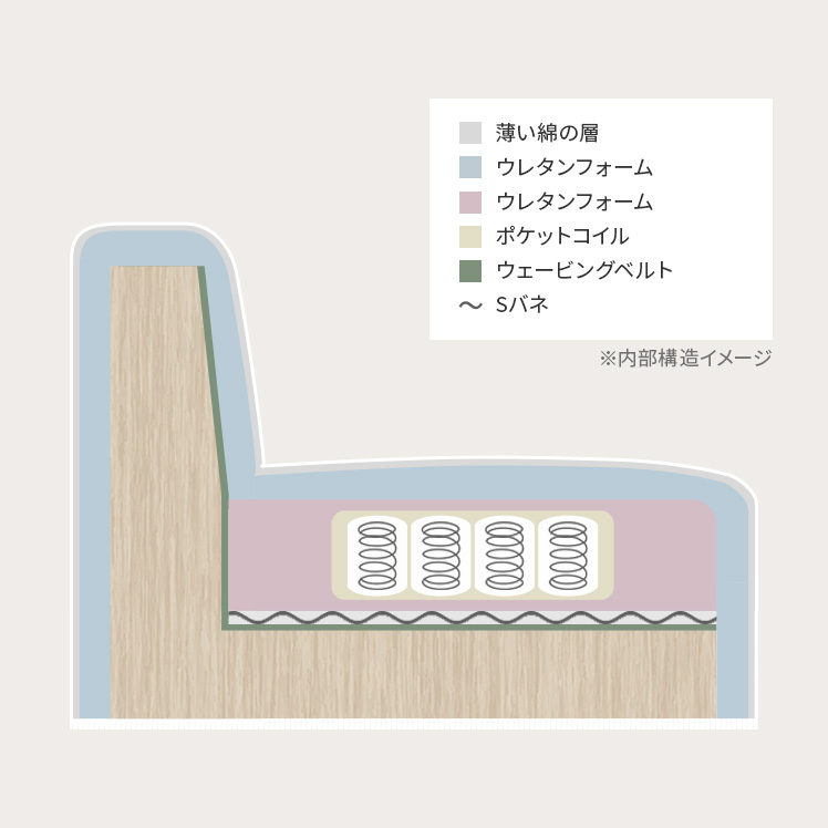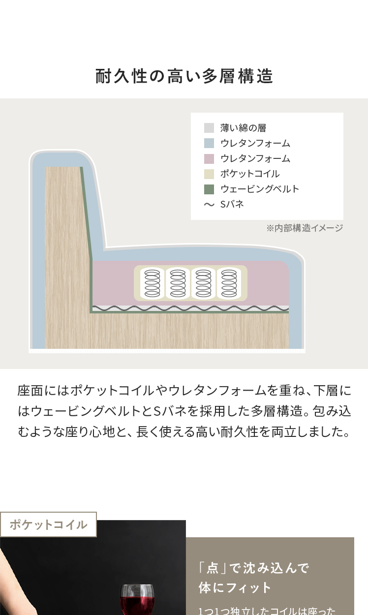 | 材質 | 天然木、ウェービングベルト、銅製バネ 脚部/ラッカー塗装仕上げ 張地/ポリエステル100% クッション材/ウレタンフォーム |