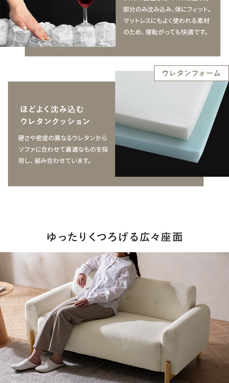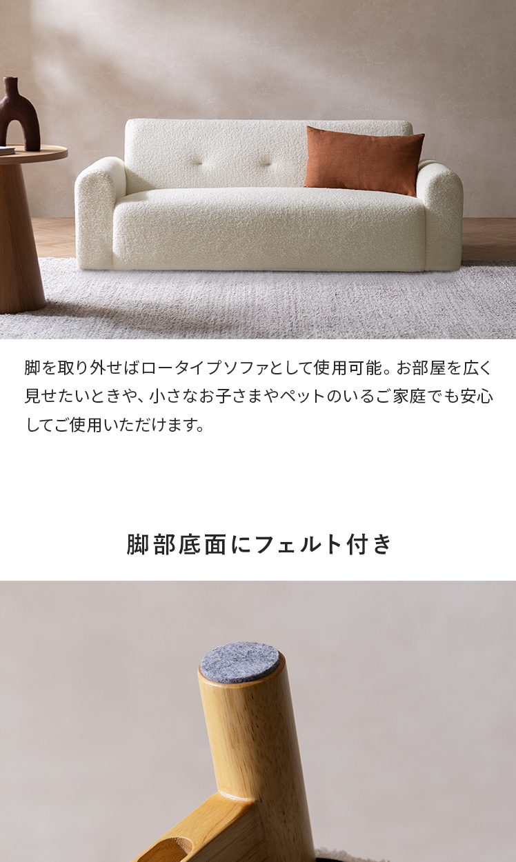 2人掛け ナチュラル ローソファ 北欧 ふわふわ フェルト付き ポケットコイル ホテルライク ホワイト