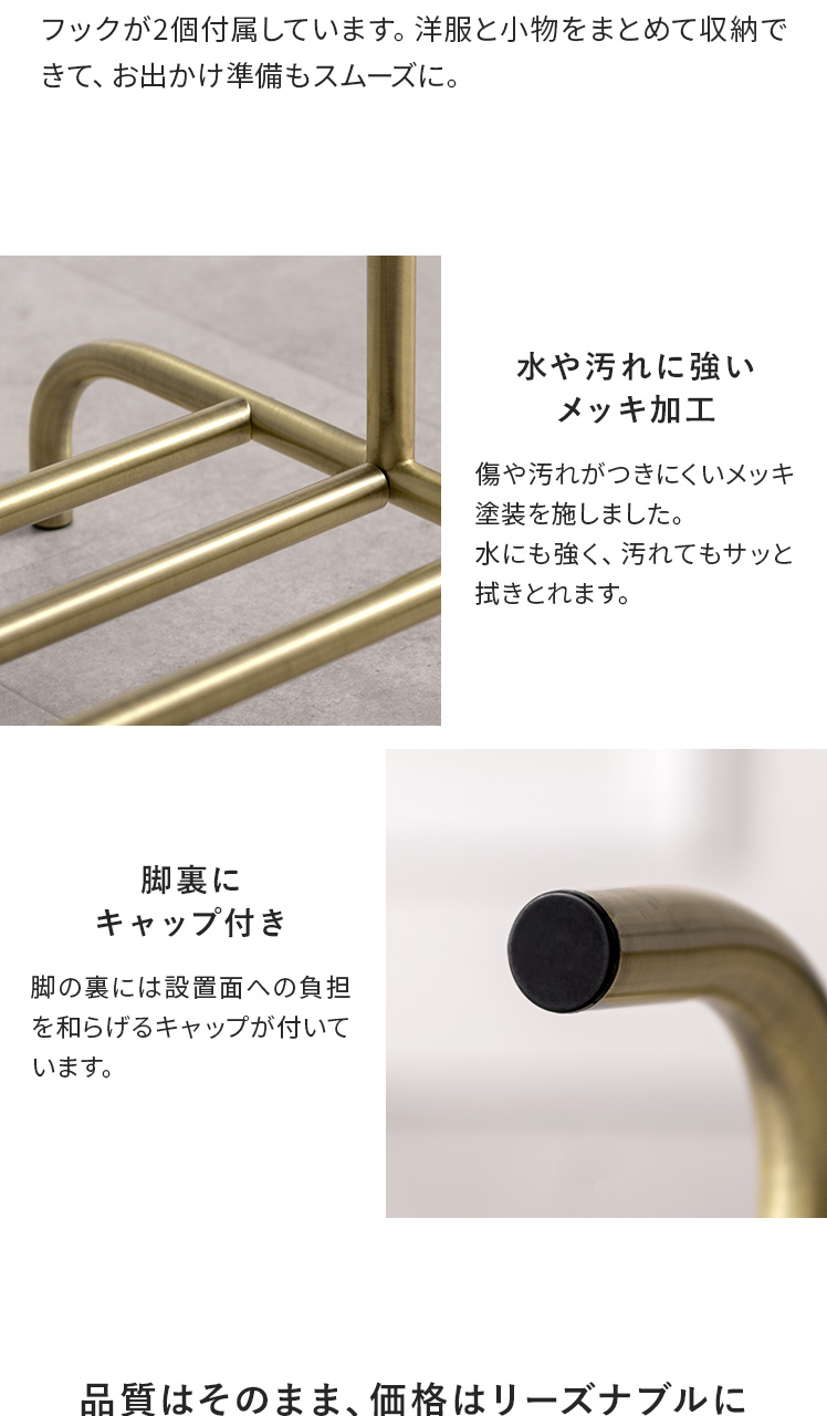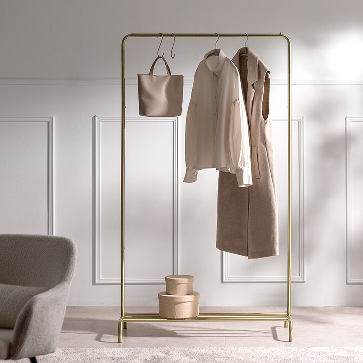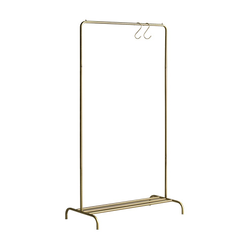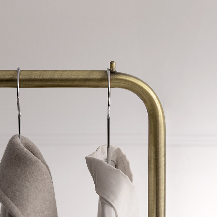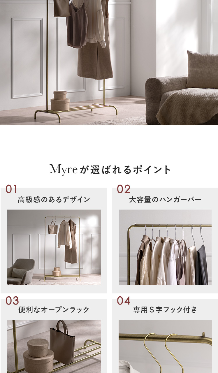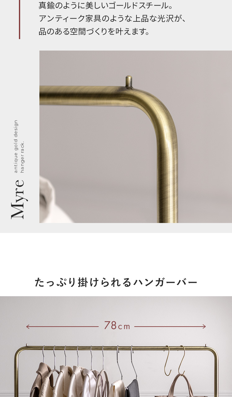 真鍮風ハンガーラック MYRE〔マイア〕 90cm幅/真鍮のような美しい光沢をまとった、アンティークゴールドのハンガーラック。シンプルで上品な佇まいが、空間にさりげない存在感を添えます。お店のディスプレイのような美しい衣類収納をご自宅に。