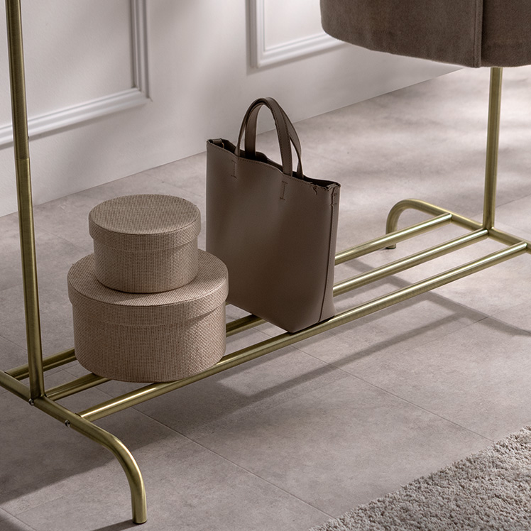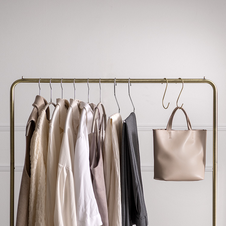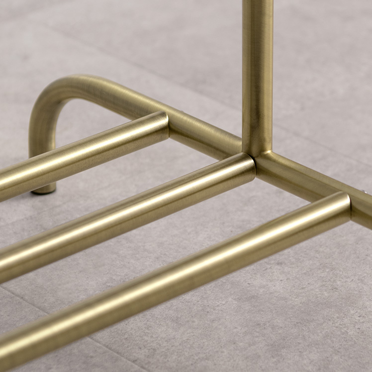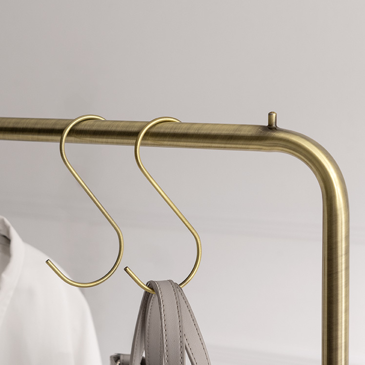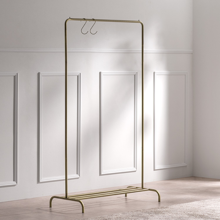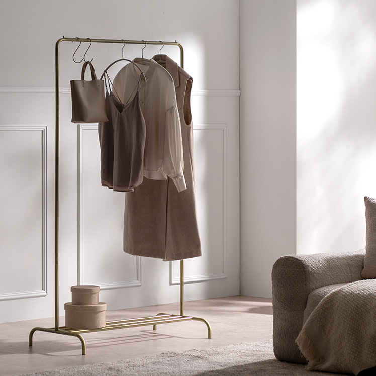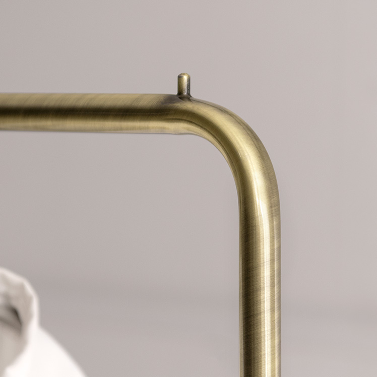 真鍮風ハンガーラック MYRE〔マイア〕 90cm幅/真鍮のような美しい光沢をまとった、アンティークゴールドのハンガーラック。シンプルで上品な佇まいが、空間にさりげない存在感を添えます。お店のディスプレイのような美しい衣類収納をご自宅に。
