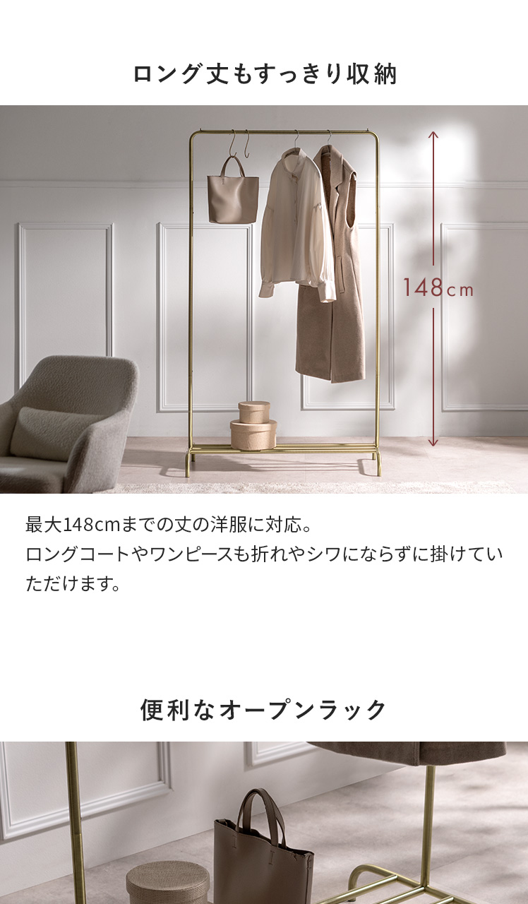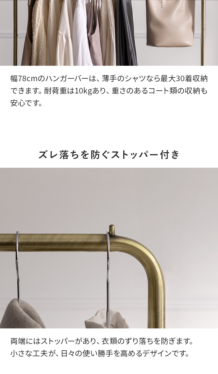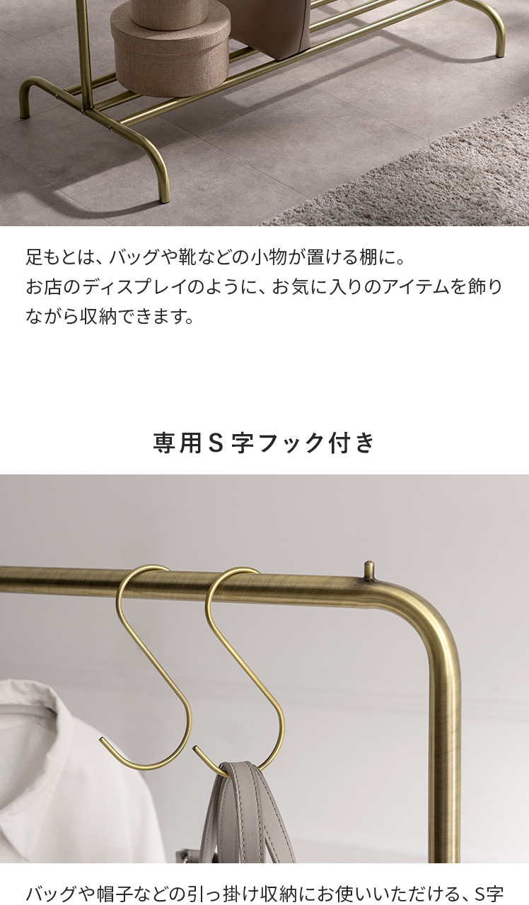 ハンガーラック おしゃれ スリム アイアン コートハンガー 省スペース シンプル 幅90 大容量 洋服掛け 収納 玄関 衣類収納 パイプハンガー リビング 寝室 頑丈 棚付き スチール 真鍮風 ゴールド S字フック付き オープンラック ストッパー付き メッキ加工 上質 ホテル ショップ 高級感