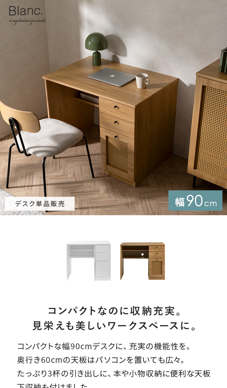 90cm幅シンプルデスク blanc〔ブラン〕 ラタンタイプ/コンパクトな幅90cmデスクに、充実の機能性を。奥行き60cmの天板はパソコンを置いても広々。たっぷり3杯の引き出しに、本や小物収納に便利な天板下収納も付けました。
