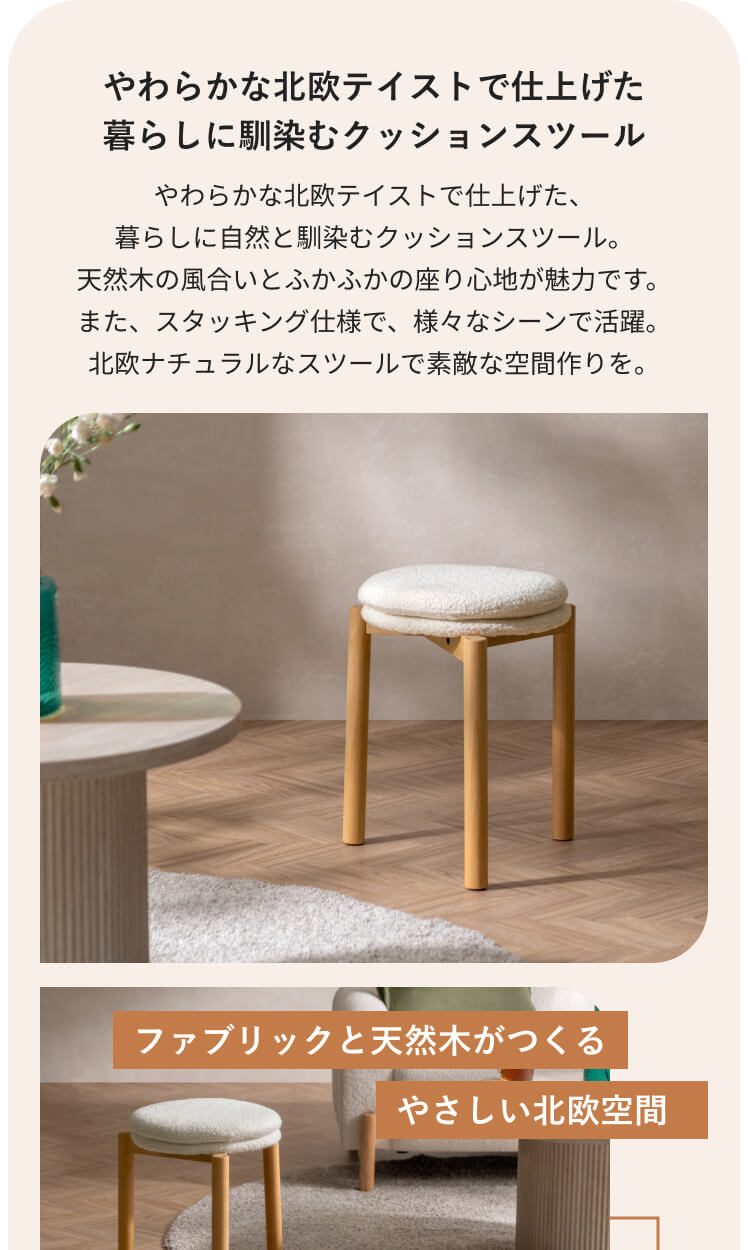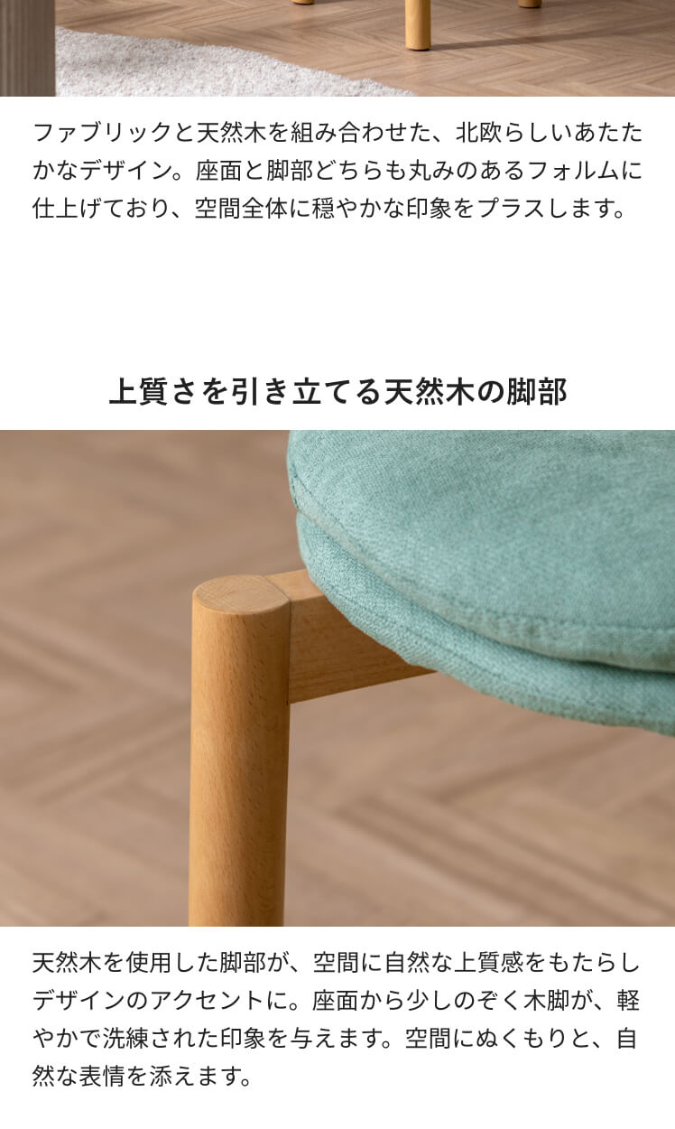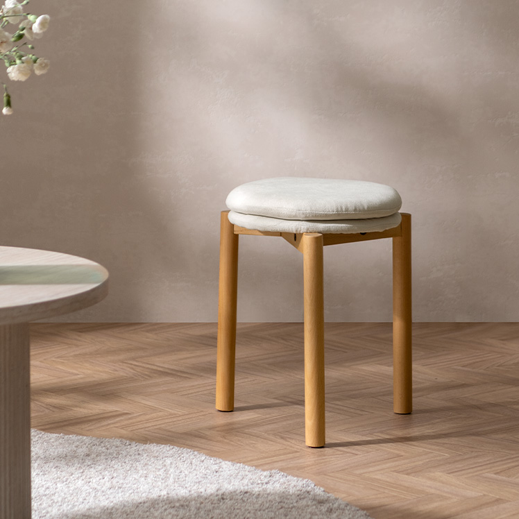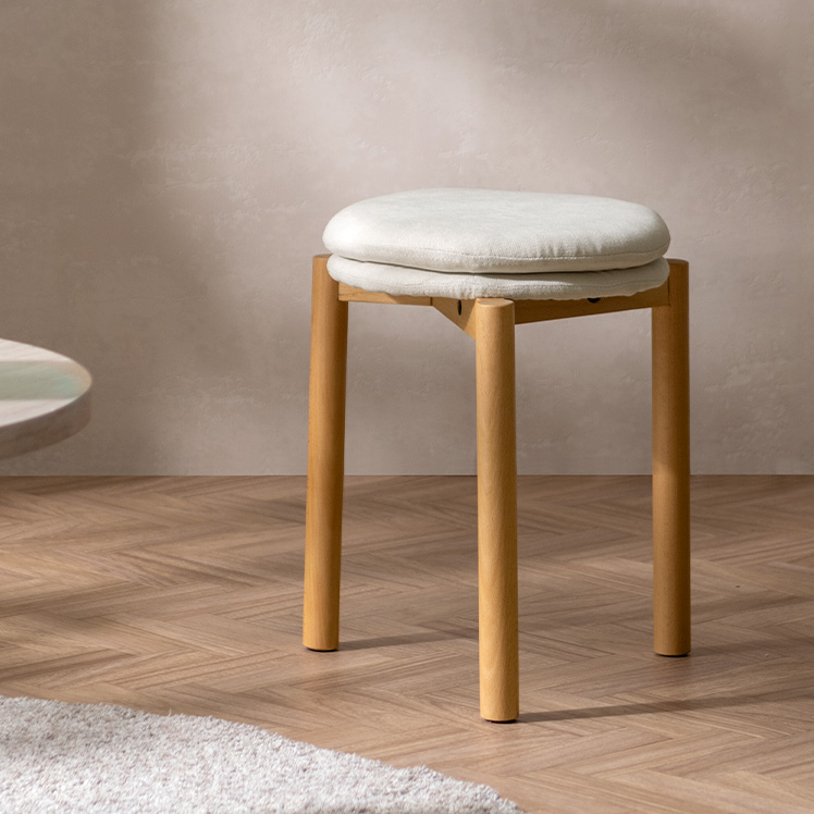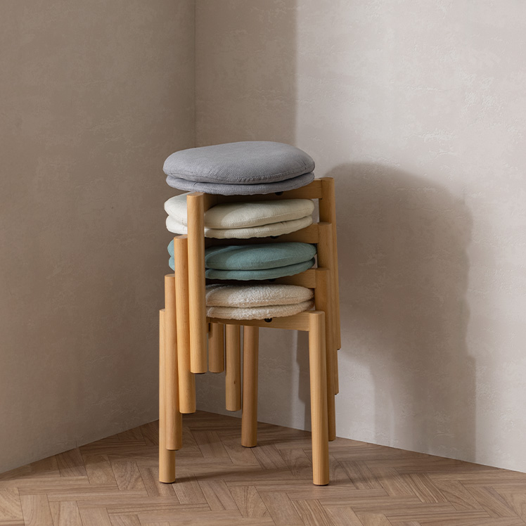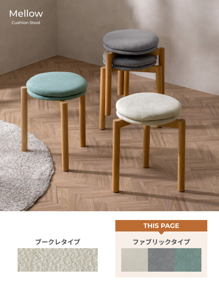 北欧デザインのクッションスツール Mellow〔メロウ〕ファブリックタイプ/やわらかな北欧テイストで仕上げた、暮らしに自然と馴染むクッションスツール。天然木の風合いとふかふかの座り心地が魅力です。また、スタッキング仕様で、様々なシーンで活躍。北欧ナチュラルなスツールで素敵な空間作りを。