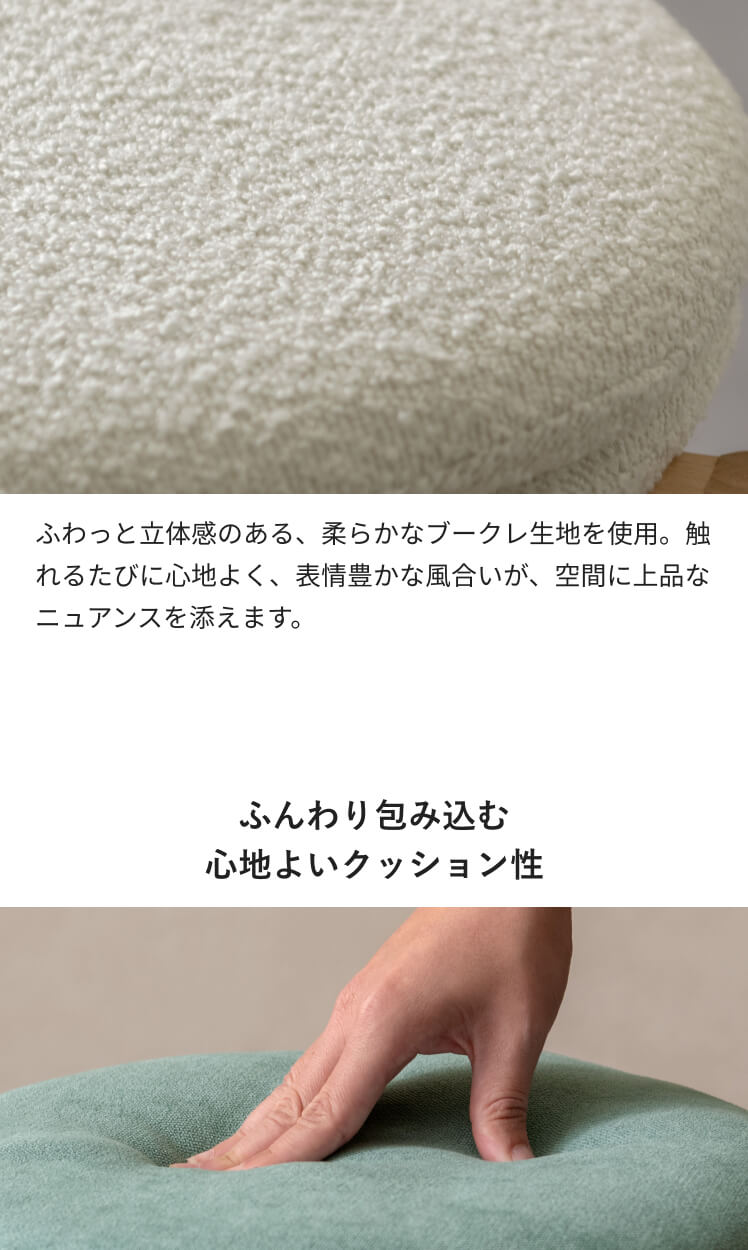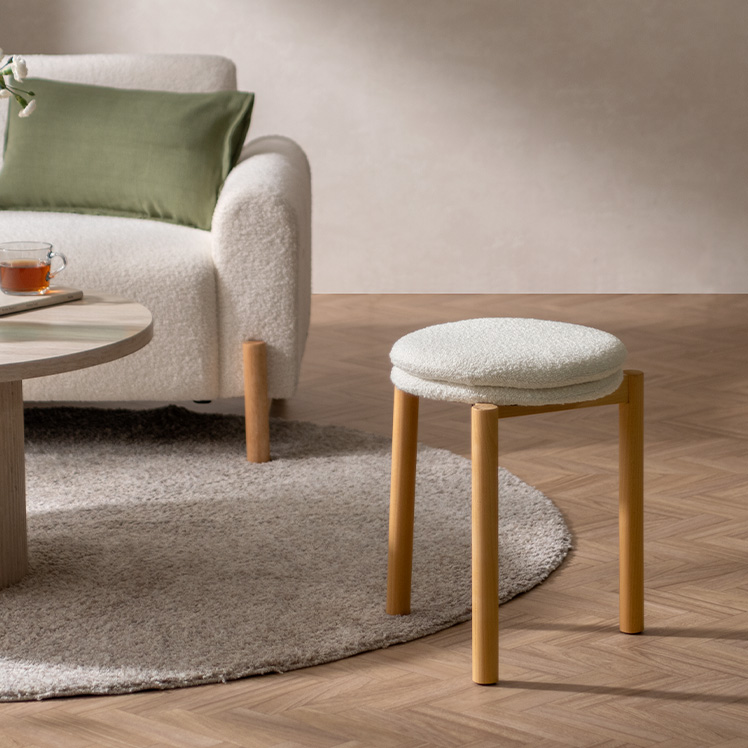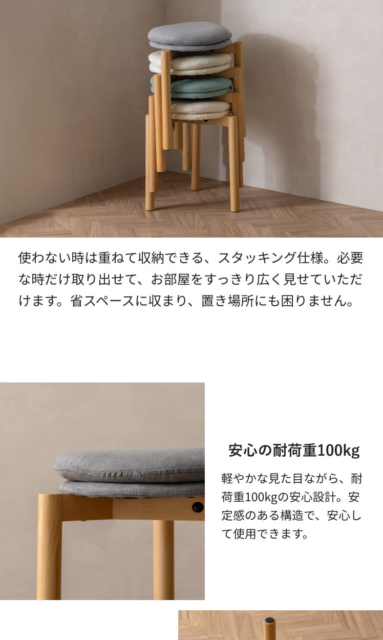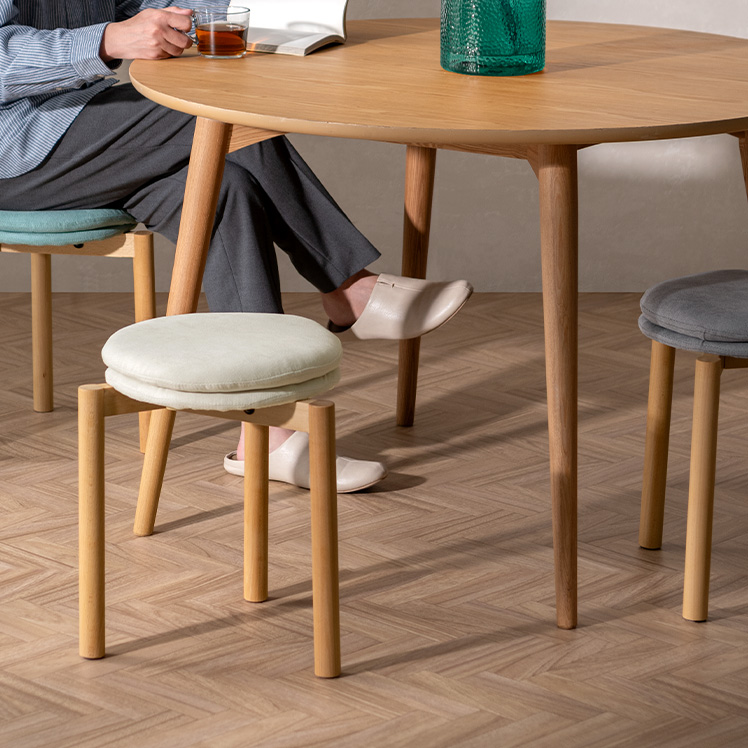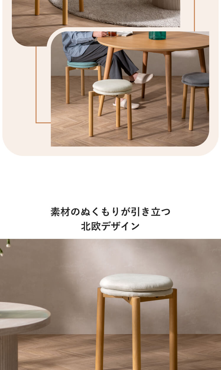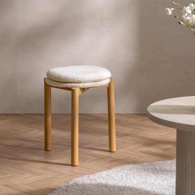北欧デザインのクッションスツール Mellow〔メロウ〕ファブリックタイプ/やわらかな北欧テイストで仕上げた、暮らしに自然と馴染むクッションスツール。天然木の風合いとふかふかの座り心地が魅力です。また、スタッキング仕様で、様々なシーンで活躍。北欧ナチュラルなスツールで素敵な空間作りを。