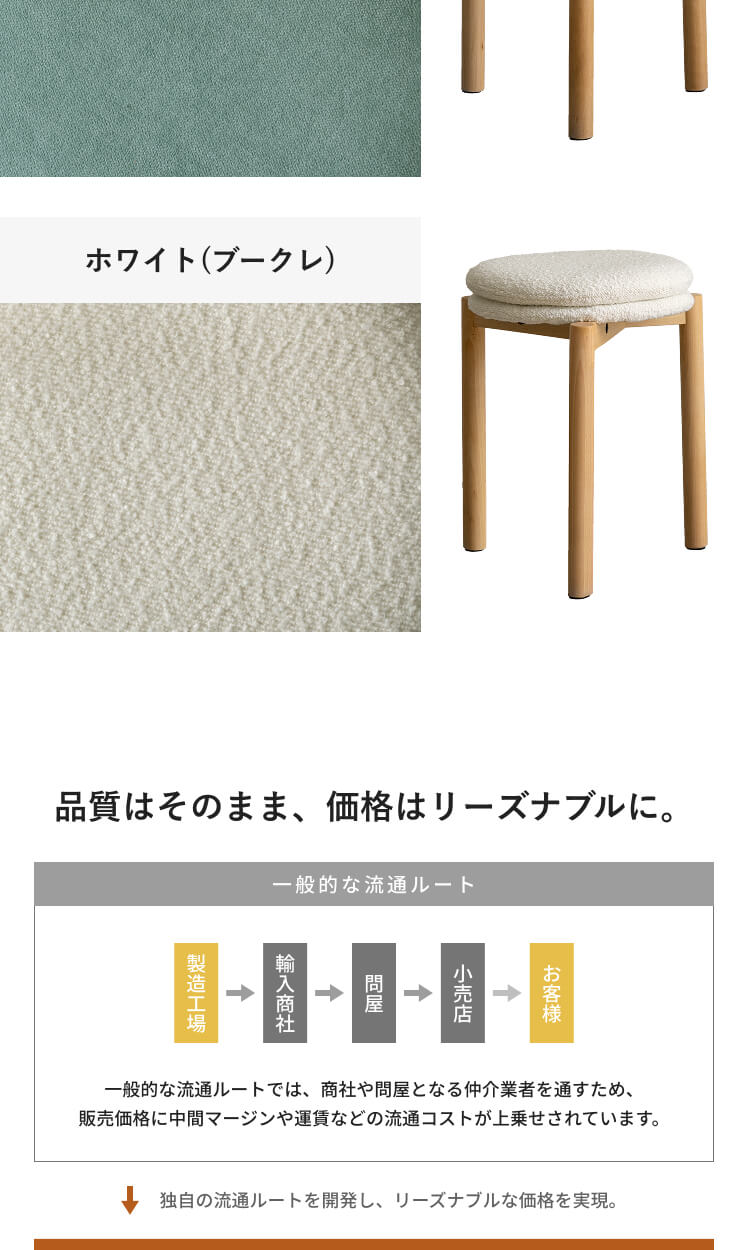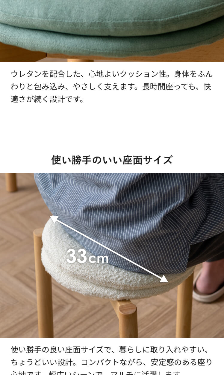 | 材質 | 天然木、クッション材/ウレタンフォーム、張地/ポリエステル |