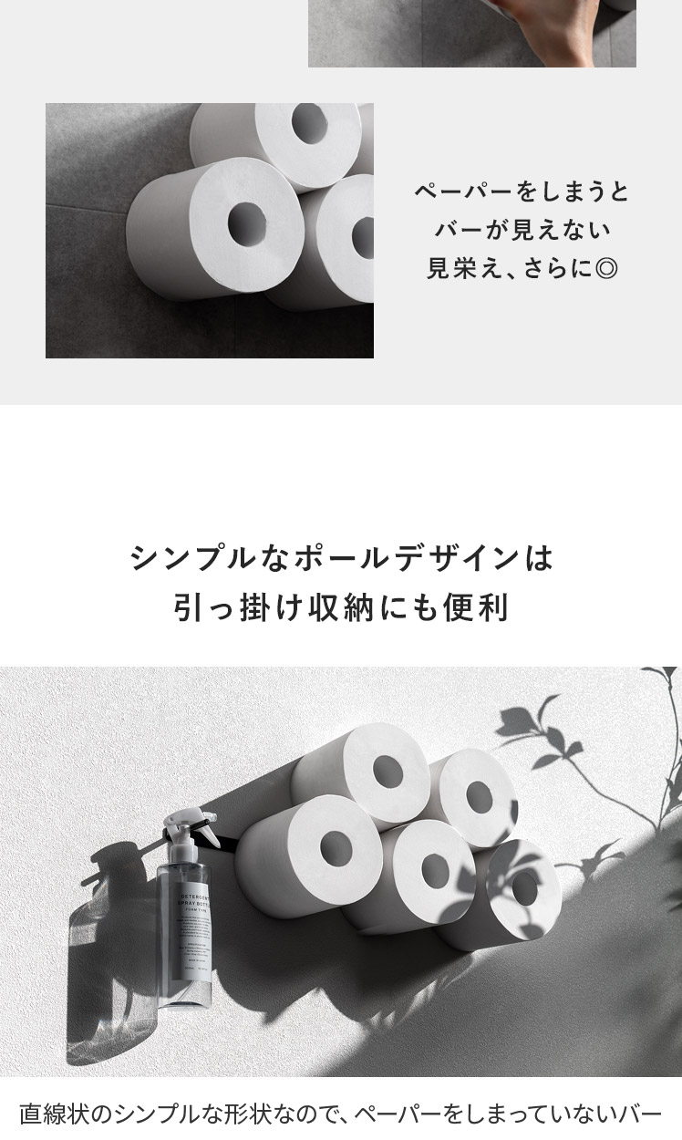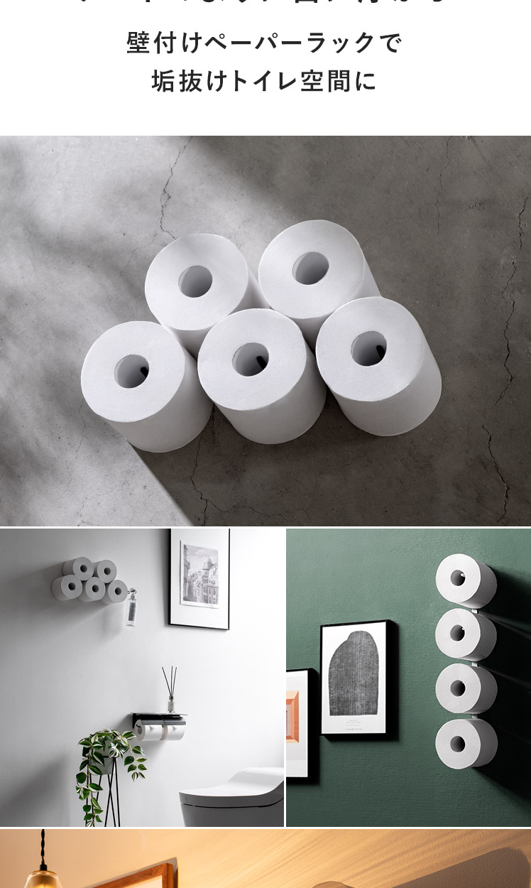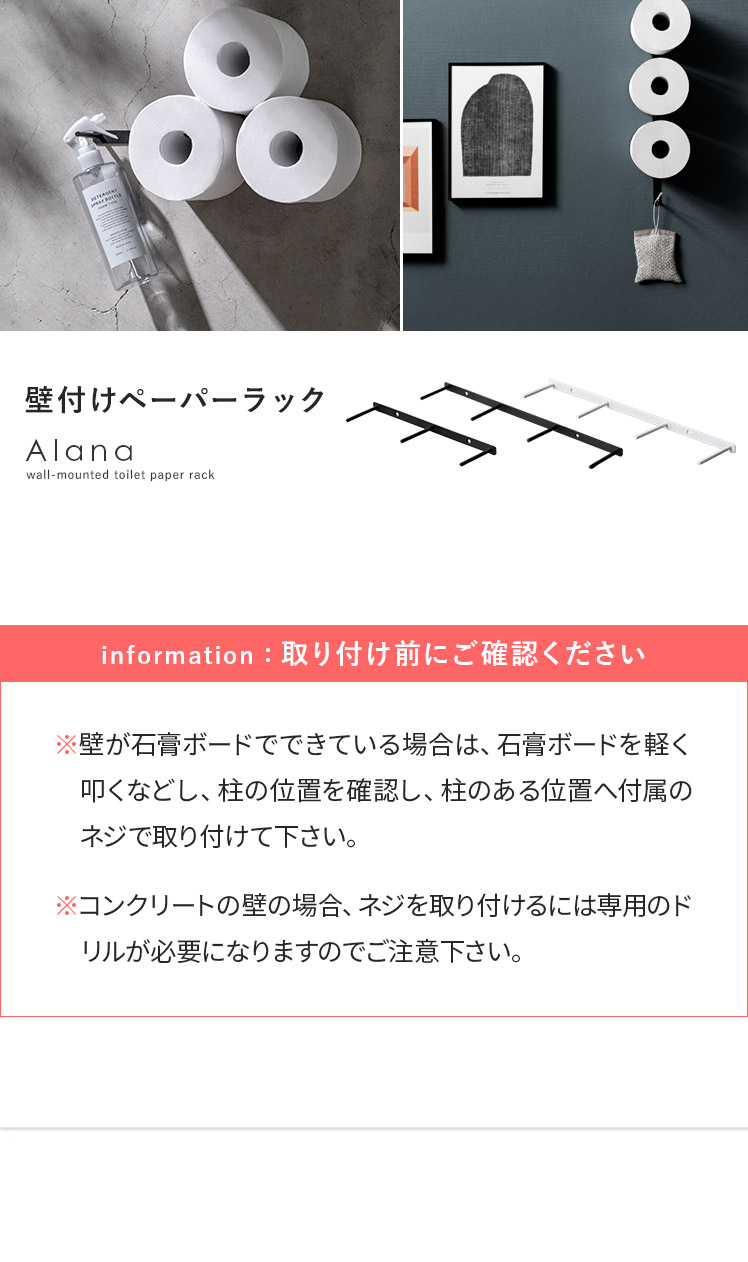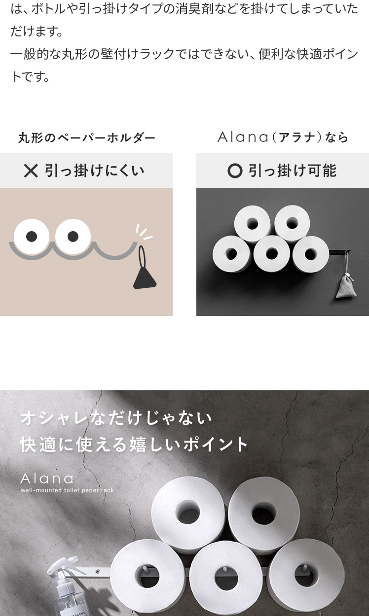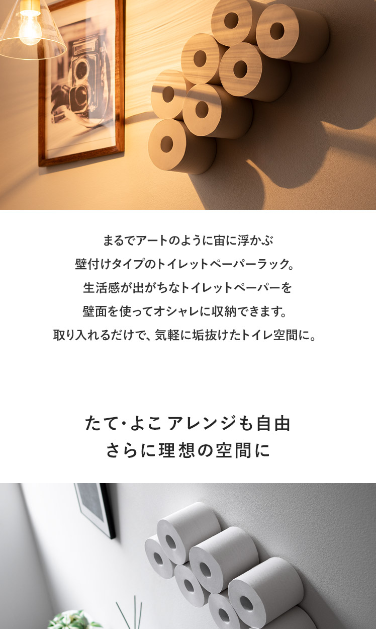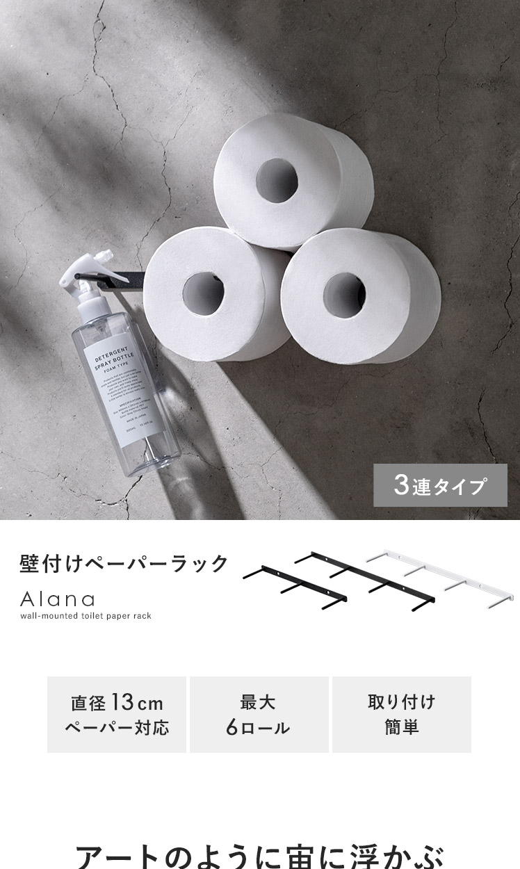 壁付けトイレットペーパーラック Alana〔アラナ〕/まるでアートのように宙に浮かぶ壁付けタイプのトイレットペーパーラック。生活感が出がちなトイレットペーパーを壁面を使ってオシャレに収納できます。取り入れるだけで、気軽に垢抜けたトイレ空間に。