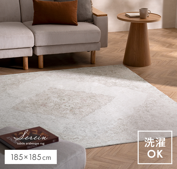 アラベスク模様のヴィンテージ風ラグ Serein〔スラン〕185×185/繊細なアラベスク模様が描く、やわらかなヴィンテージ感。空間にしっとりとなじむヴィンテージ風ラグ“Serein(スラン)”。ご自宅で丸洗いできるので、気負わず心地よくお使いただけます。