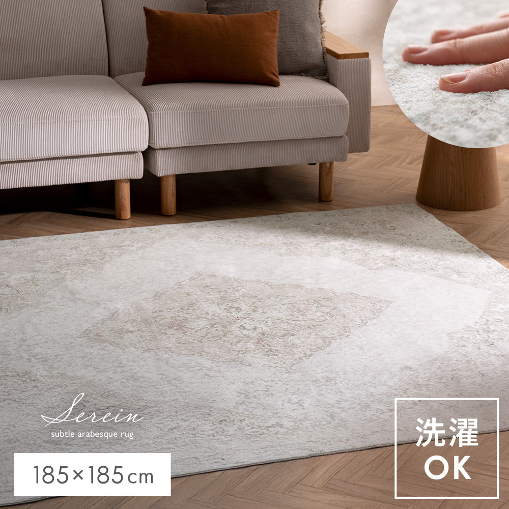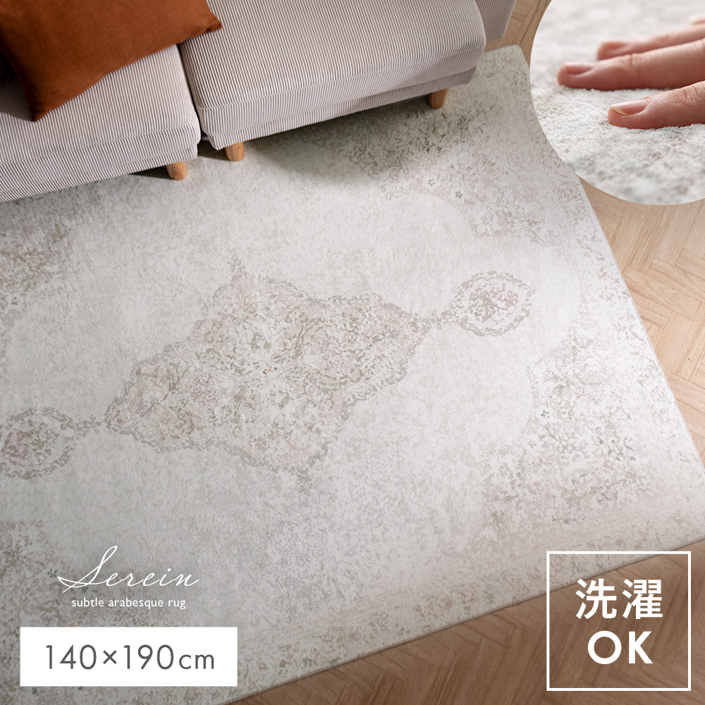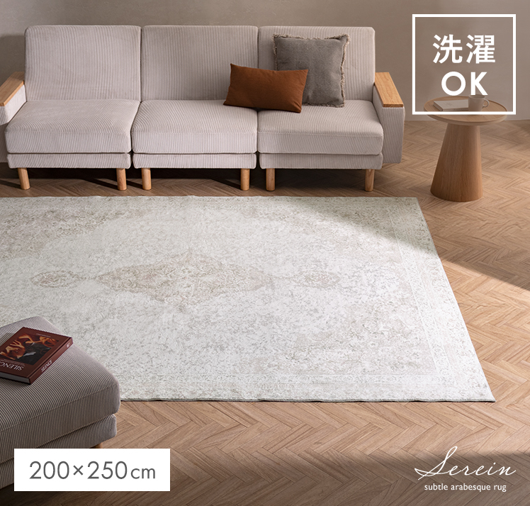 アラベスク模様のヴィンテージ風ラグ Serein〔スラン〕200×250/繊細なアラベスク模様が描く、やわらかなヴィンテージ感。空間にしっとりとなじむヴィンテージ風ラグ“Serein(スラン)”。ご自宅で丸洗いできるので、気負わず心地よくお使いただけます。