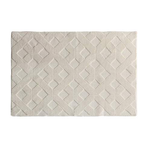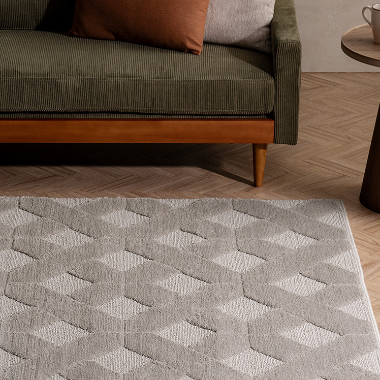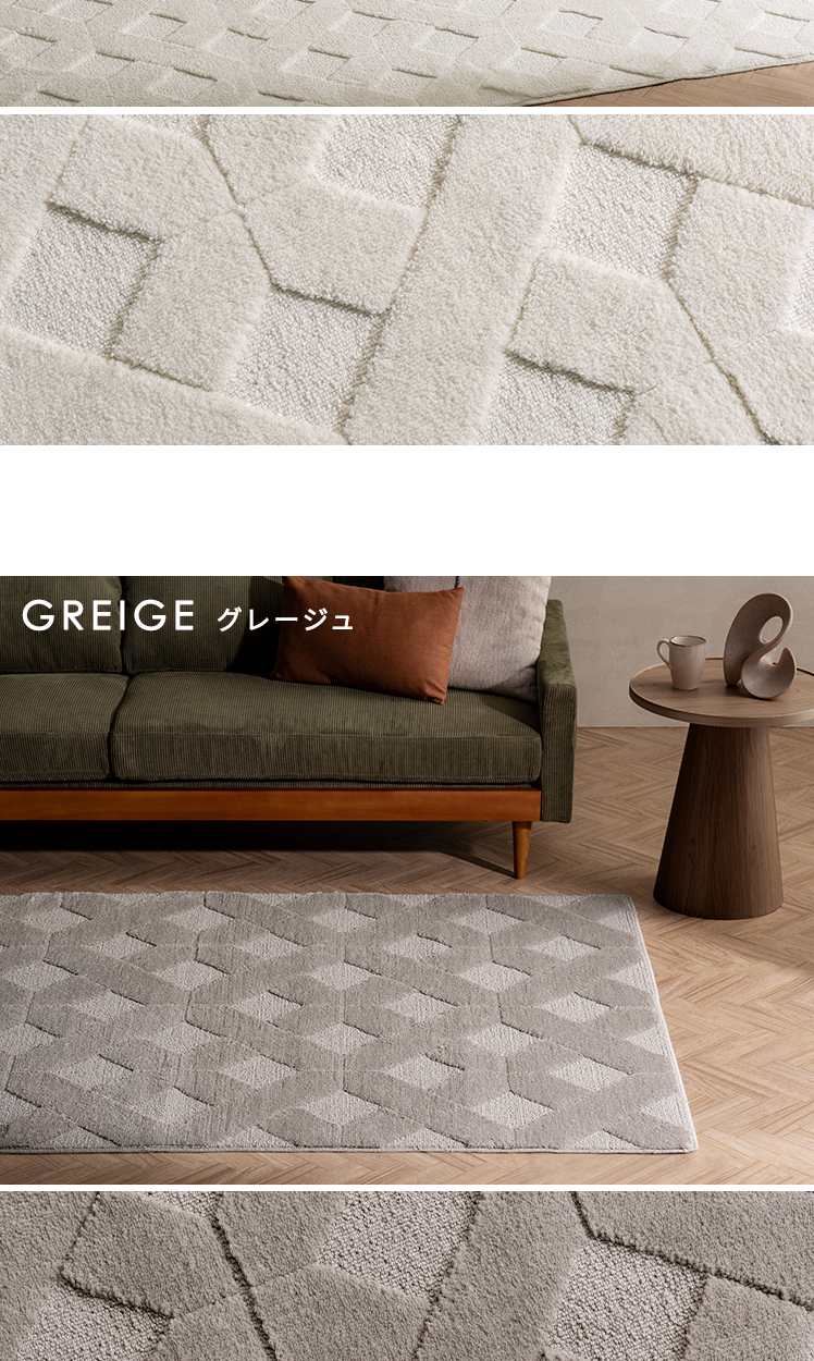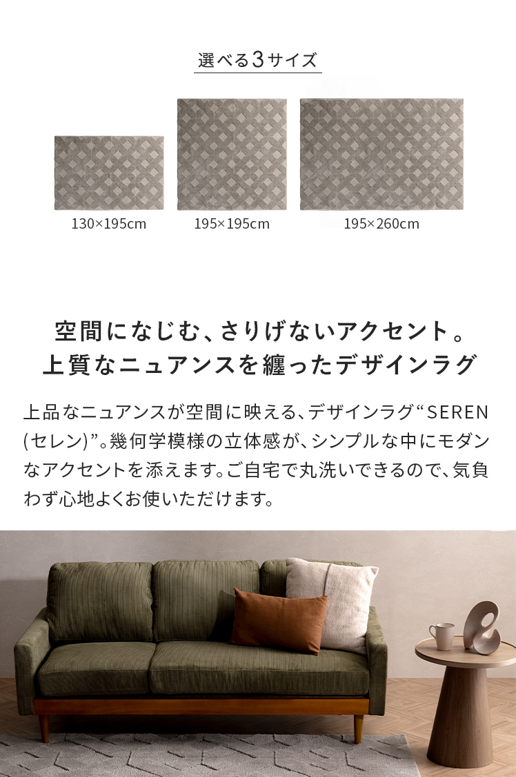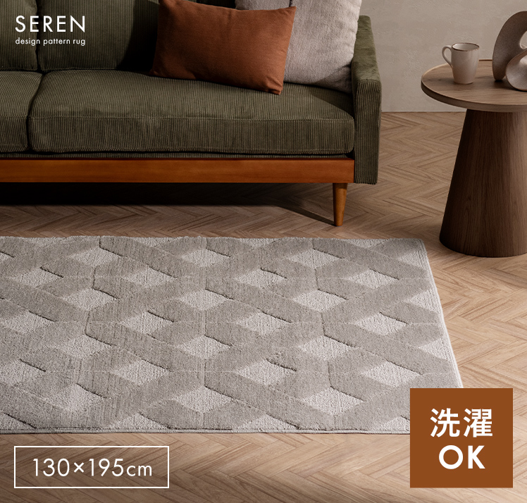 デザインパターンラグ SEREN〔セレン〕 130×195/上品なニュアンスが空間に映える、デザインラグ“SEREN(セレン)”。幾何学模様の立体感が、シンプルな中にモダンなアクセントを添えます。ご自宅で丸洗いできるので、気負わず心地よくお使いただけます。