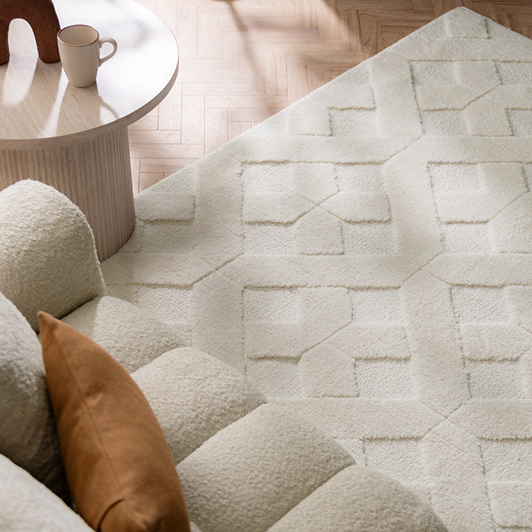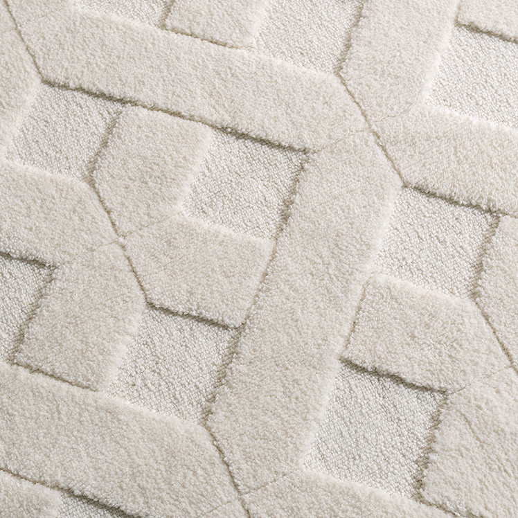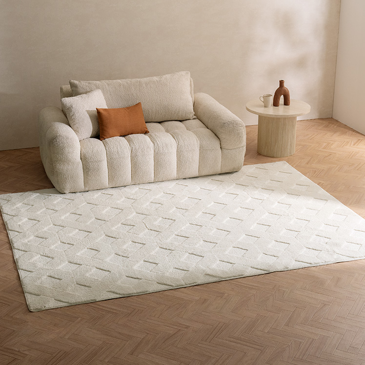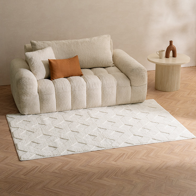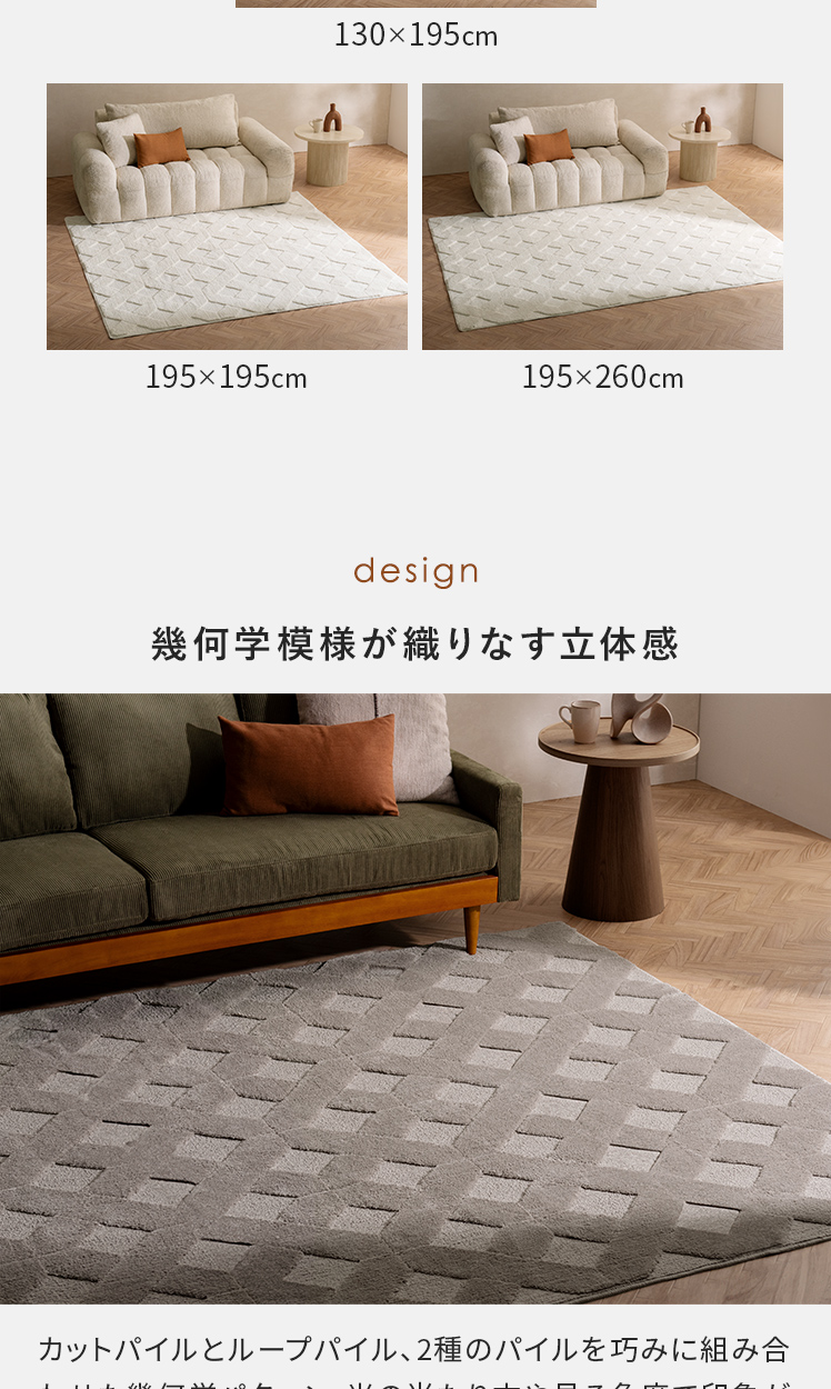 デザインパターンラグ SEREN〔セレン〕 130×195/上品なニュアンスが空間に映える、デザインラグ“SEREN(セレン)”。幾何学模様の立体感が、シンプルな中にモダンなアクセントを添えます。ご自宅で丸洗いできるので、気負わず心地よくお使いただけます。
