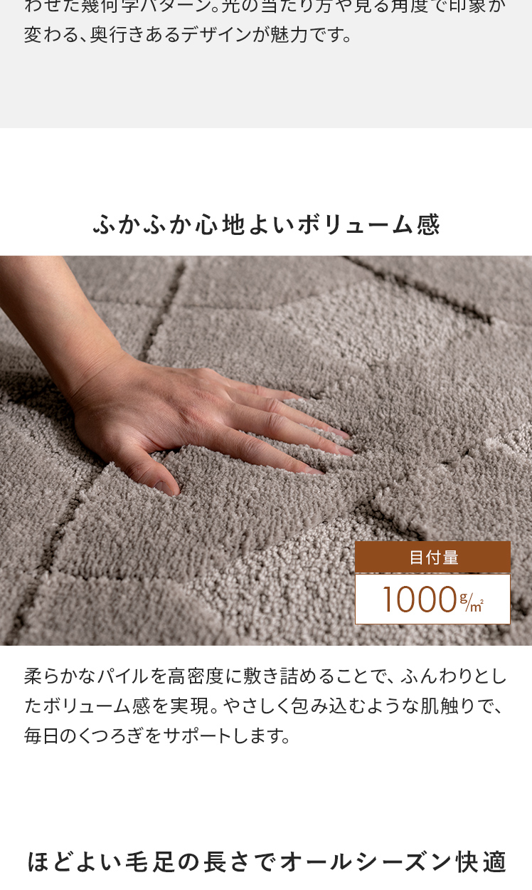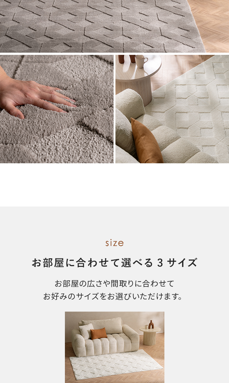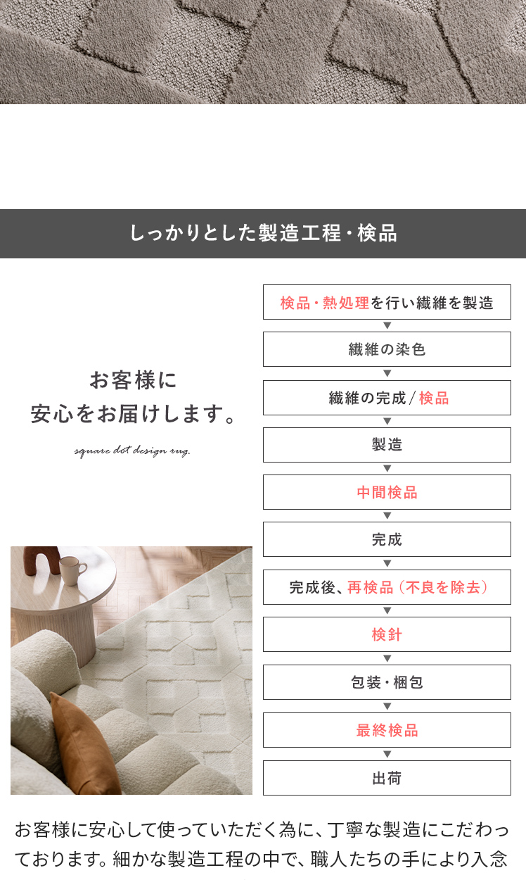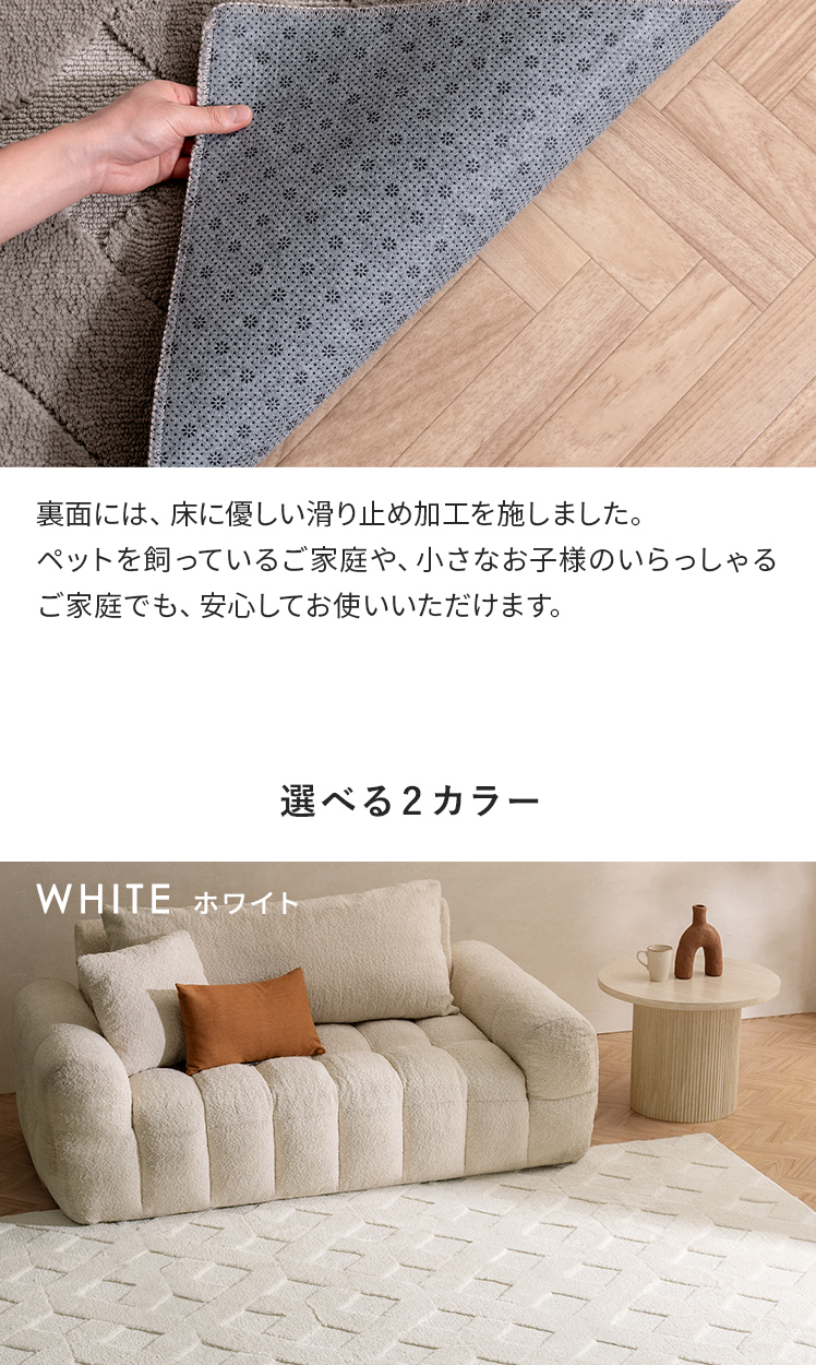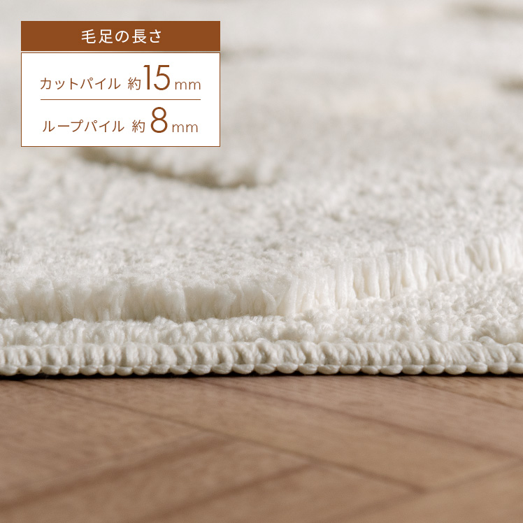 | 備考 | 手洗い可能、滑り止め加工付き、床暖・ホットカーペット対応 ※ケバが付着致しますので、衣類等と一緒に洗わないで単独で洗濯して下さい。 ※洗濯の際はご家庭の洗濯機の容量をお確かめ下さい。 ※洗濯機を使用する際は、手洗いコースで洗濯してください。 ※床暖房によっては、ラグ等敷物の使用が不可の場合がございます。 床暖房の上で使用される際は、ご購入前に床暖房メーカーへご確認をお願いいたします。 |