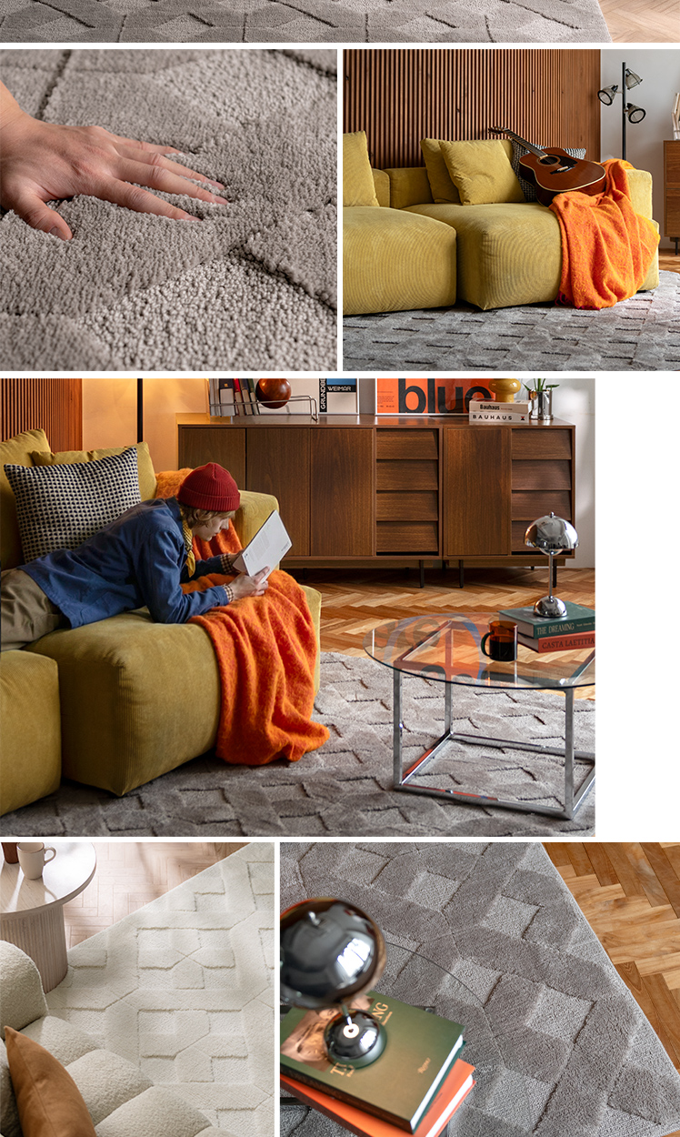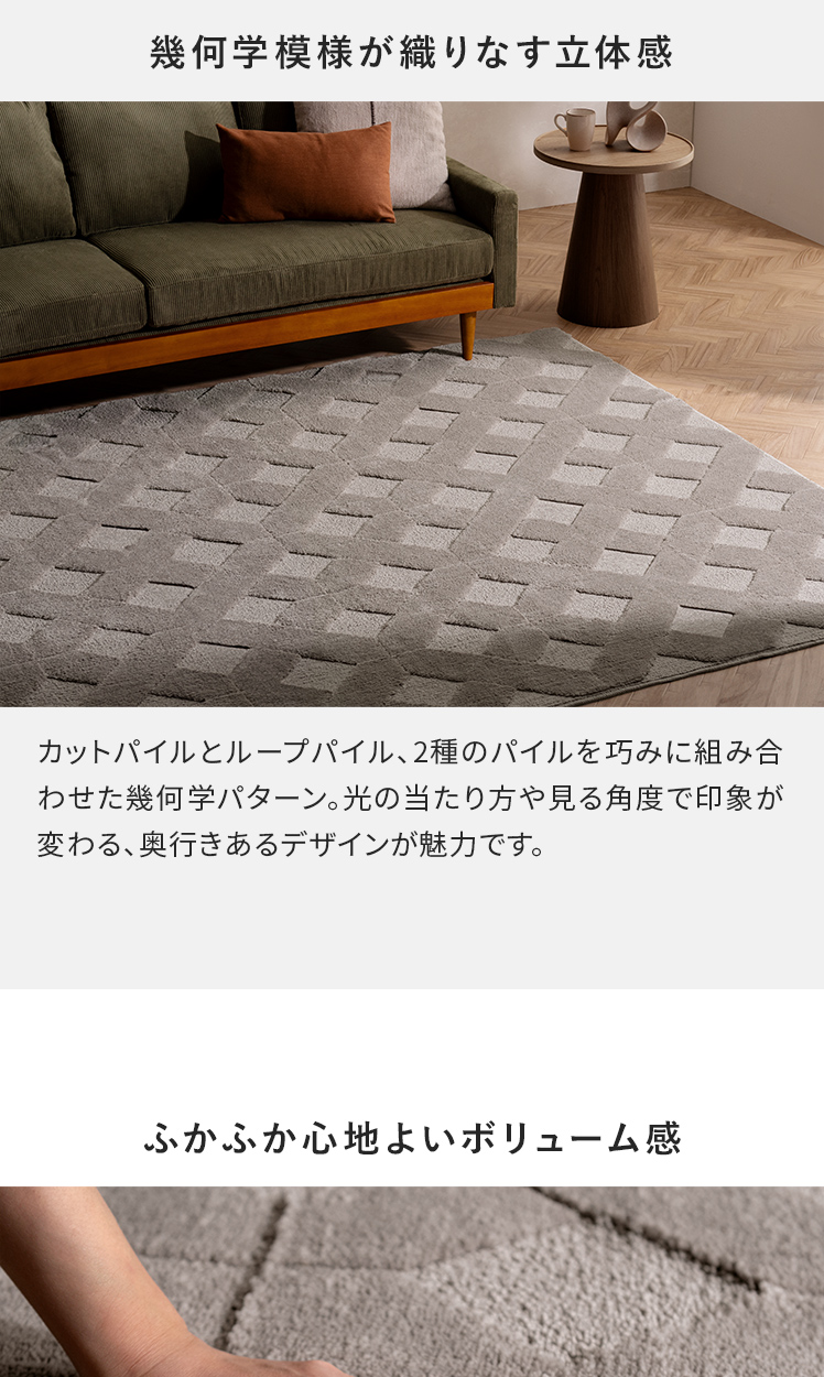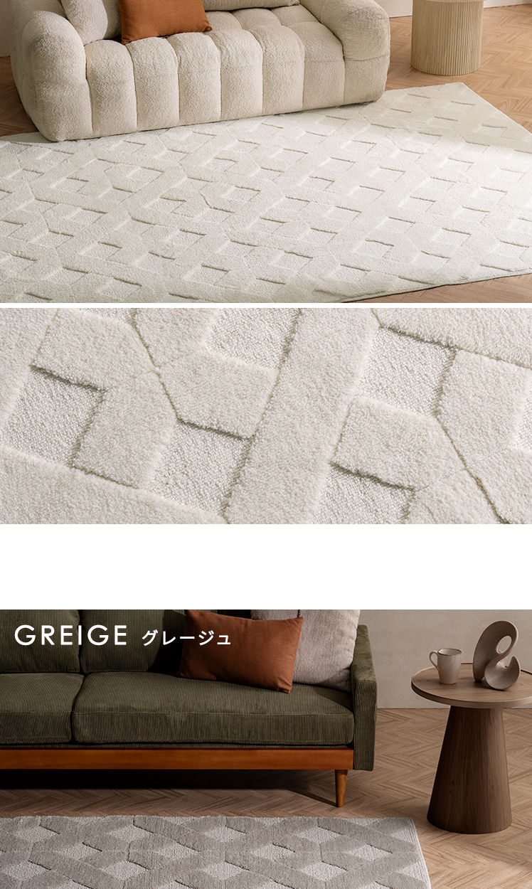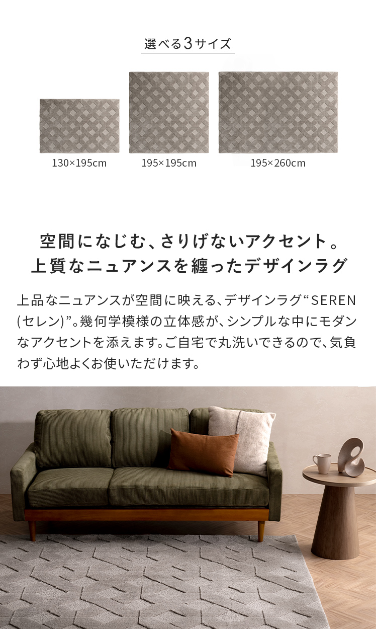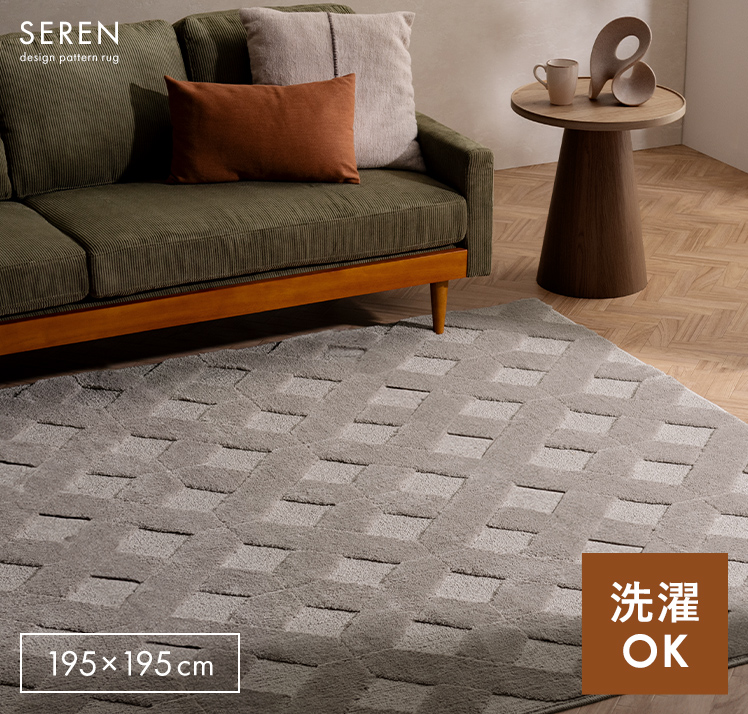 デザインパターンラグ SEREN〔セレン〕 195×195/上品なニュアンスが空間に映える、デザインラグ“SEREN(セレン)”。幾何学模様の立体感が、シンプルな中にモダンなアクセントを添えます。ご自宅で丸洗いできるので、気負わず心地よくお使いただけます。