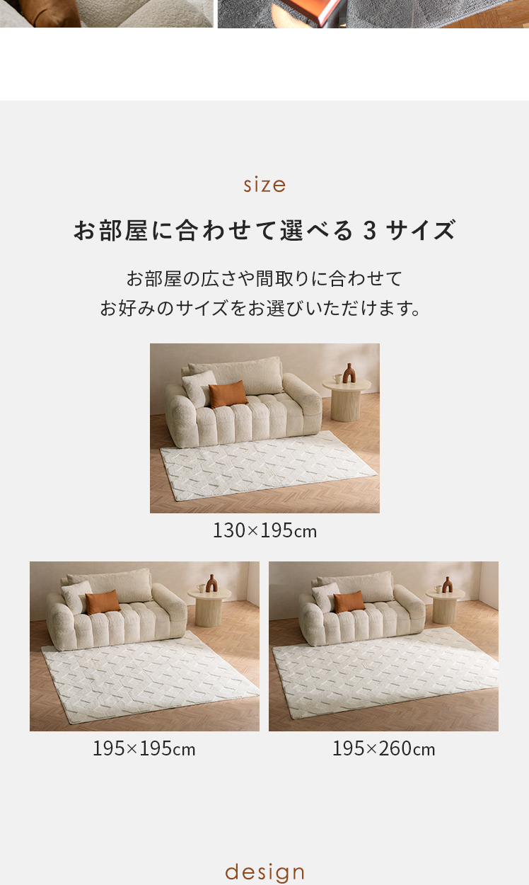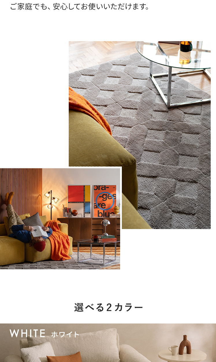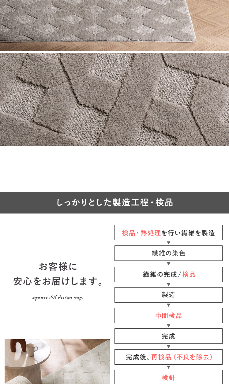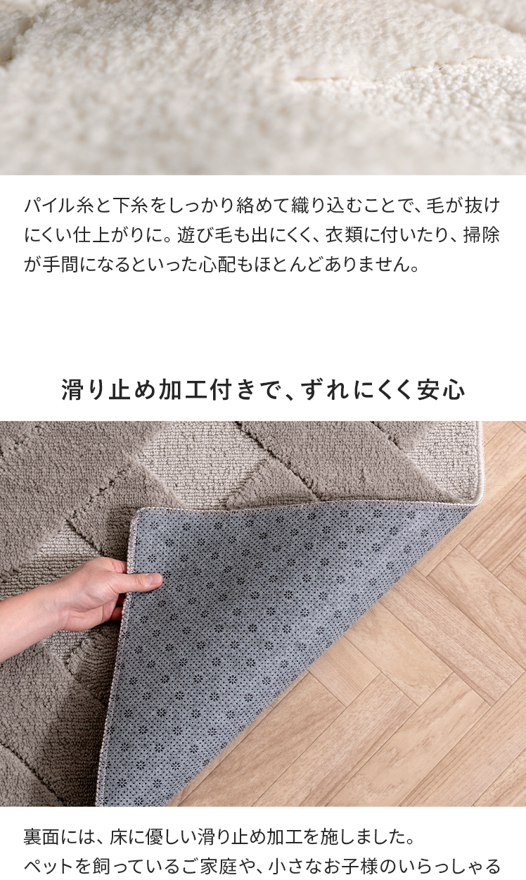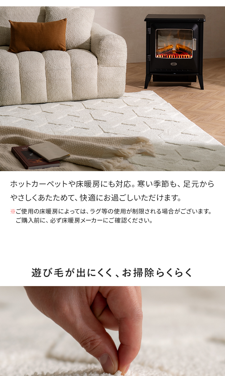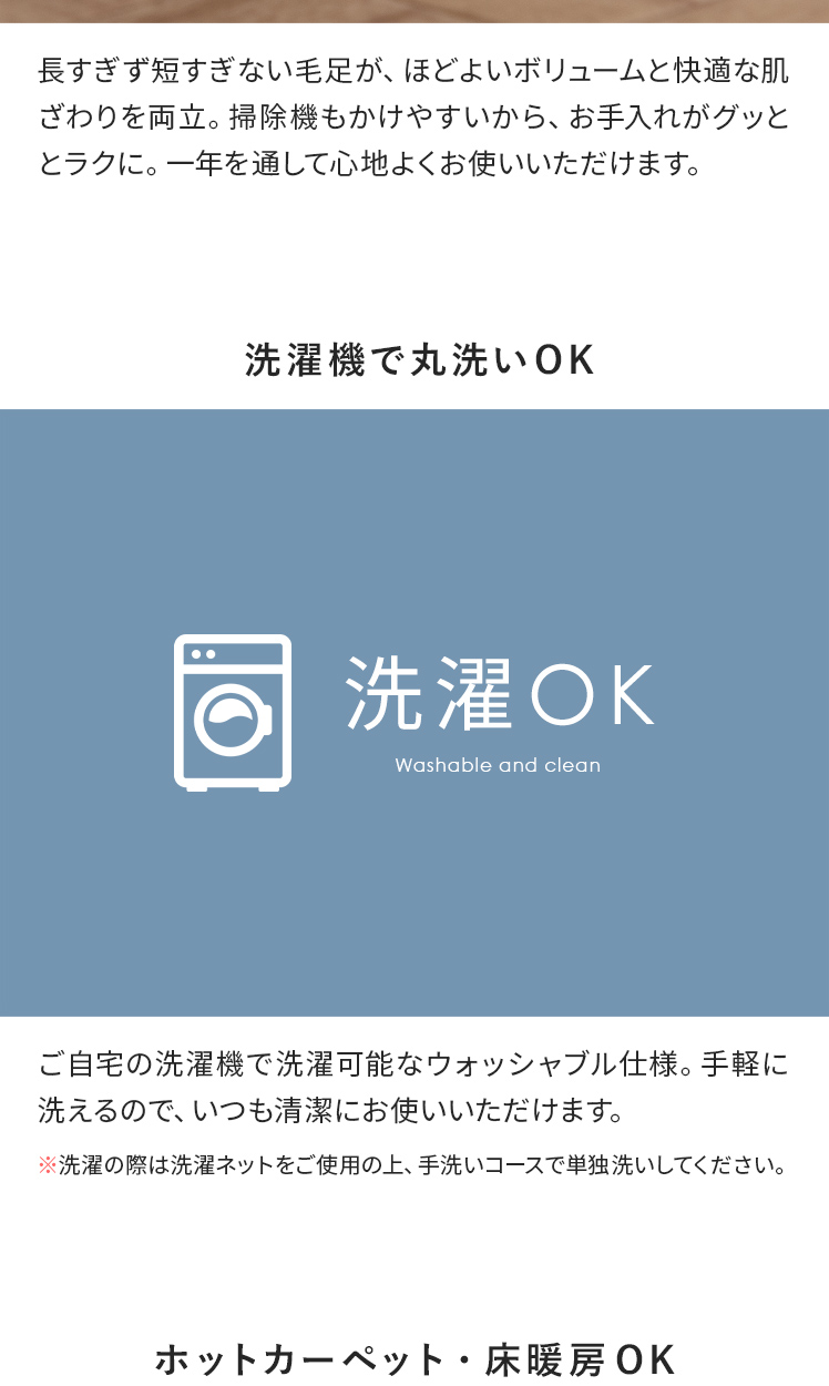 | 備考 | 手洗い可能、滑り止め加工付き、床暖・ホットカーペット対応 ※ケバが付着致しますので、衣類等と一緒に洗わないで単独で洗濯して下さい。 ※洗濯の際はご家庭の洗濯機の容量をお確かめ下さい。 ※洗濯機を使用する際は、手洗いコースで洗濯してください。 ※床暖房によっては、ラグ等敷物の使用が不可の場合がございます。 床暖房の上で使用される際は、ご購入前に床暖房メーカーへご確認をお願いいたします。 |