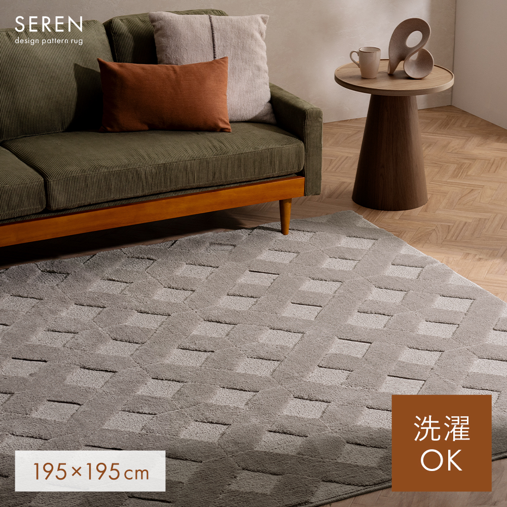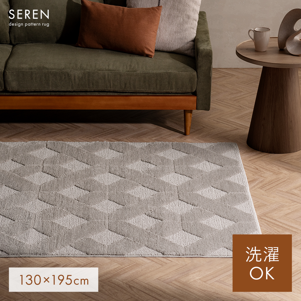 デザインパターンラグ SEREN〔セレン〕 195×260/上品なニュアンスが空間に映える、デザインラグ“SEREN(セレン)”。幾何学模様の立体感が、シンプルな中にモダンなアクセントを添えます。ご自宅で丸洗いできるので、気負わず心地よくお使いただけます。