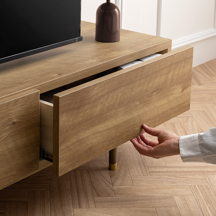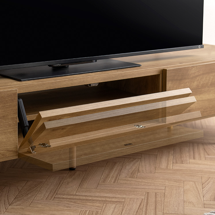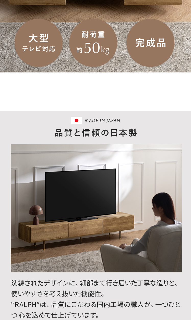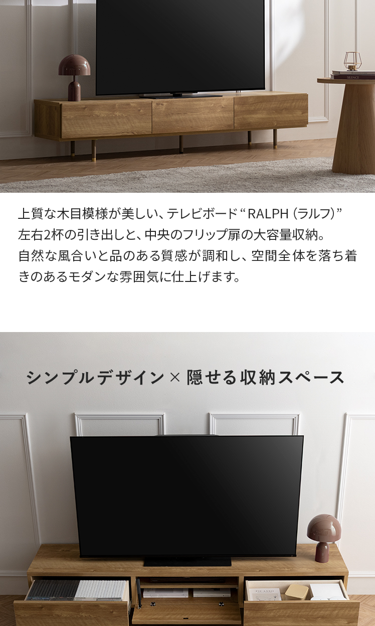 日本製完成品 テレビボード RALPH〔ラルフ〕/上質な木目模様が美しい、テレビボード“RALPH(ラルフ)”左右2杯の引き出しと、中央のフリップ扉の大容量収納。自然な風合いと品のある質感が調和し、空間全体を落ち着きのあるモダンな雰囲気に仕上げます。