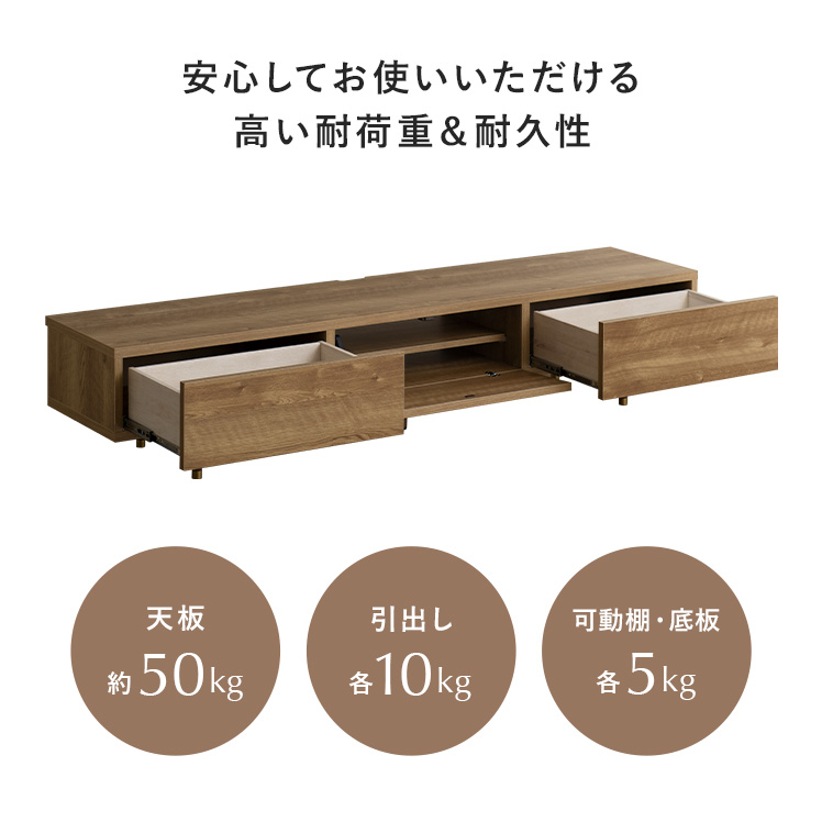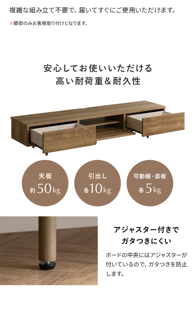 | 耐荷重 | 天板/約50kg、引き出し/各10kg、可動棚・底板/各5kg |