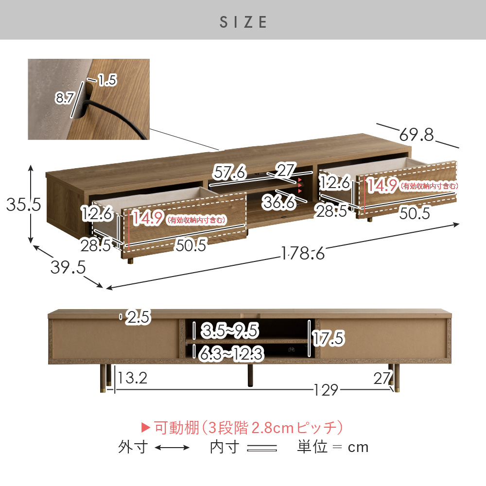 | サイズ | 約幅178.6×奥行き39.5×高さ35.5cm |