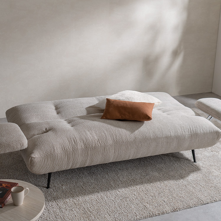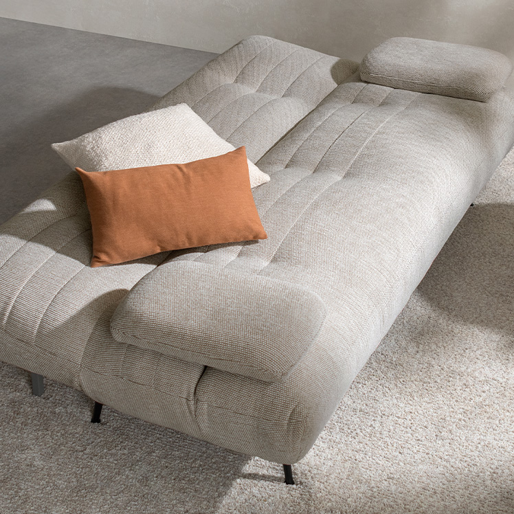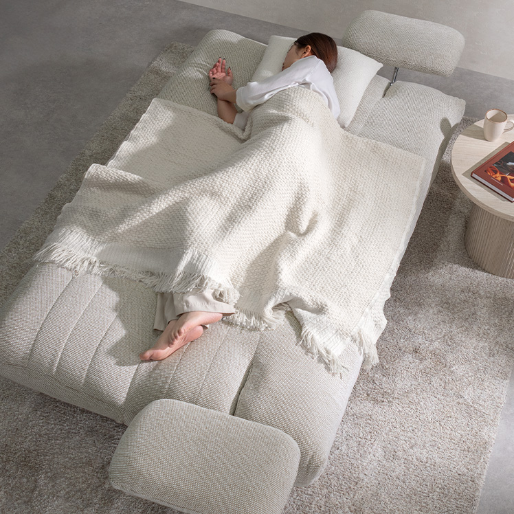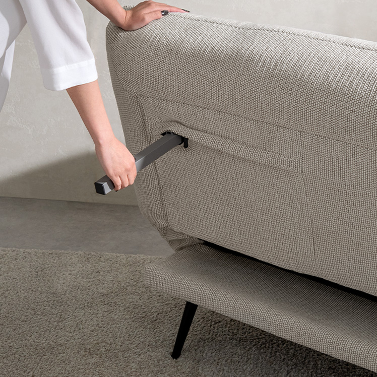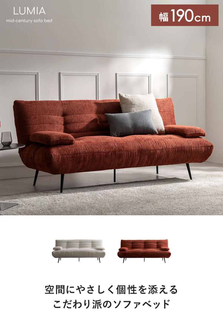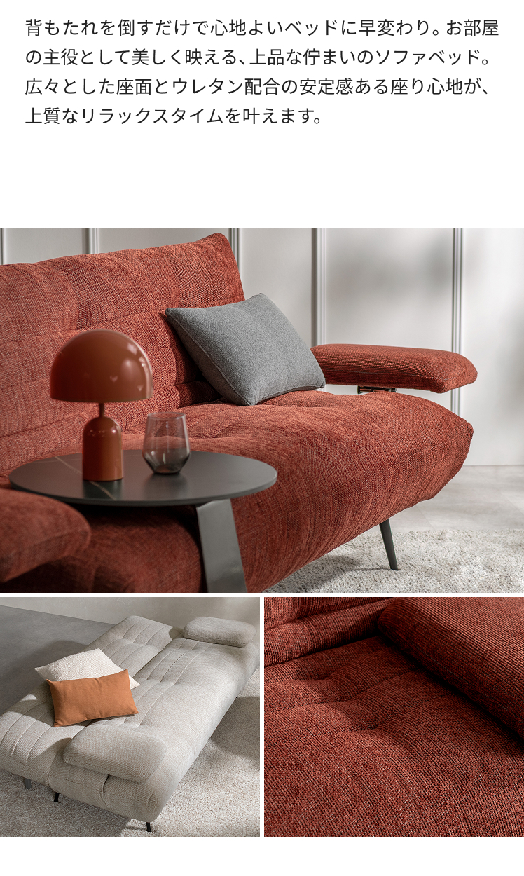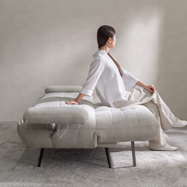 アームが動くソファベッド LUMIA〔ルミア〕/背もたれを倒すだけで心地よいベッドに早変わり。お部屋の主役として美しく映える、上品な佇まいのソファベッド。広々とした座面とポケットコイルの安定感ある座り心地が、上質なリラックスタイムを叶えます。