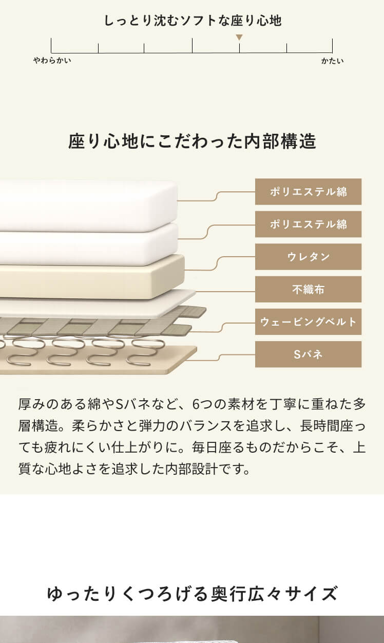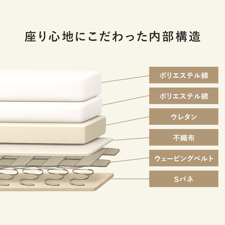 | 材質 | ポリエステル綿、ウレタン、不織布、ウェービングベルト、 Sバネ、スチール(粉体塗装仕上げ) |