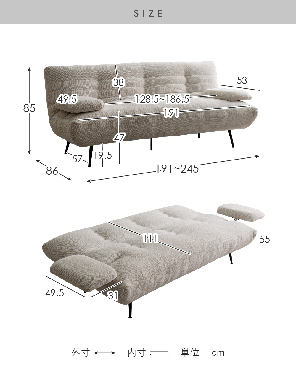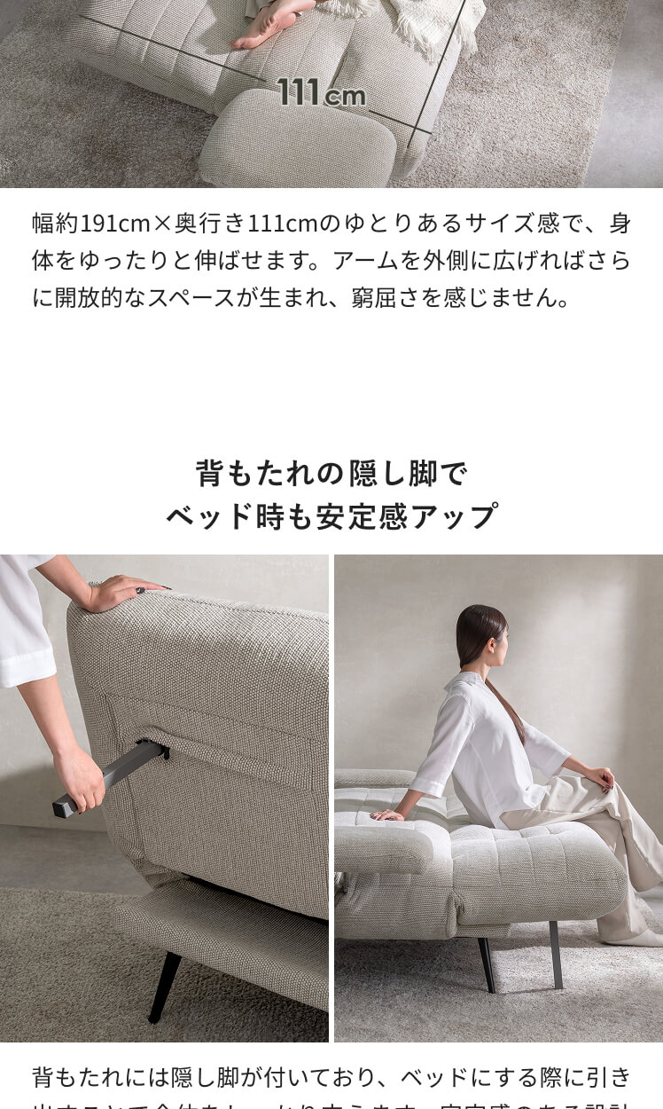 | サイズ | ソファ/約幅191〜245×奥行き86×高さ85cm ベッド/約幅191〜245×奥行き111×高さ47cm |