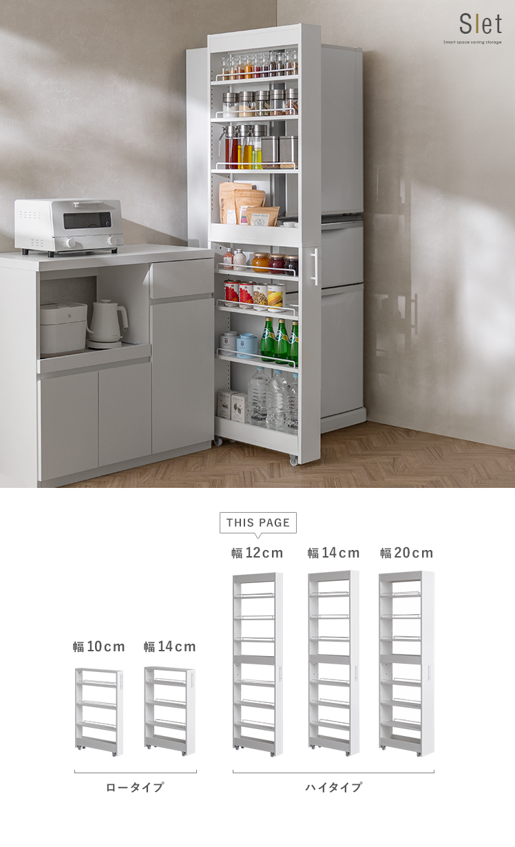 スペースを賢く使う隙間ワゴン Slet〔スレット〕12cm幅ハイタイプ/お部屋の隙間を賢く使う、隙間ワゴン“Slet(スレット)”使われていなかったデッドスペースを収納スペースとして活用。スリムな佇まいながら、しっかり収まる大容量収納です。全5サイズ展開で、隙間に合わせてお選びいただけます。
