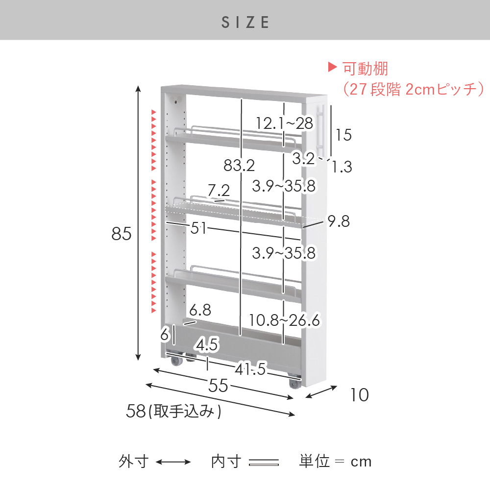 | サイズ | 約幅10×奥行き55(取手込み58)×高さ85cm |