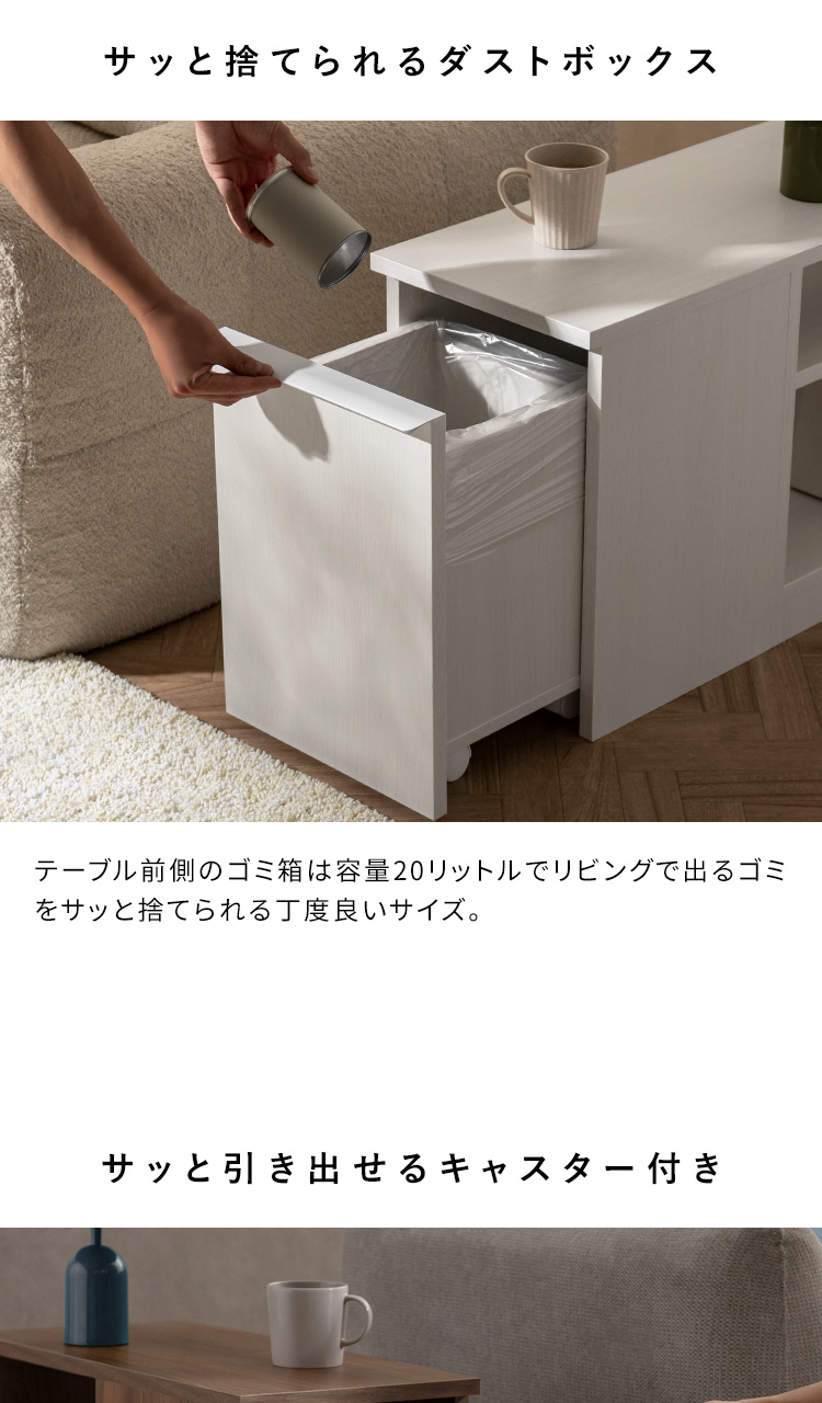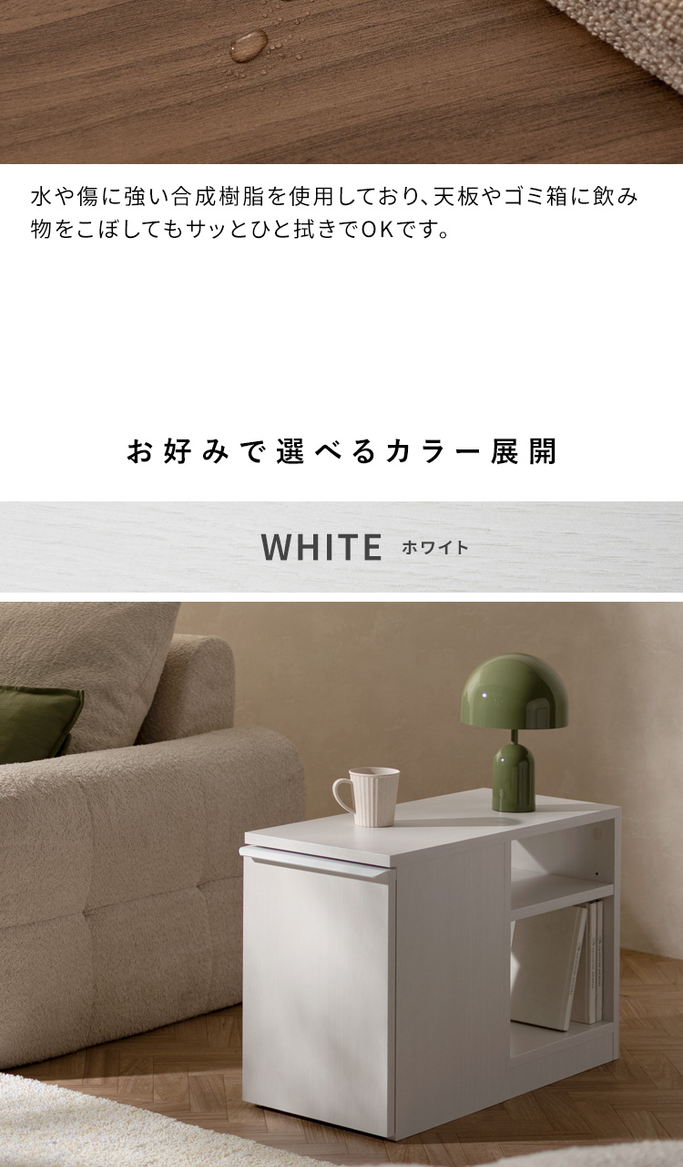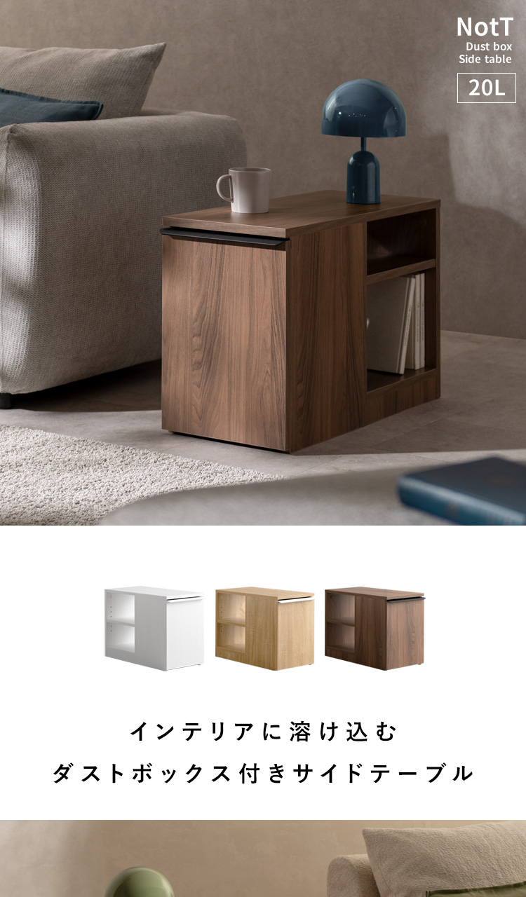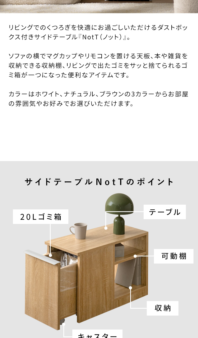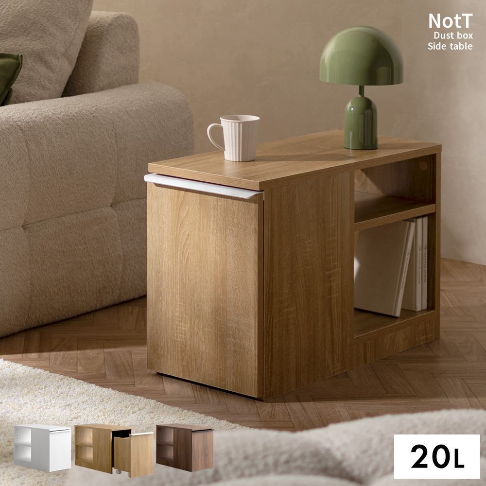 ダストボックス付きサイドテーブル NotT〔ノット〕/リビングでのくつろぎを快適にお過ごしいただけるダストボックス付きサイドテーブル『NotT(ノット)』。ソファの横でマグカップやリモコンを置ける天板、本や雑貨を収納できる収納棚、リビングで出たゴミをサッと捨てられるゴミ箱が一つになった便利なアイテムです。カラーはホワイト、ナチュラル、ブラウンの3カラーからお部屋の雰囲気やお好みでお選びいただけます。
