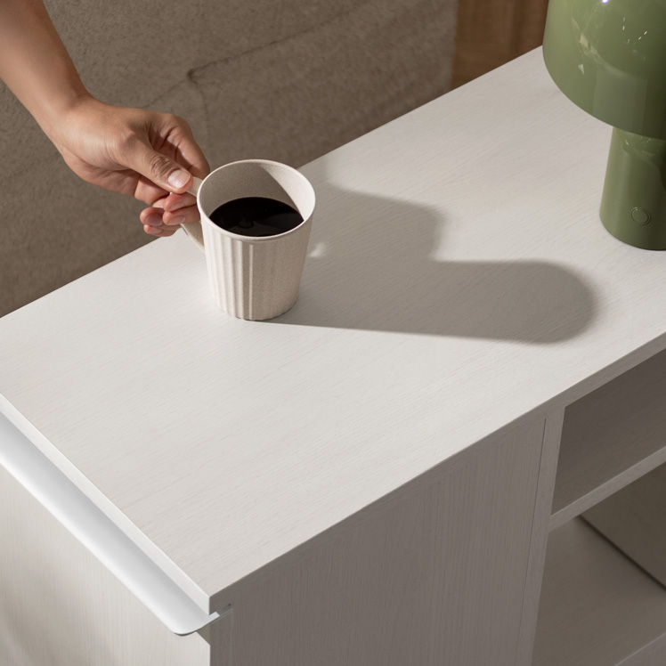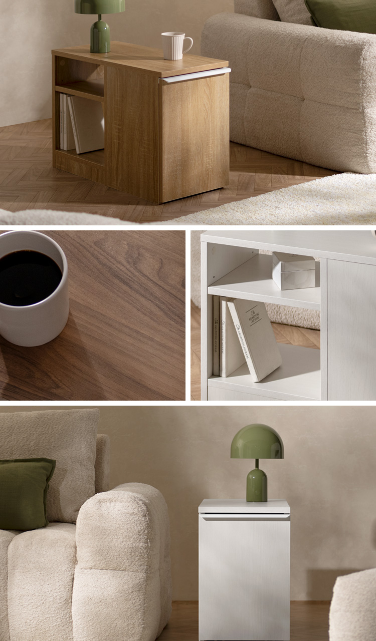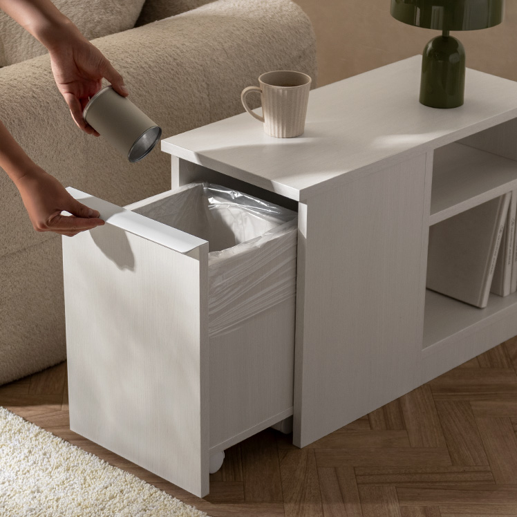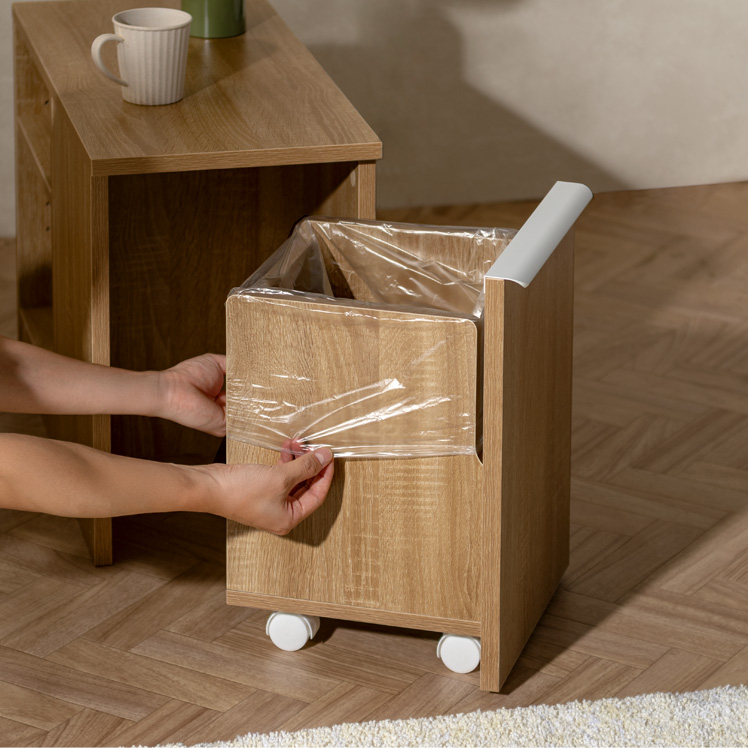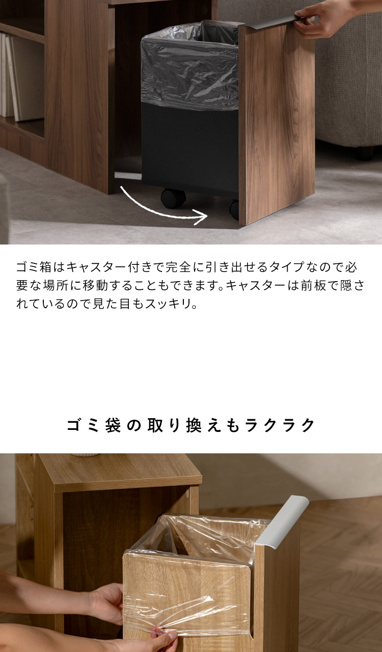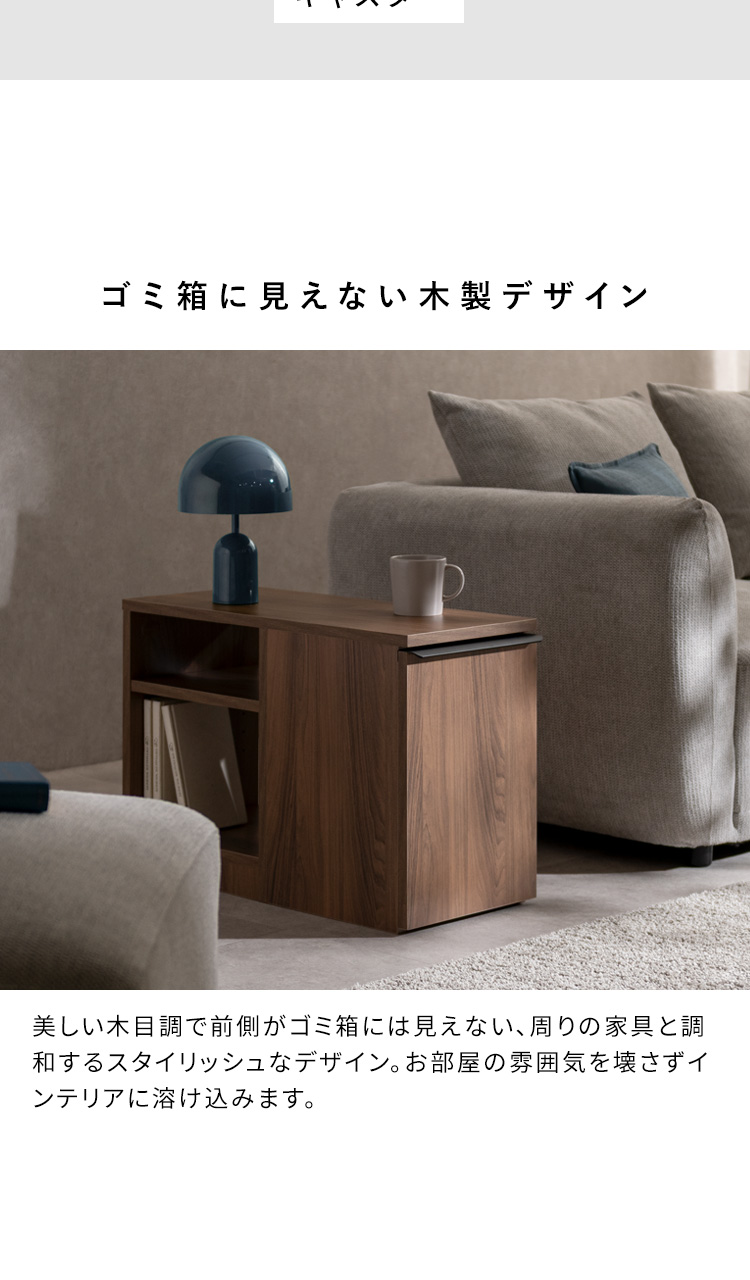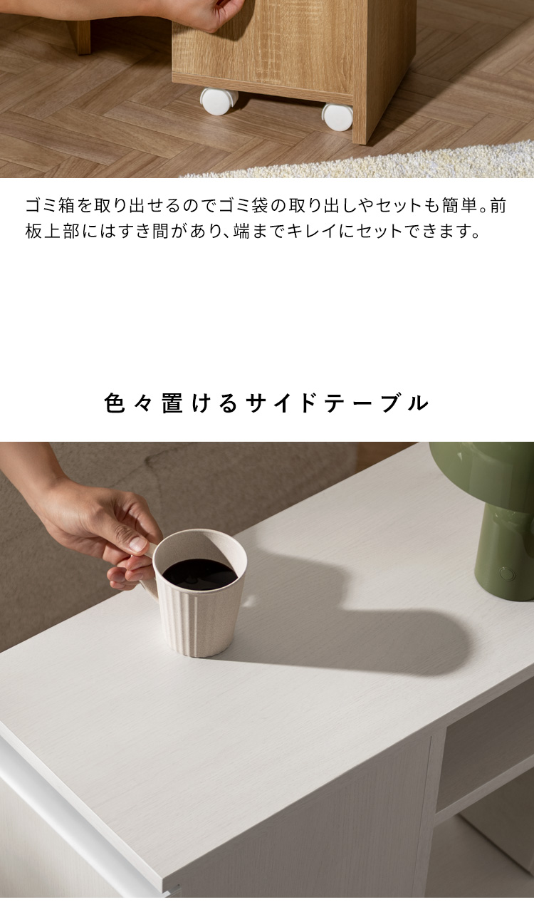 ダストボックス付きサイドテーブル NotT〔ノット〕/リビングでのくつろぎを快適にお過ごしいただけるダストボックス付きサイドテーブル『NotT(ノット)』。ソファの横でマグカップやリモコンを置ける天板、本や雑貨を収納できる収納棚、リビングで出たゴミをサッと捨てられるゴミ箱が一つになった便利なアイテムです。カラーはホワイト、ナチュラル、ブラウンの3カラーからお部屋の雰囲気やお好みでお選びいただけます。