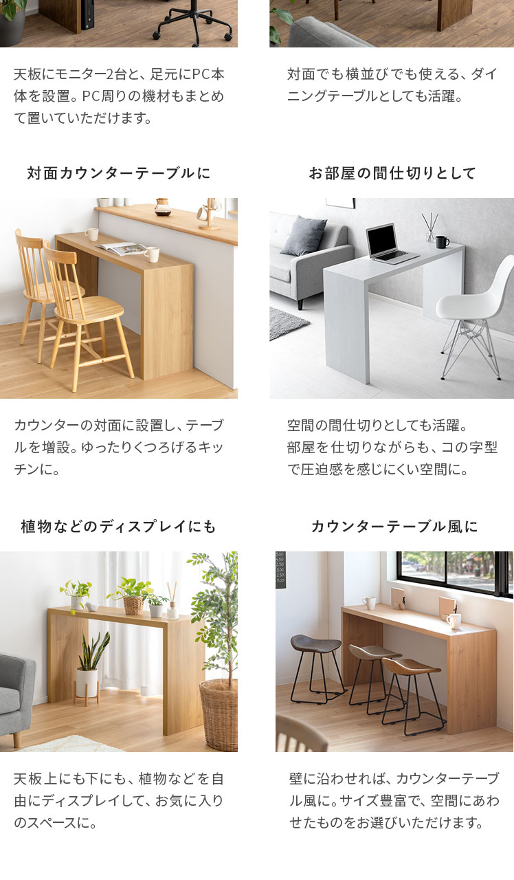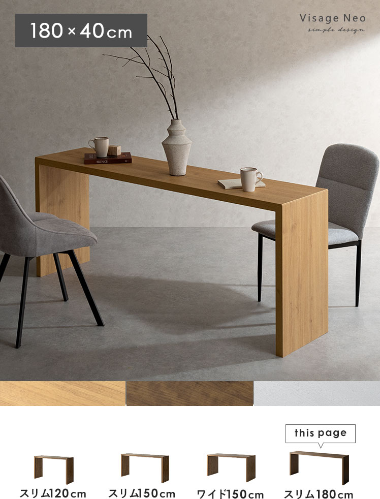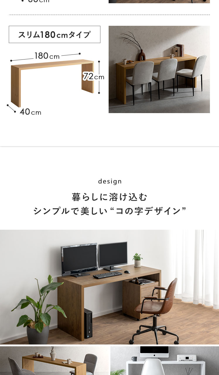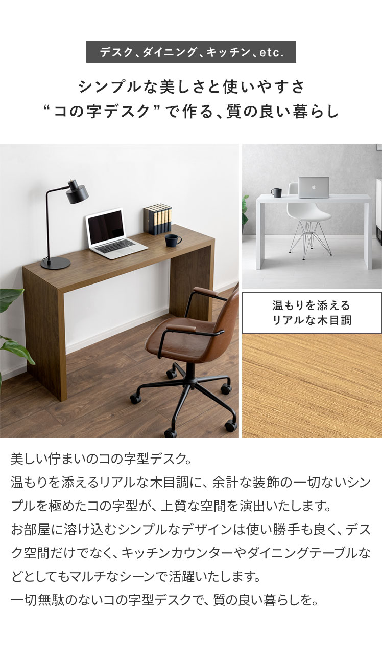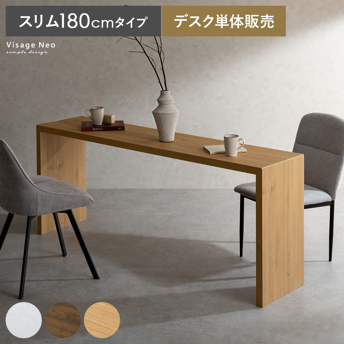 コの字型デスクVisage Neo〔ヴィサージュネオ〕スリム180cmタイプ/美しい佇まいのコの字型デスク。温もりを添えるリアルな木目調に、余計な装飾の一切ないシンプルを極めたコの字型が、上質な空間を演出いたします。お部屋に溶け込むシンプルなデザインは使い勝手も良く、デスク空間だけでなく、キッチンカウンターやダイニングテーブルなどとしてもマルチなシーンで活躍いたします。一切無駄のないコの字型デスクで、質の良い暮らしを。