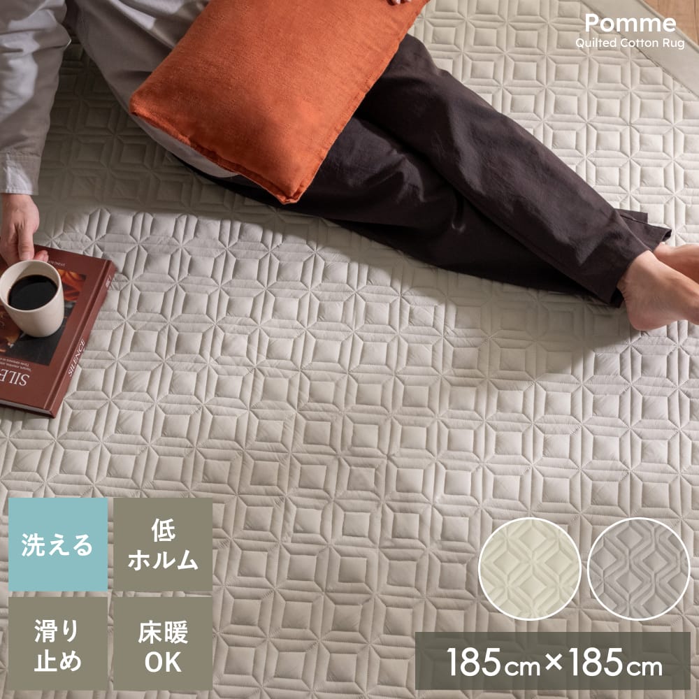 イブル風キルトラグ Pomme〔ポム〕185×185cm/コットン100%の赤ちゃんにもやさしいイブル風ラグ。素肌に触れても気持ちよく、毎日使いたくなる肌触り。シンプルなキルティングはリビングにも馴染み、遊び時間からお昼寝まで寄り添います。
